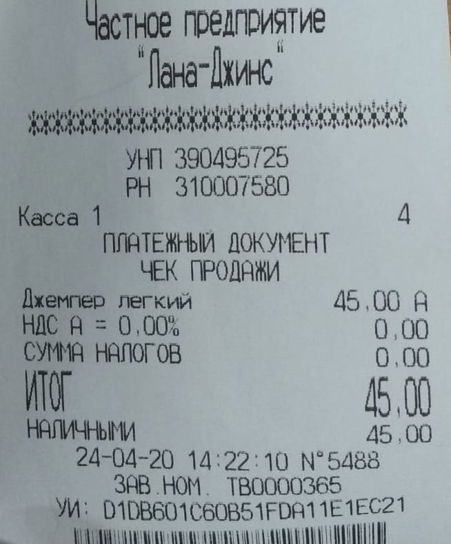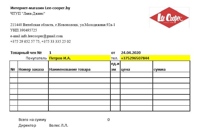 1. В случае оплаты наличными, нашем магазине по адресу ТЦ "Замок", 3 этаж, "Lee Cooper", г.Минск, пр-т Победителей, 65-2 - кассовый чек.