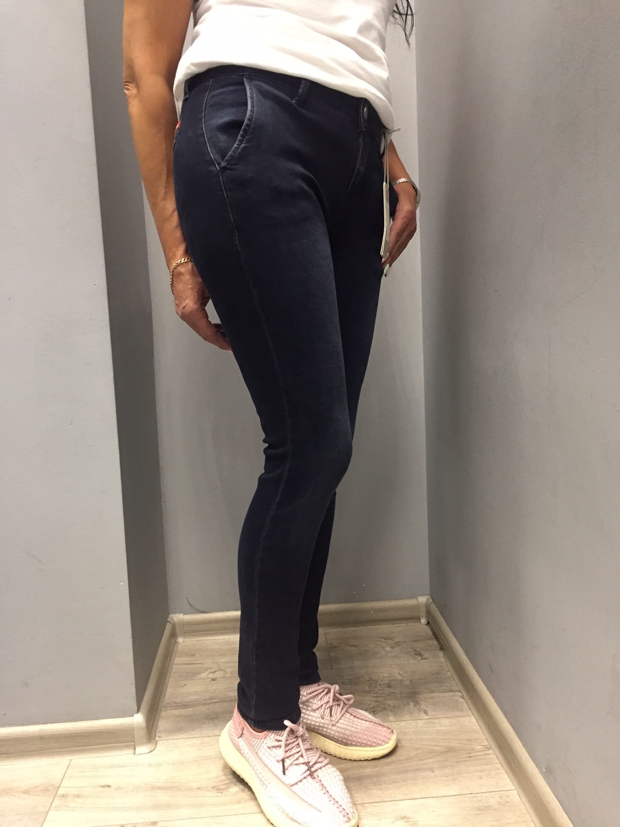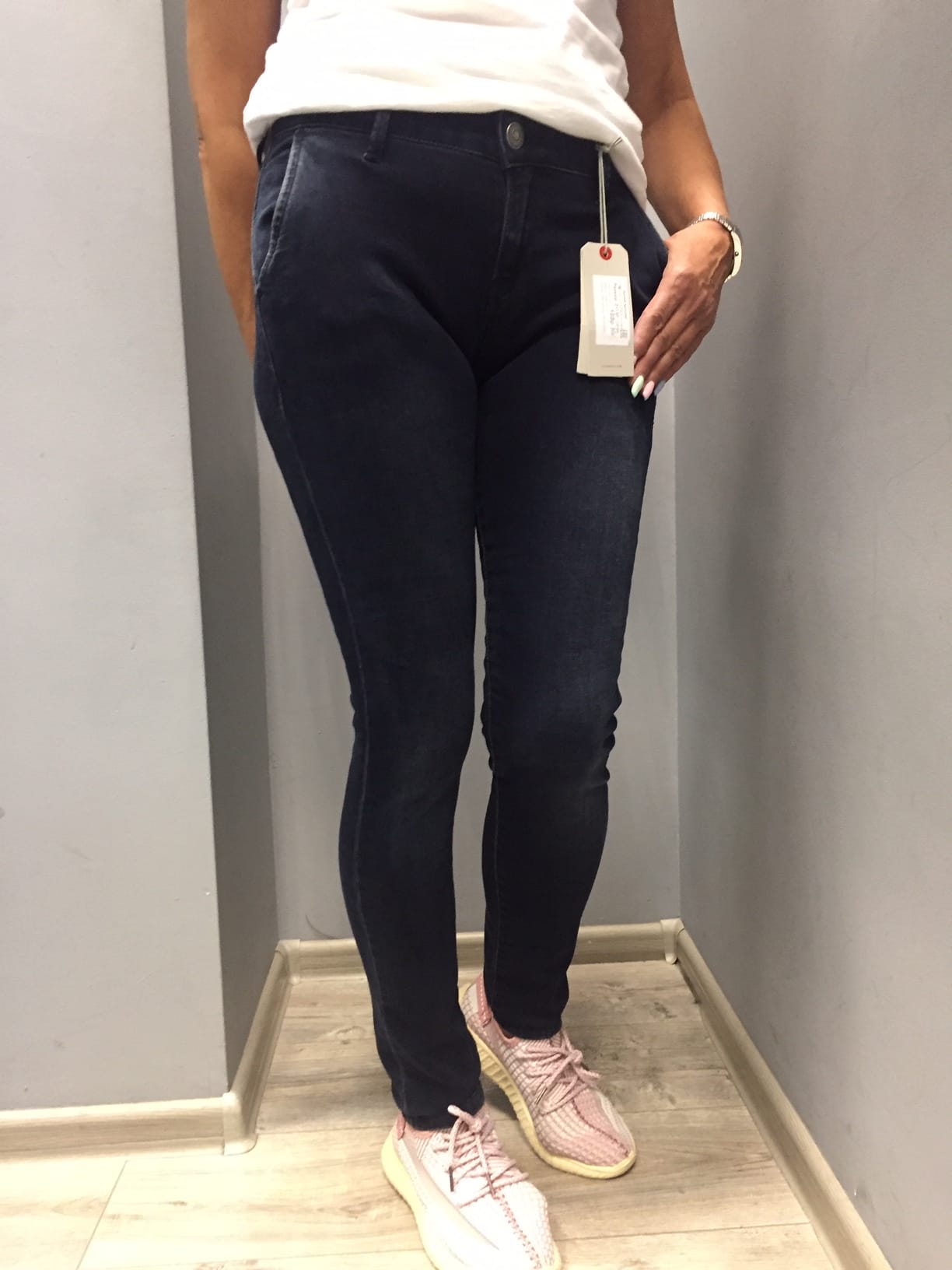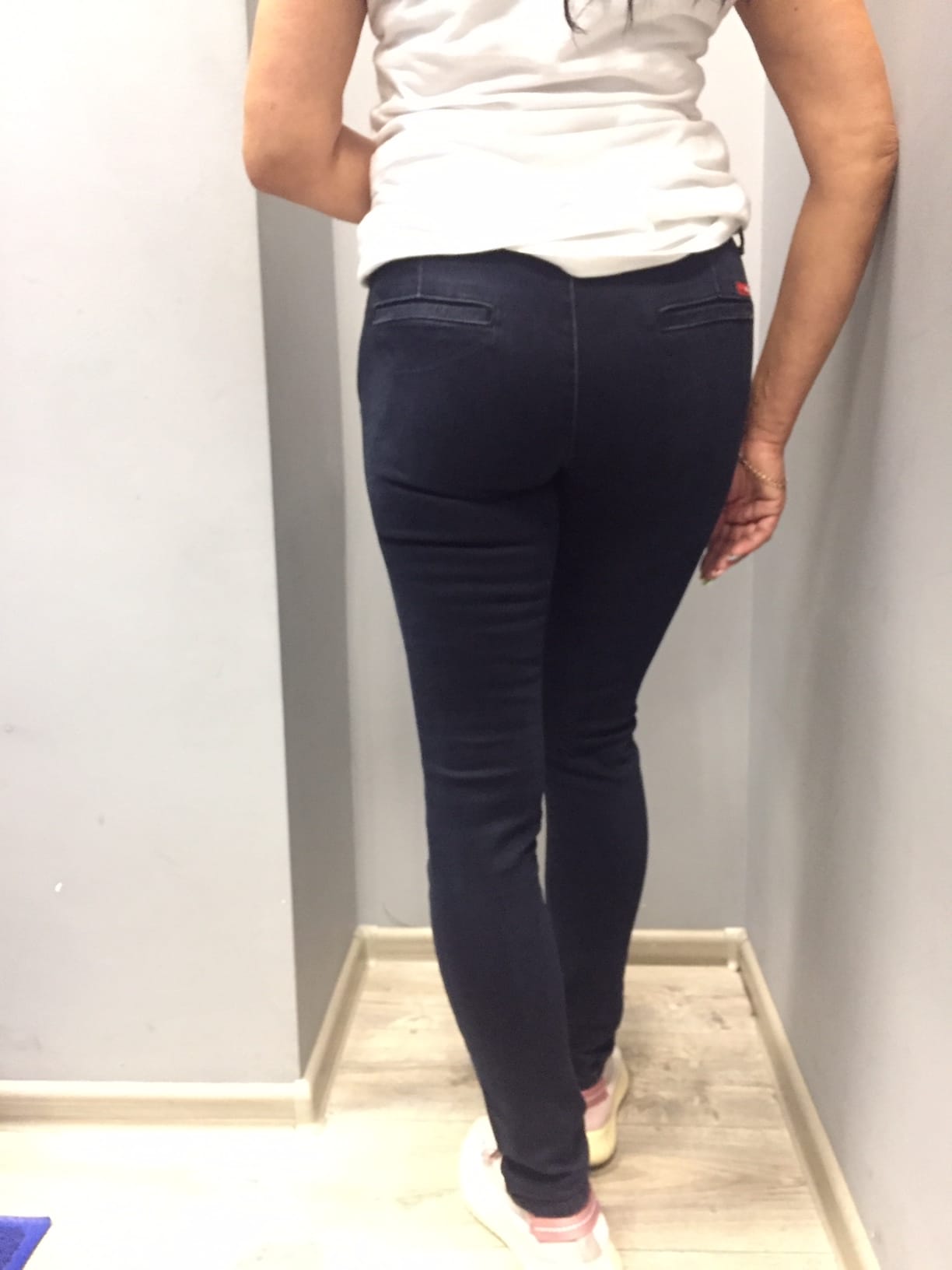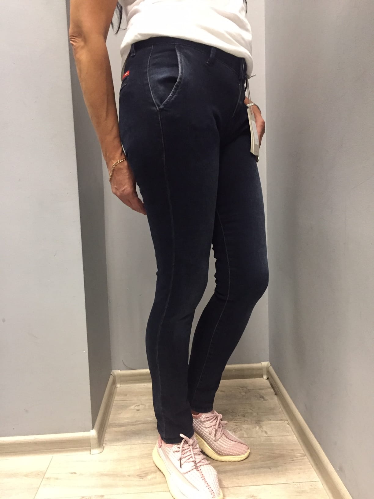 Женские джинсы chino тёмно-синего цвета с завышенной талией из эластичной ткани хорошо подходят к любой фигуре, подчёркивая её достоинства. Вы можете быть уверены, что это будут джинсы, которые прослужат долго. С ними будет модной любая укладка! Застёгиваются на молнию, имеют 2 косых кармана, пояс со шлевками.
