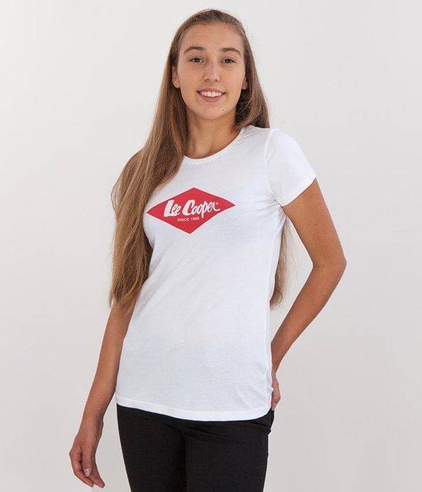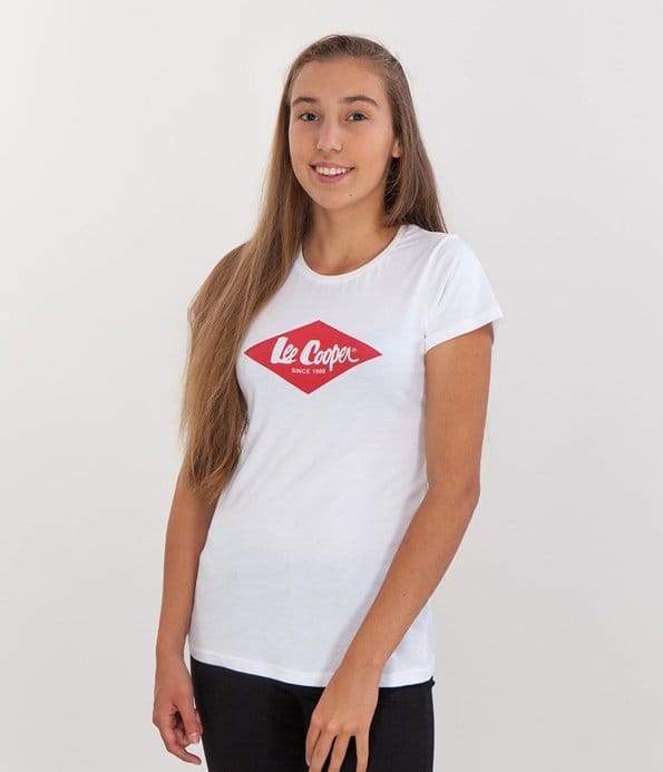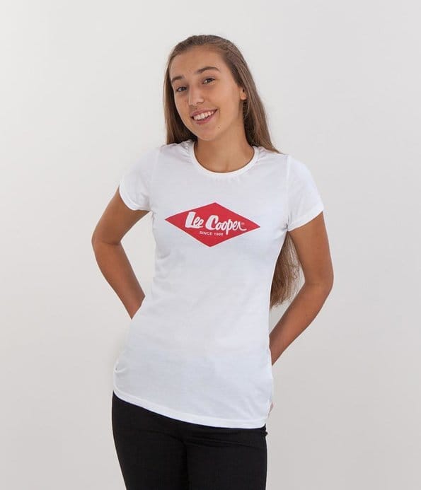 Белая футболка с логотипом Lee Cooper, мода на логотипы в этом году, база многих модных коллекций. Это базовая вещь, которая быстро и ловко создает эффектные look’и в стиле casual, бохо-шик, smart-casual, гранж, инди-рок, спорт-шик. Белая женская футболка одинаково хорошо сочетается как с джинсами, юбками и брюками разного кроя, так и шортами, платьем с тонкими бретельками, приталенным пиджаком или кожаным жакетом.