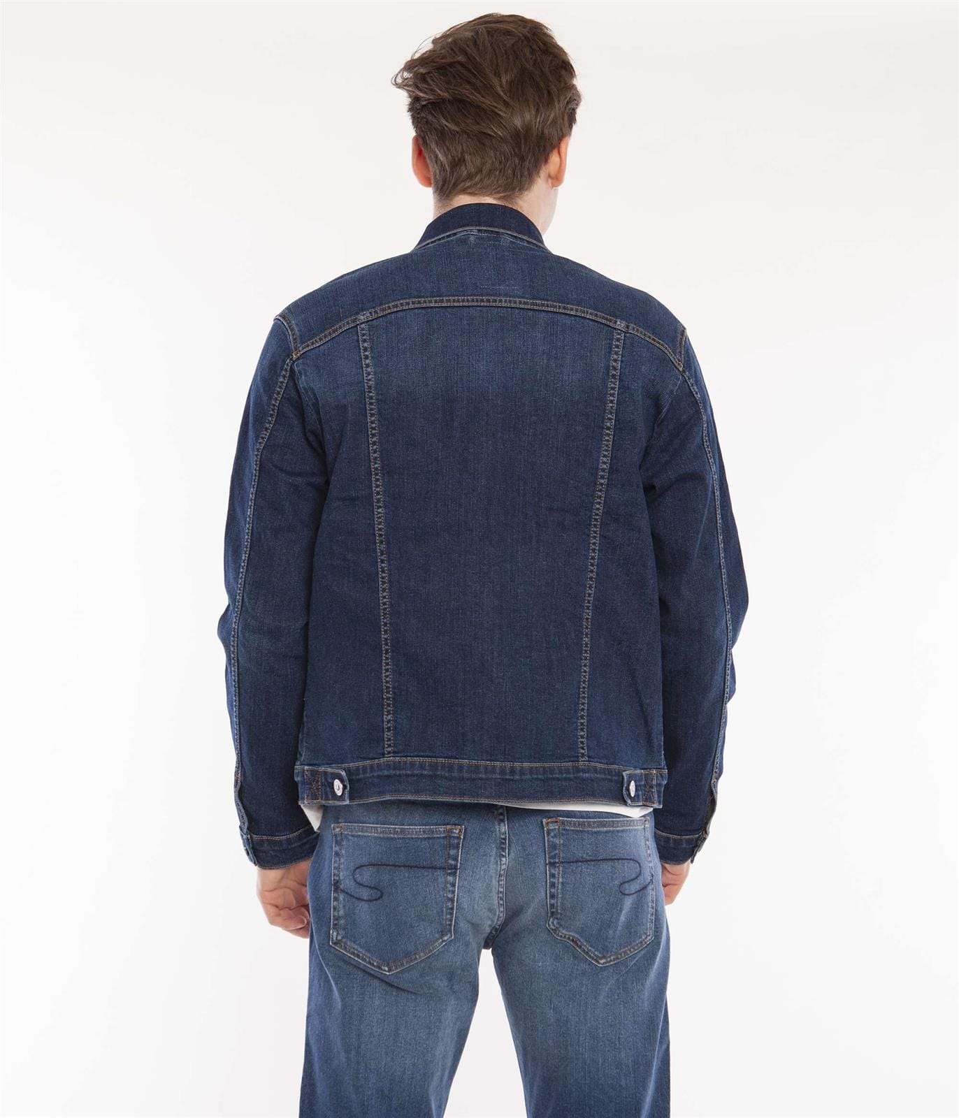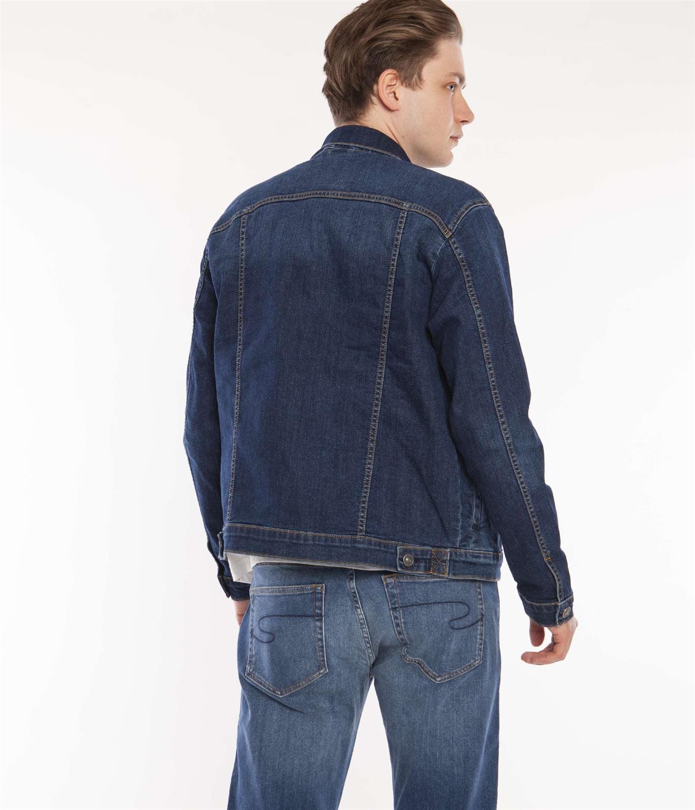 Мужская джинсовая куртка на пуговицах, классический воротник, два передних кармана с клапанами на пуговицах, открытые боковые карманы, манжеты на пуговицах, регулируется снизу на пуговицах.