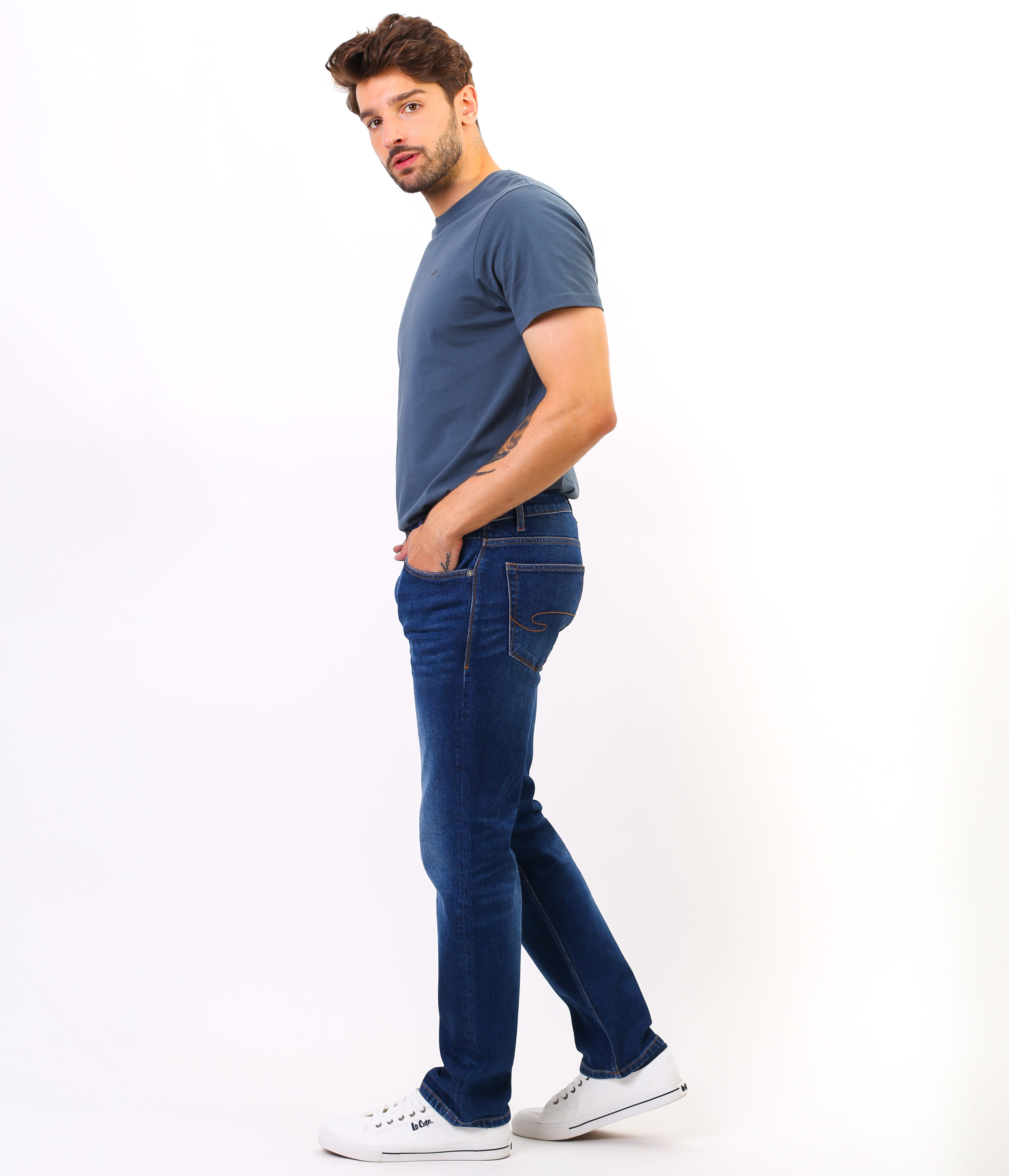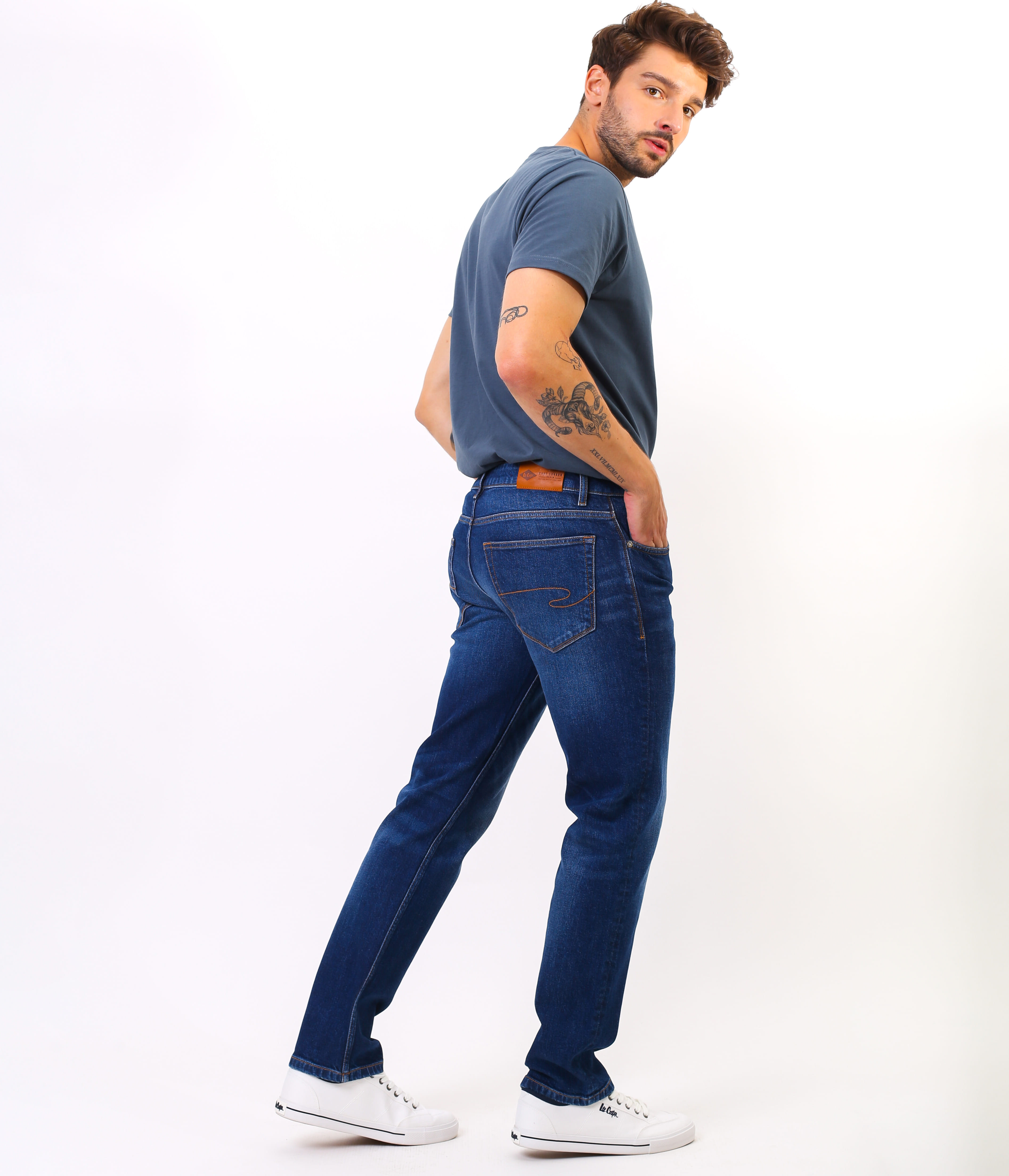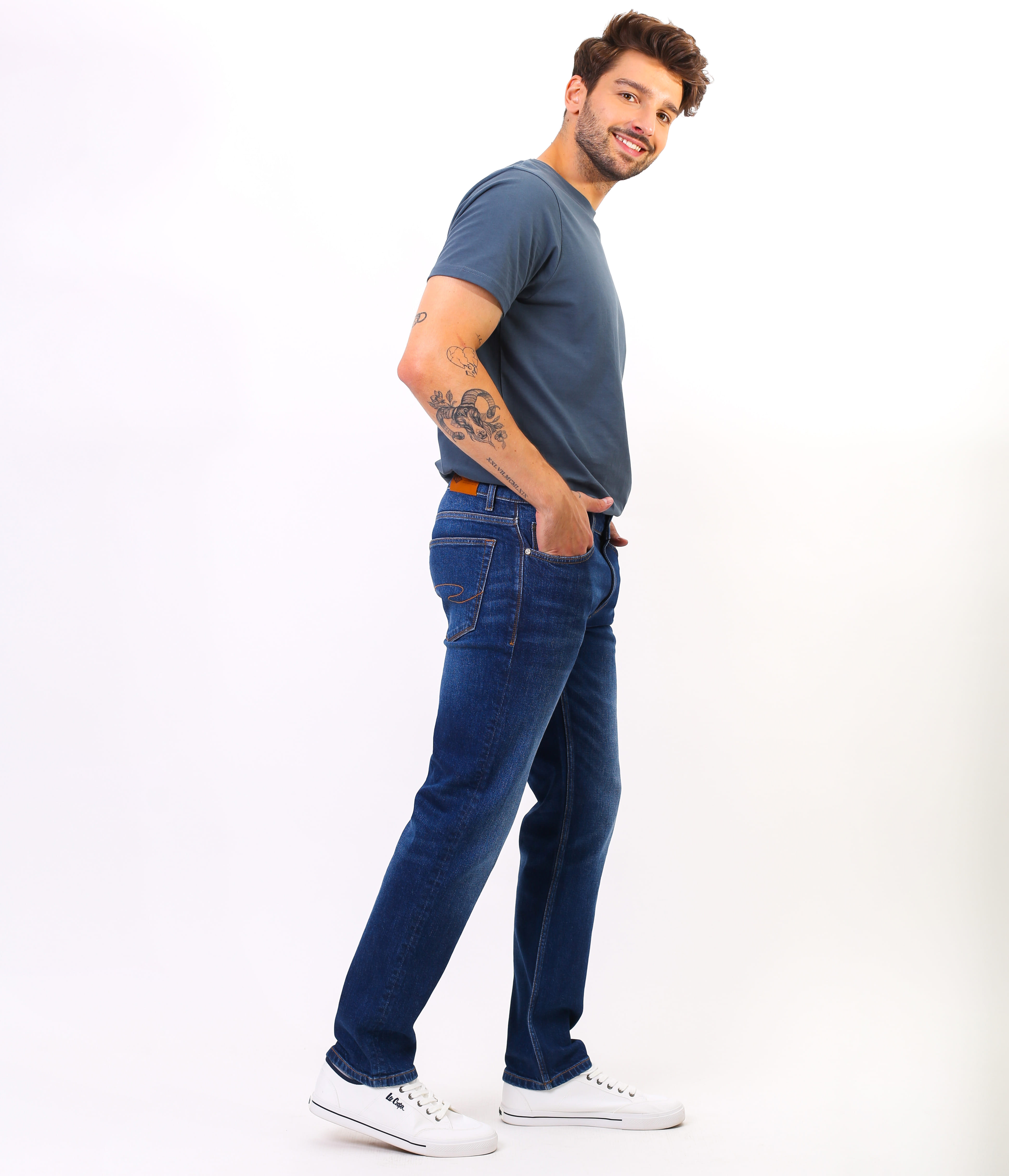 Мужские джинсы популярного кроя - классические, с немного зауженными штанинами к низу, прямые от бёдер и сужающимися в коленях, полностью облегающими лодыжки. Они идеально сидят на большинстве фигур. Зауженная форма не искажает силуэт. Посадка высокая, застёгиваются на молнию, с пятью карманами.
