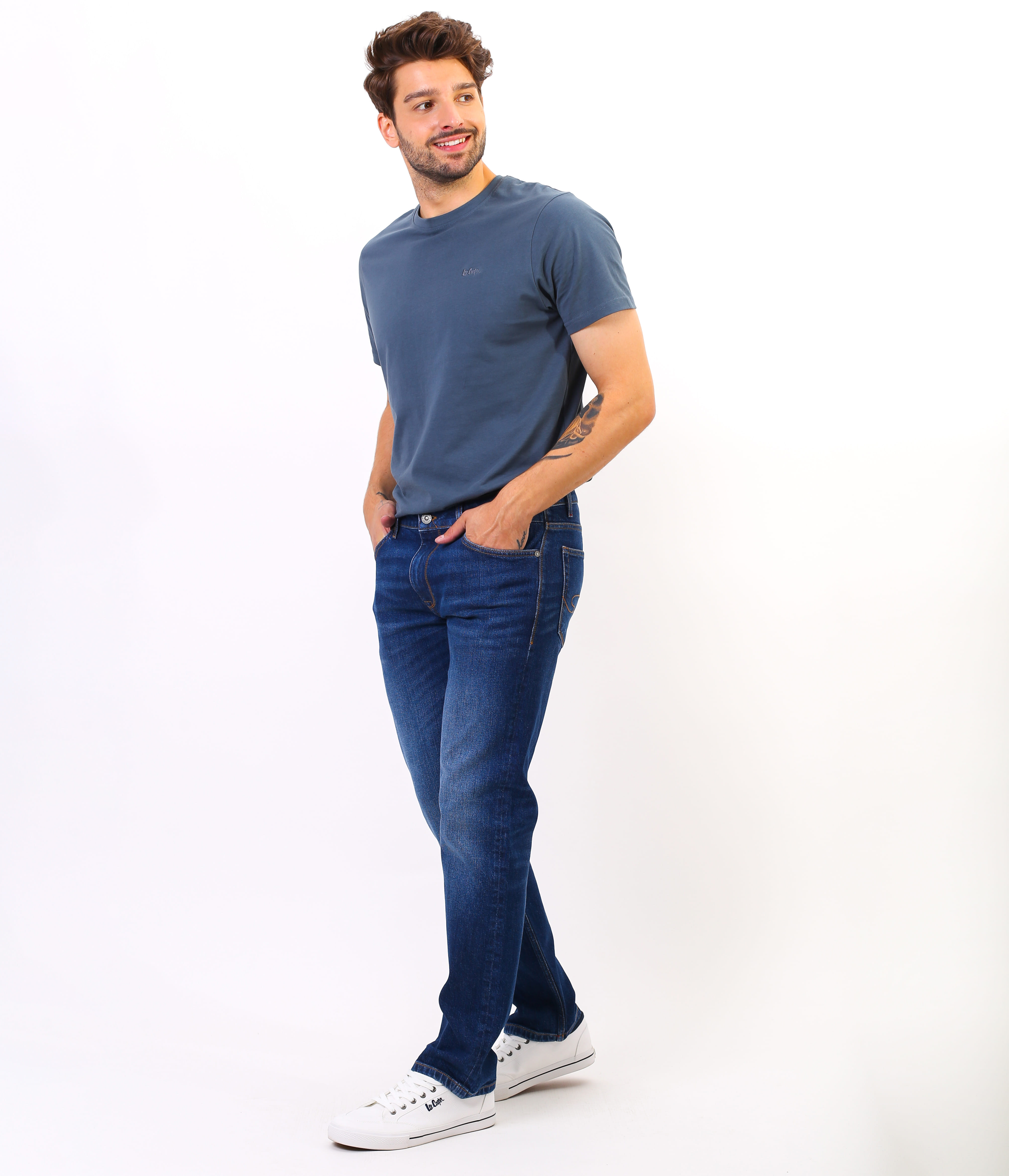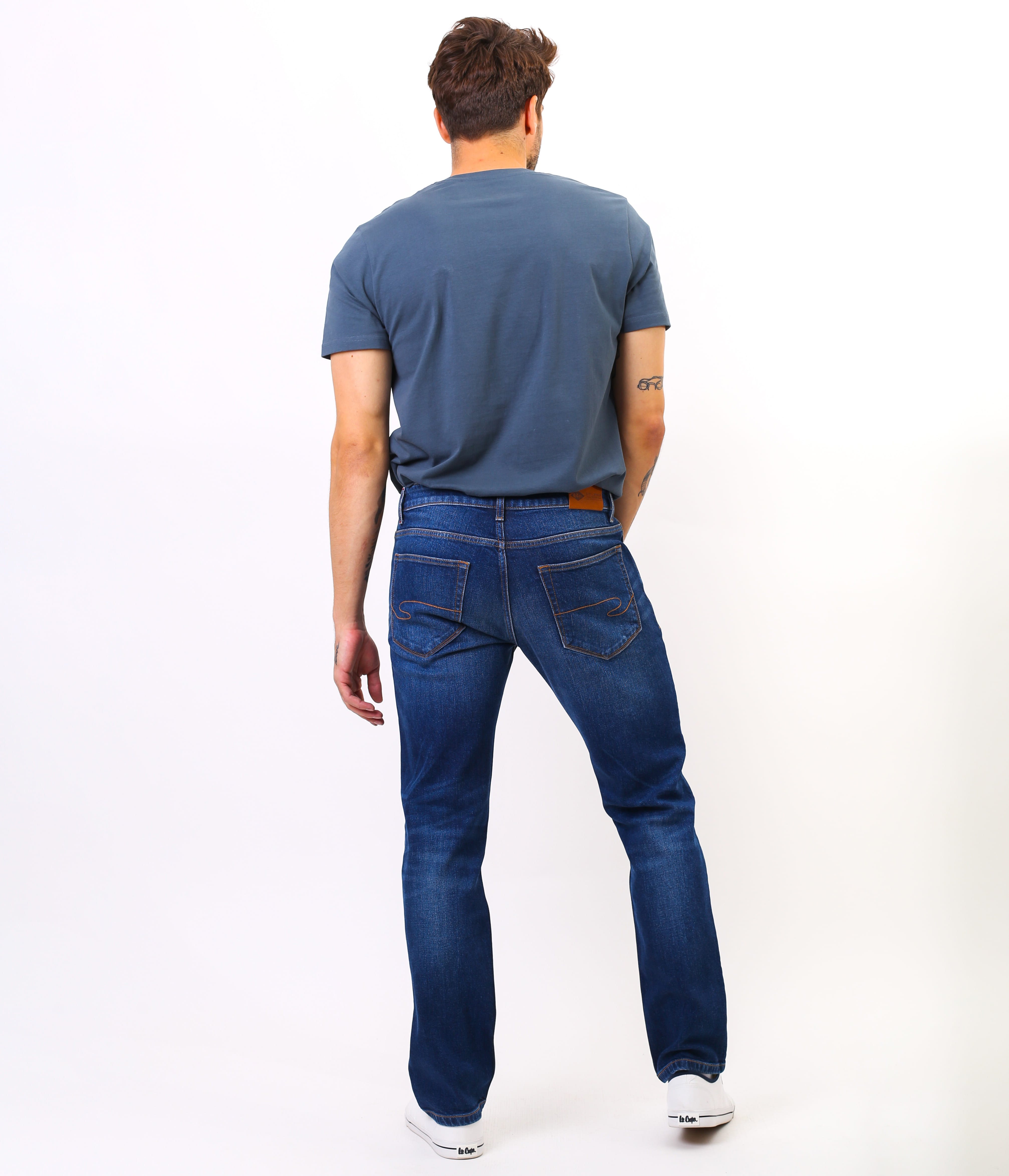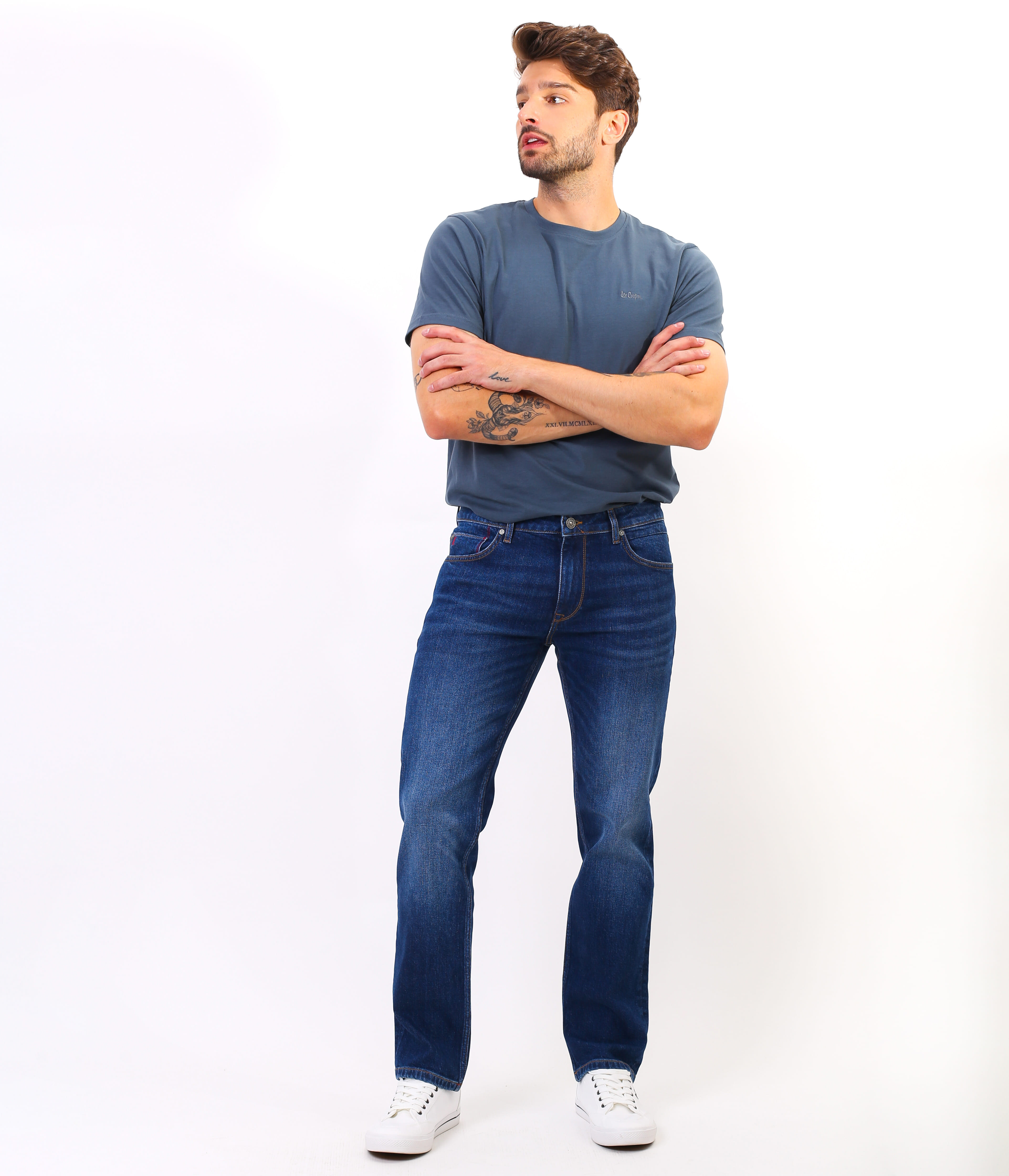 Мужские джинсы популярного кроя - классические, с немного зауженными штанинами к низу, прямые от бёдер и сужающимися в коленях, полностью облегающими лодыжки. Они идеально сидят на большинстве фигур. Зауженная форма не искажает силуэт. Посадка высокая, застёгиваются на молнию, с пятью карманами.