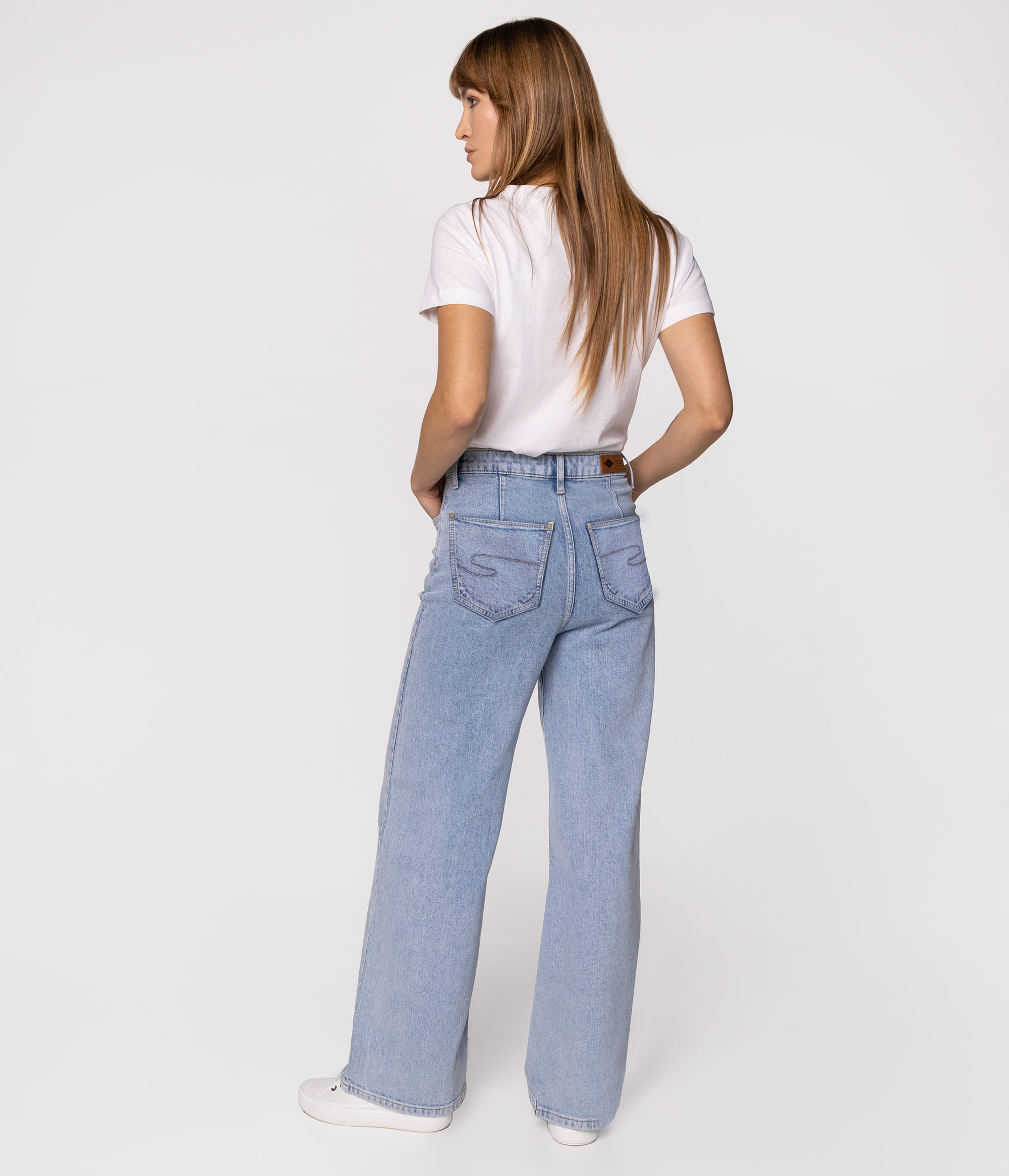 Широкие расклешённые светлые джинсовые брюки, сочетающие в себе классический и современный стиль. Широкие брюки-клёш изготовлены из высококачественного хлопка с добавлением эластана, что делает их мягкими, эластичными и прочными. У них очень высокая талия и расклешённые ноги. У нашей фотомодели рост 175 см., размер 27\30.