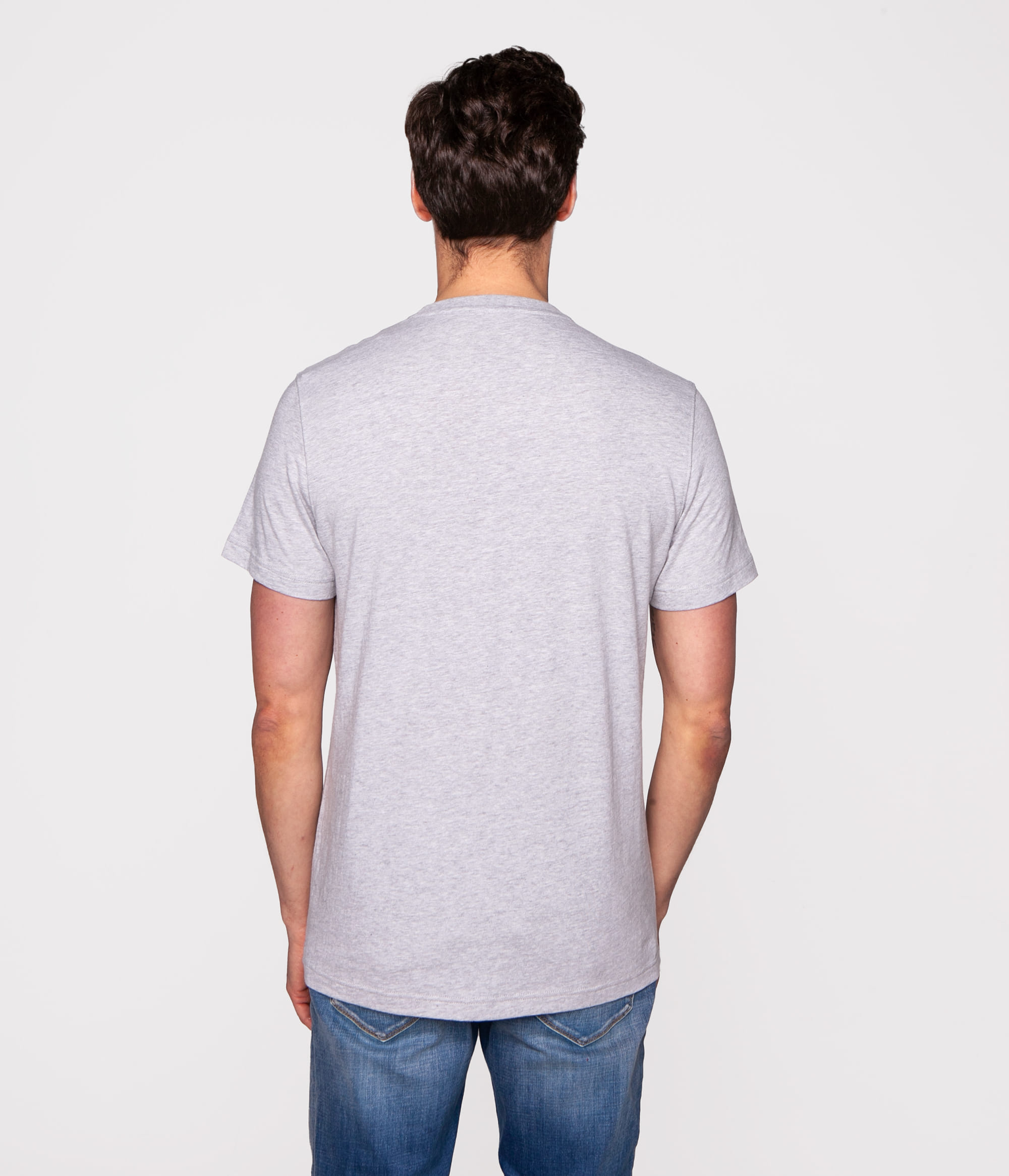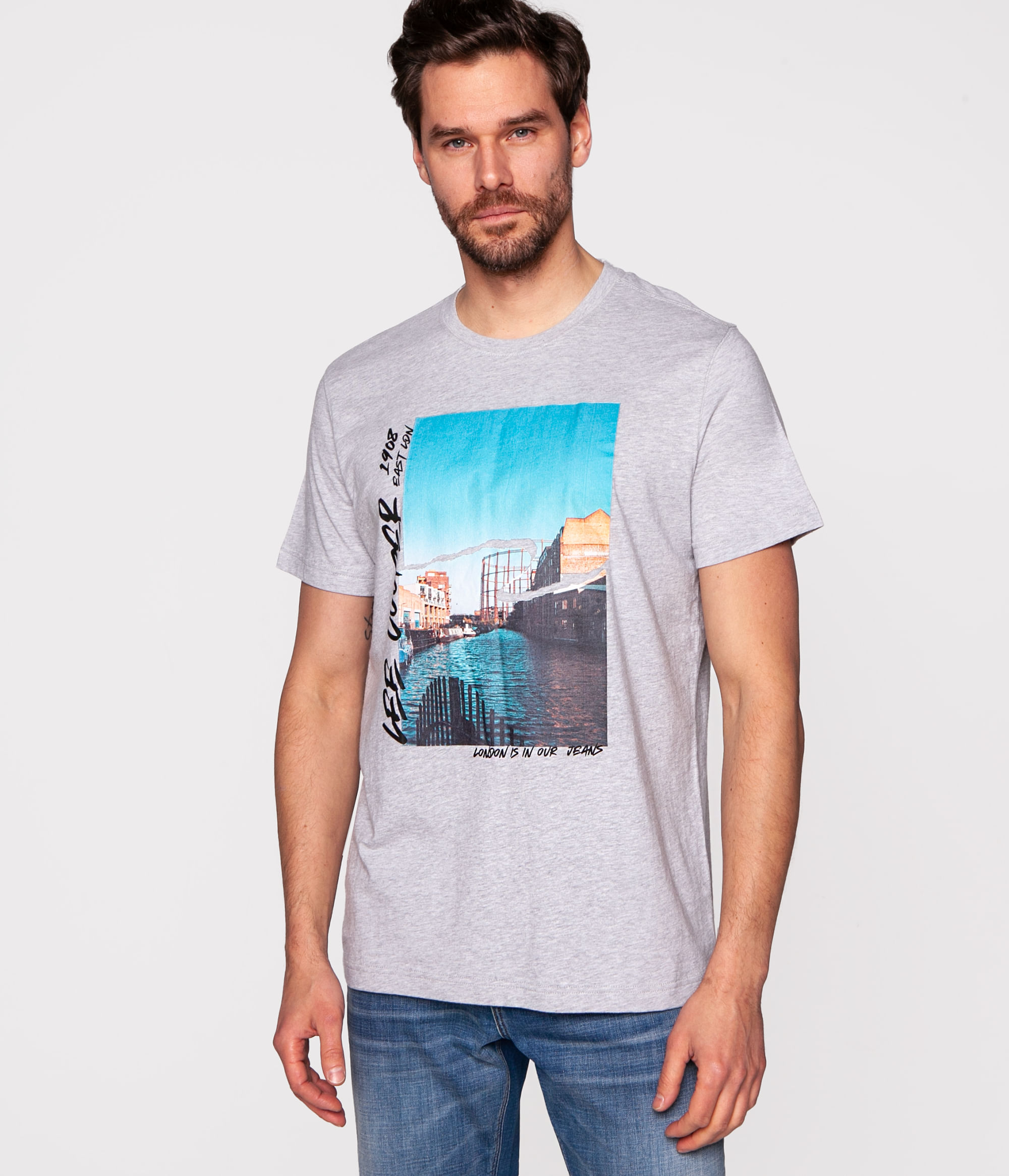Мужская серая майка с крупным принтом спереди, прямого кроя regular из 100% дышащего хлопка. Наша модель ростом 186 см и носит размер L.