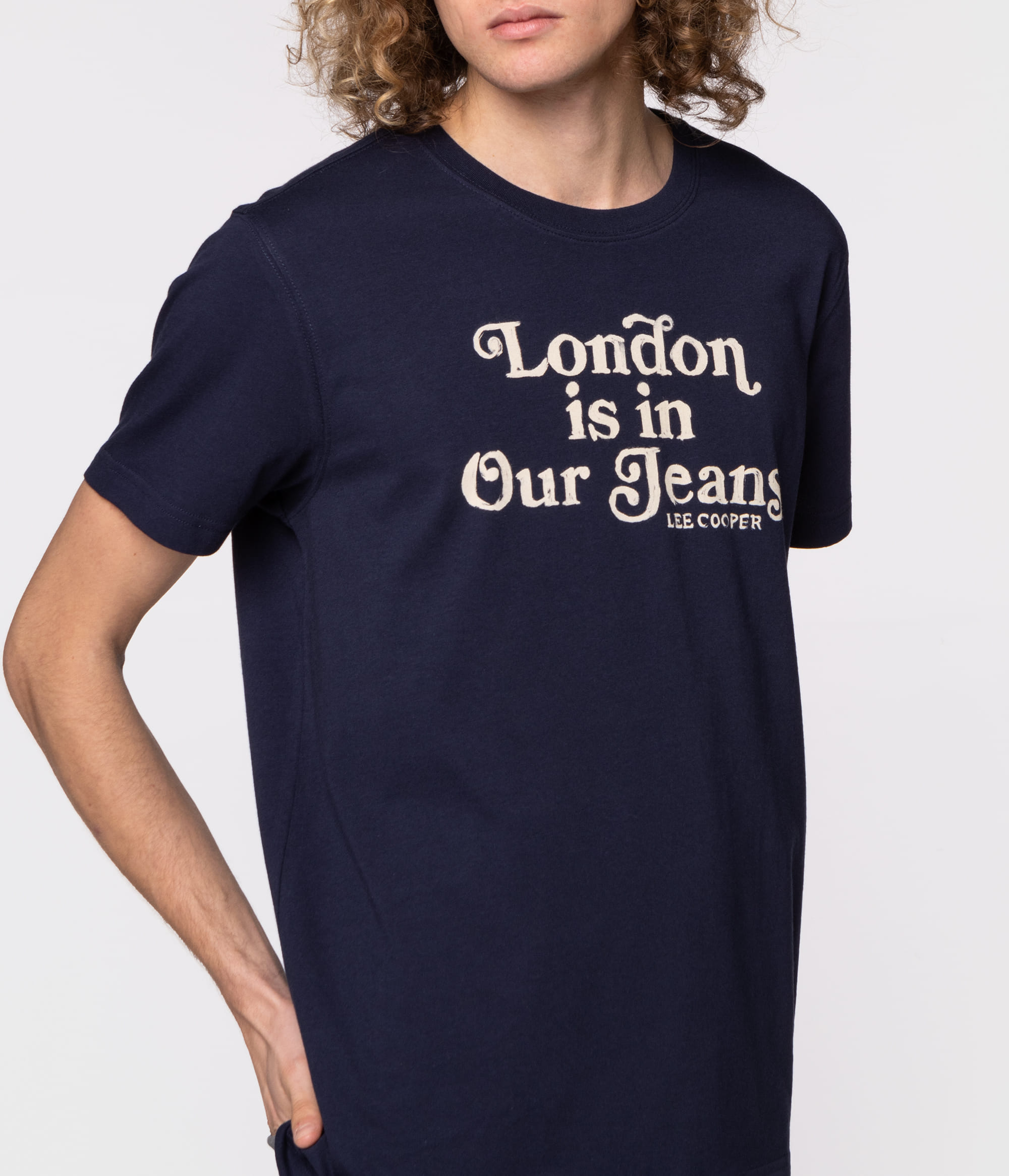 Мужская тёмно-синяя футболка стандартного кроя regular, изготовлена из 100% дышащего хлопка, что гарантирует ваш комфорт при ношении. Круглый вырез горловины, короткие рукава, с принтом спереди. Наша модель на фото ростом 186 см. и носит размер L.