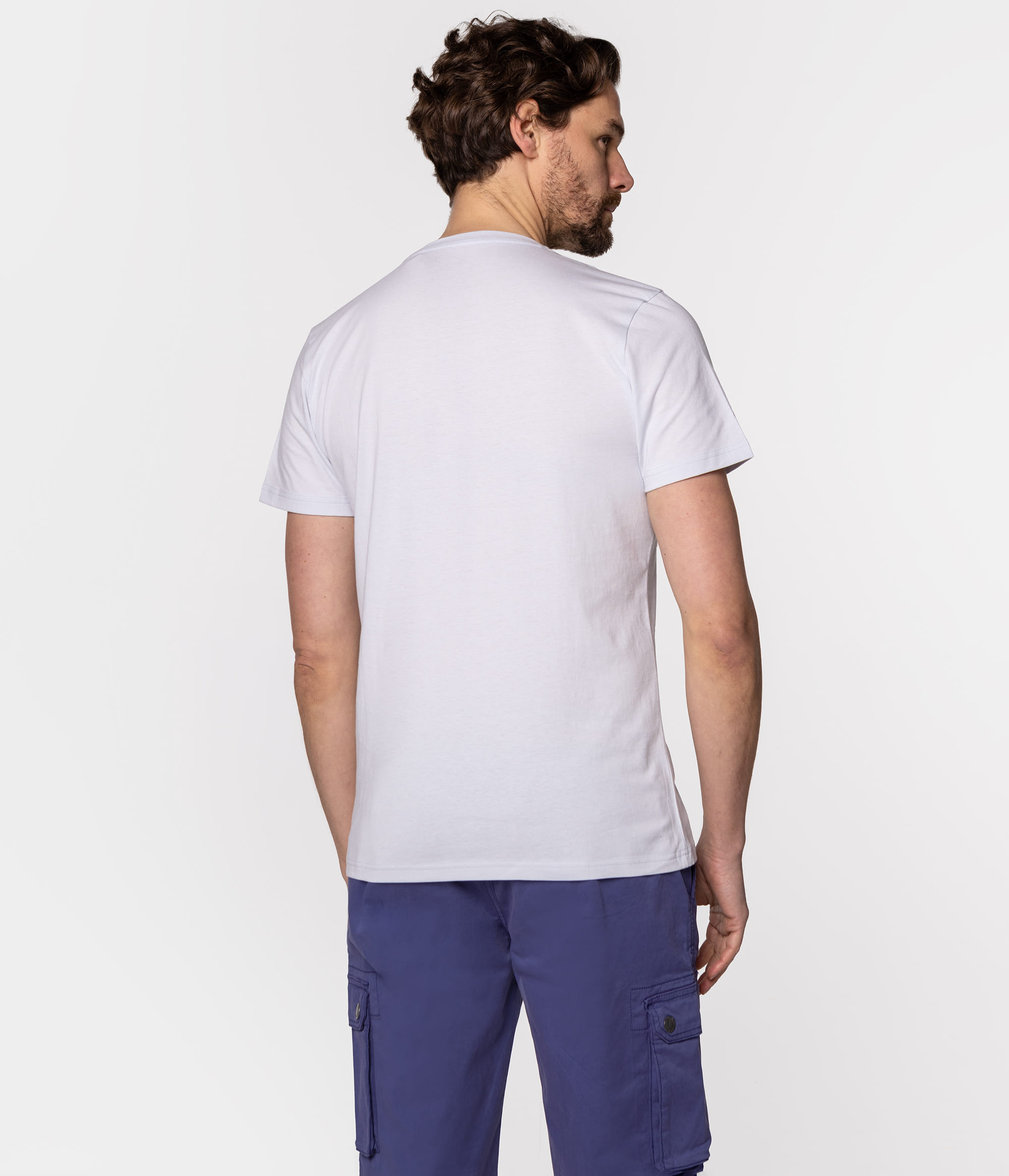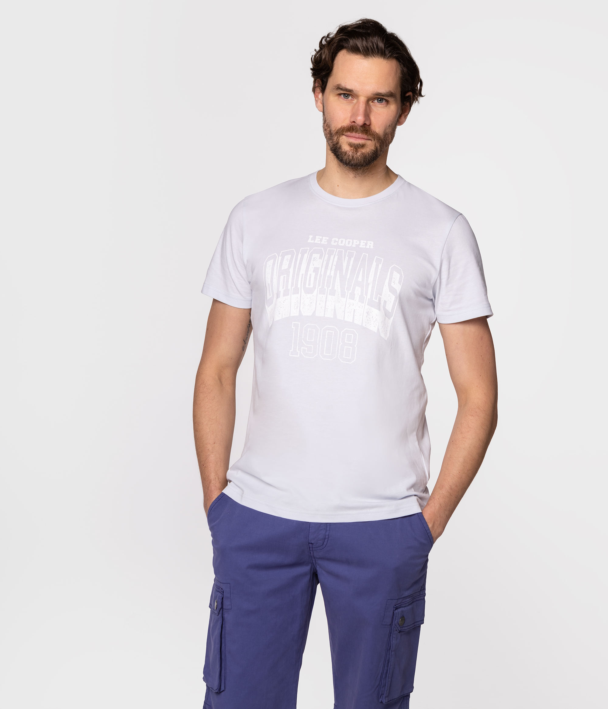 Мужская хлопковая майка голубого цвета обычного кроя с круглым вырезом и принтом на груди. Наша фотомодель ростом 186 см. и носит размер L.
