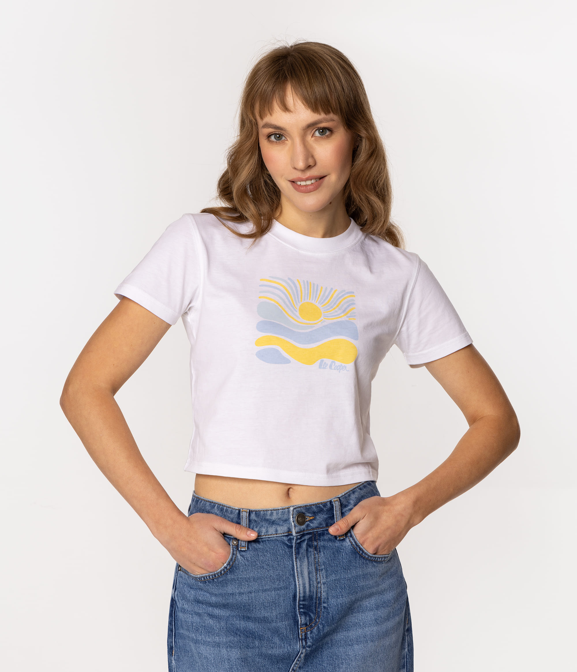 Женская майка SUN 1160 — летний must-have в новом исполнении. Футболка изготовлена из мягкого, дышащего хлопка, белого цвета с ярким принтом в виде оранжевого солнца и логотипом бренда. Укороченный крой слегка приоткрывает живот, придавая силуэту лёгкость и молодость.