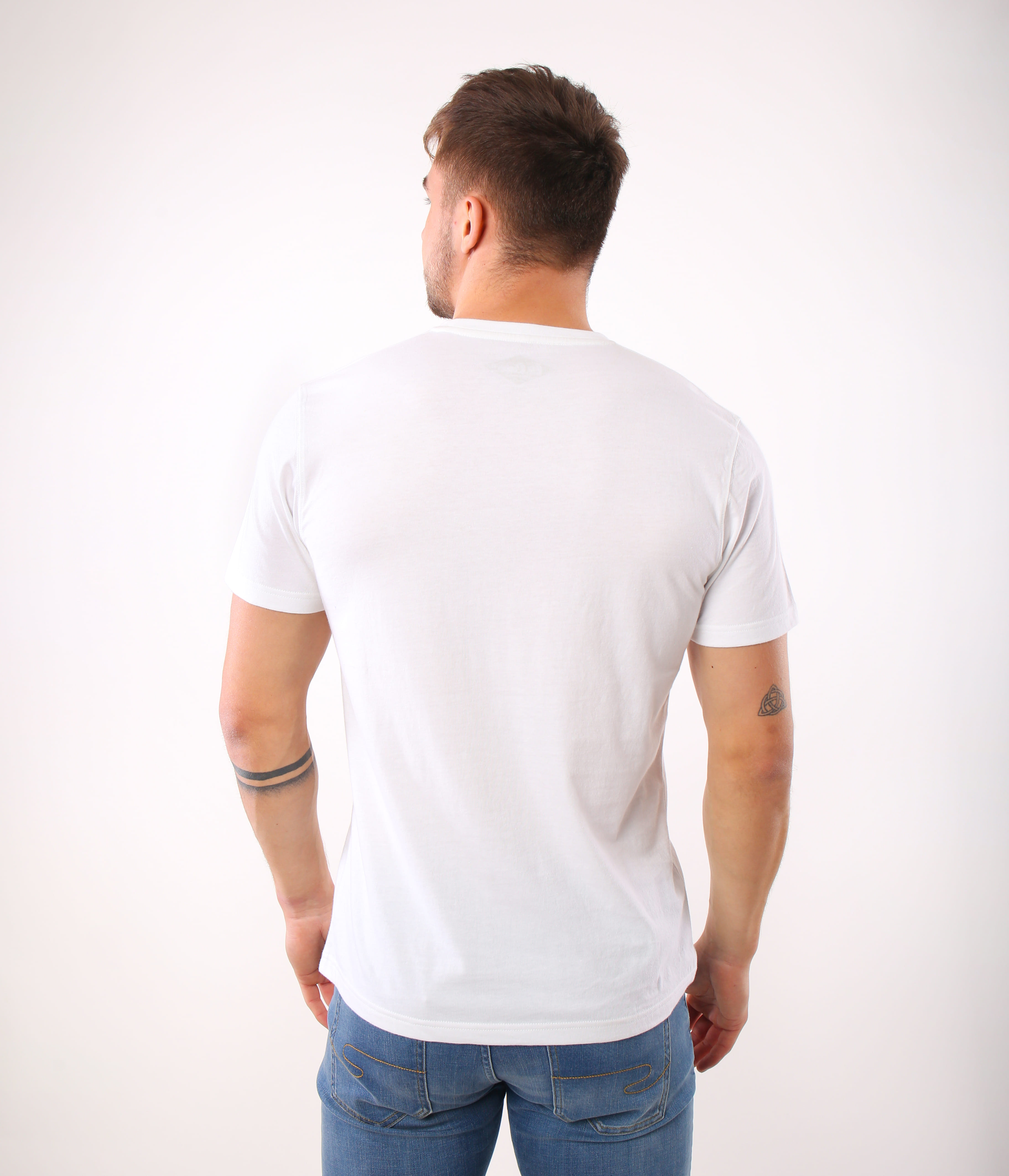 Майка белого цвета с крупным принтом, облегающего кроя slim из 100% дышащего хлопка c круглым вырезом горла. Наша фотомодель ростом 186 см и носит размер L.