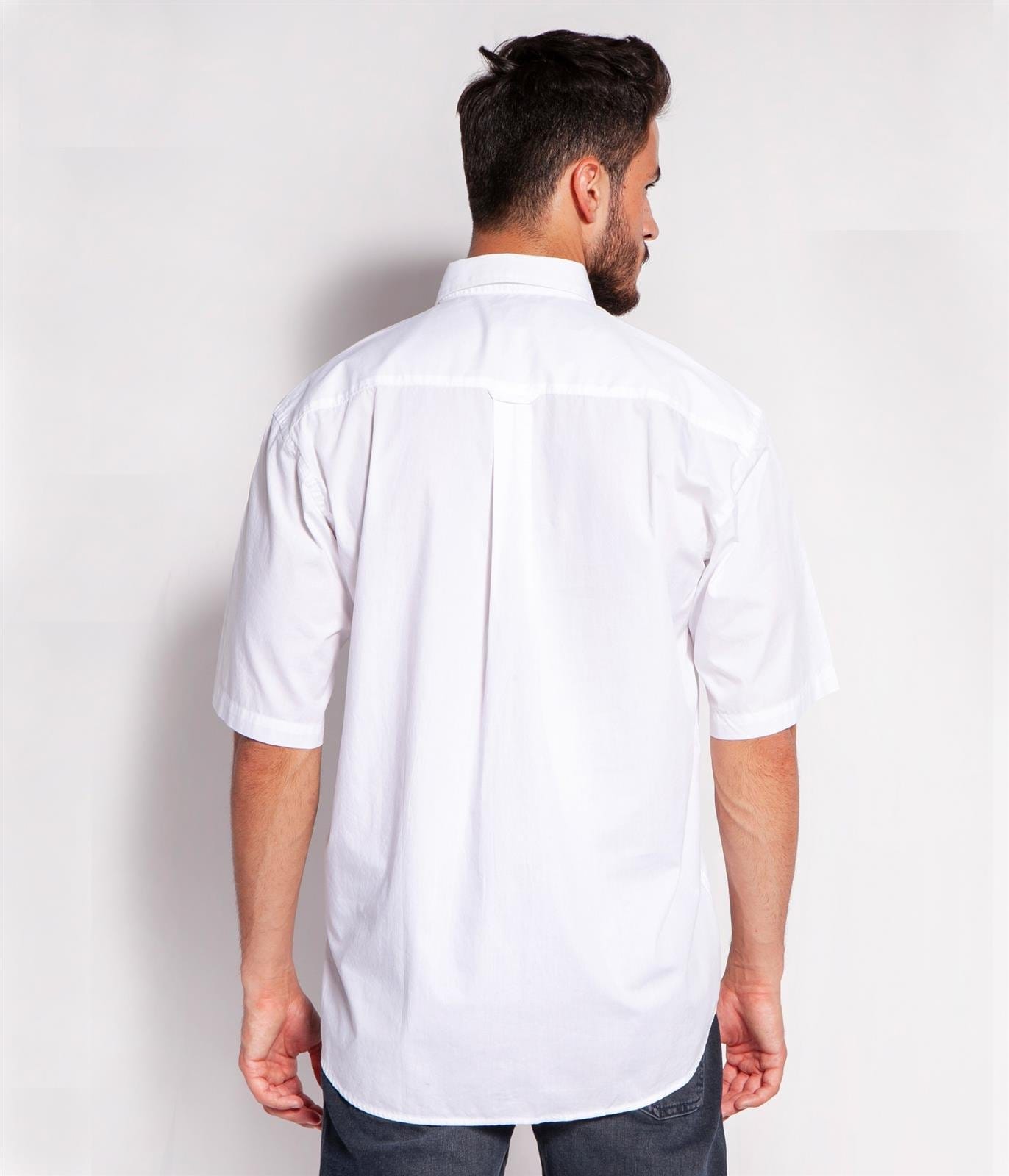 Белая мужская рубашка с короткими рукавами свободного кроя (comfort fit) из хлопчатобумажной ткани. Застёжка на пуговицы спереди. Воротник на пуговицах.