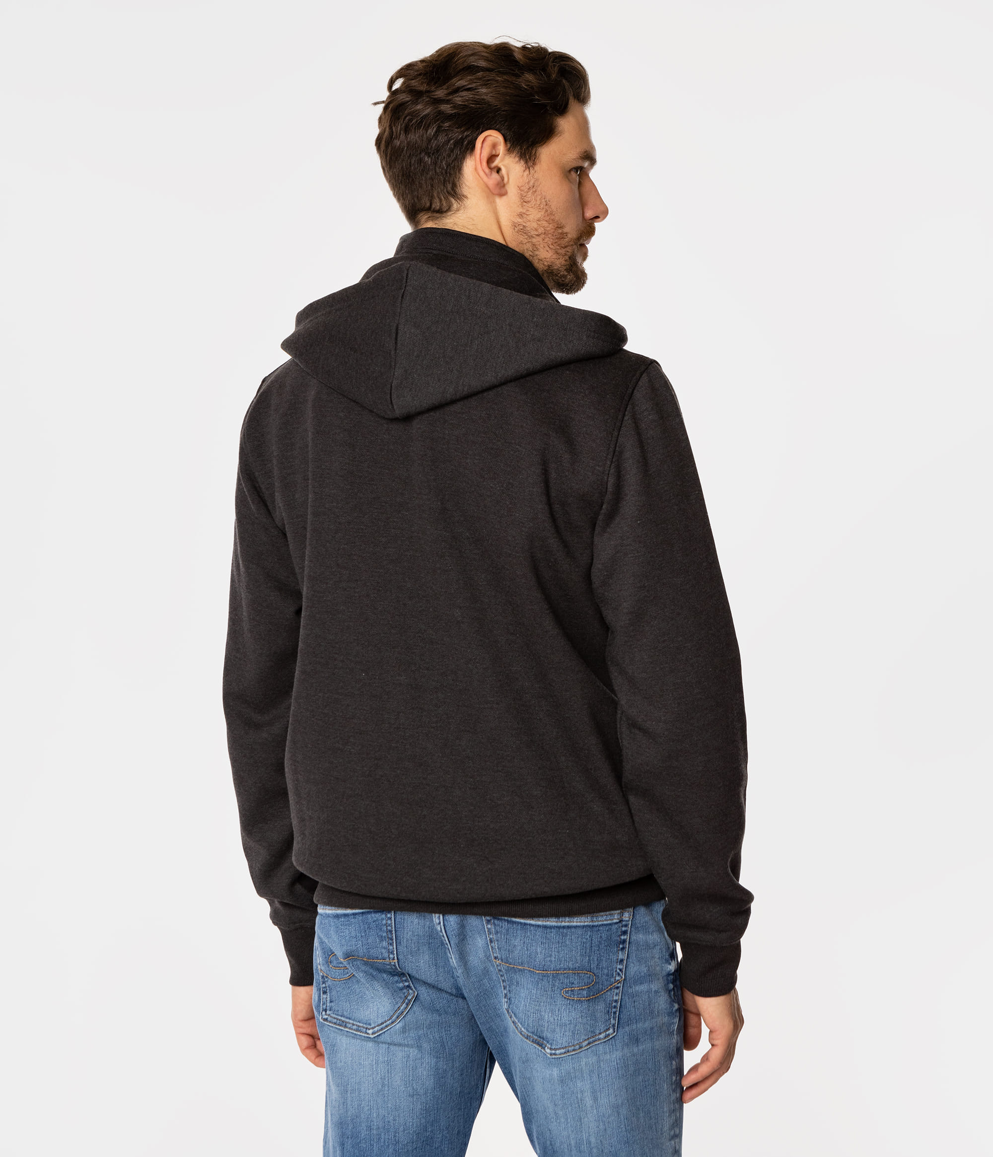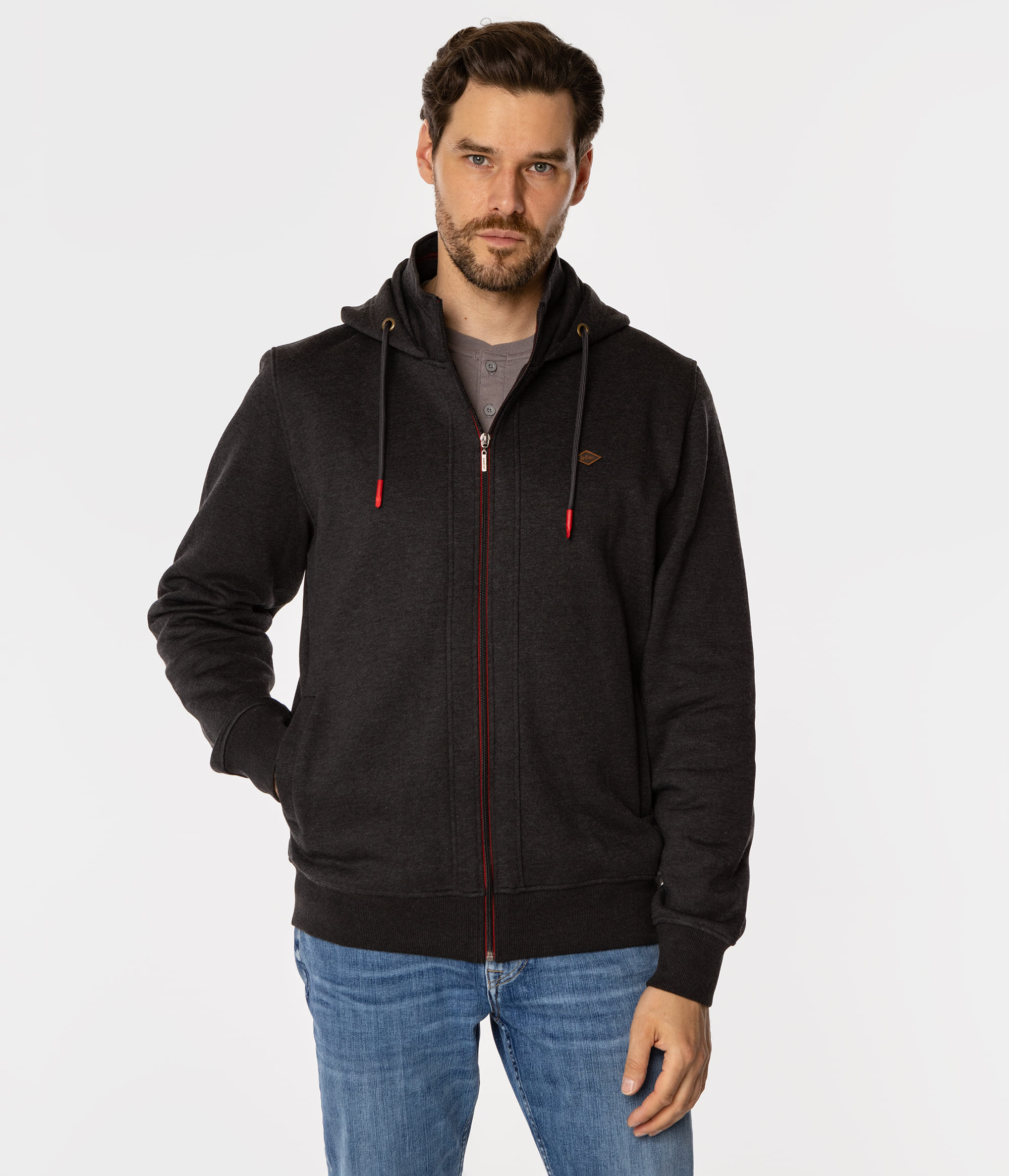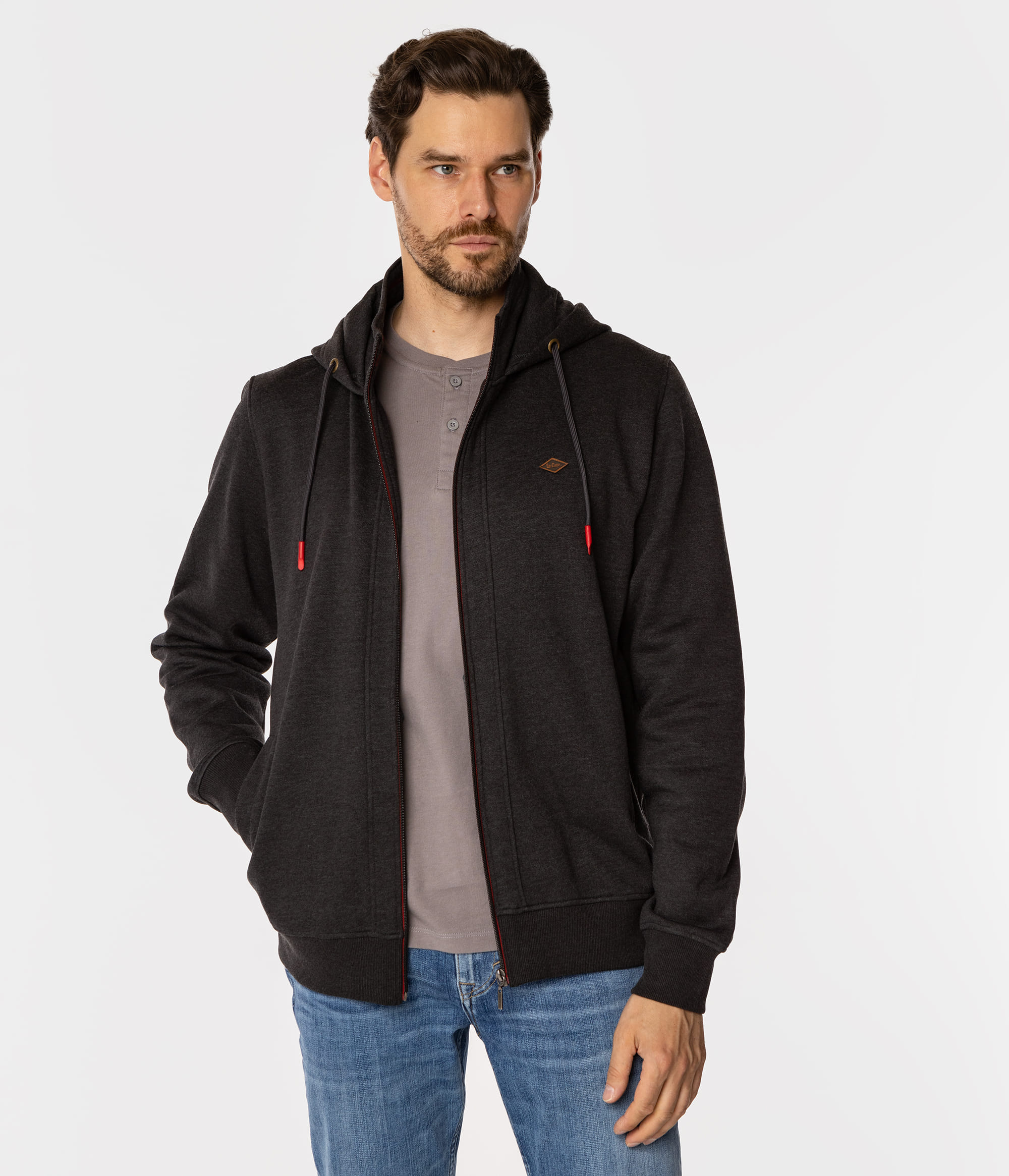 Мужская толстовка с регулируемым капюшоном, на молнии. Два передних кармана, ребристые края. Небольшая нашивка с логотипом бренда слева. У нашей модели рост 186 см., размер L.