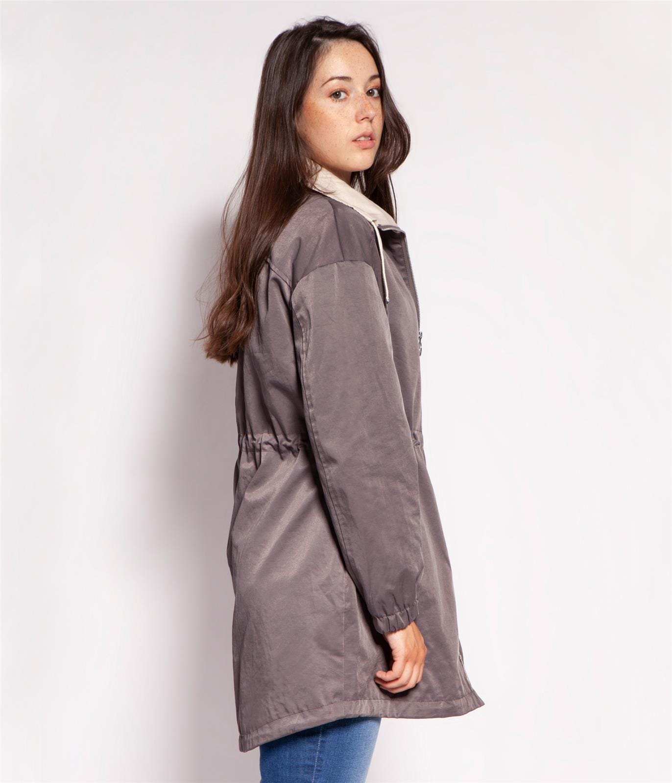 Женская куртка-парка свободного кроя, на молнии. Регулируемая талия, открывается сзади внизу, кулиска на воротнике, приспущенная линия плеча, два боковых кармана спереди.