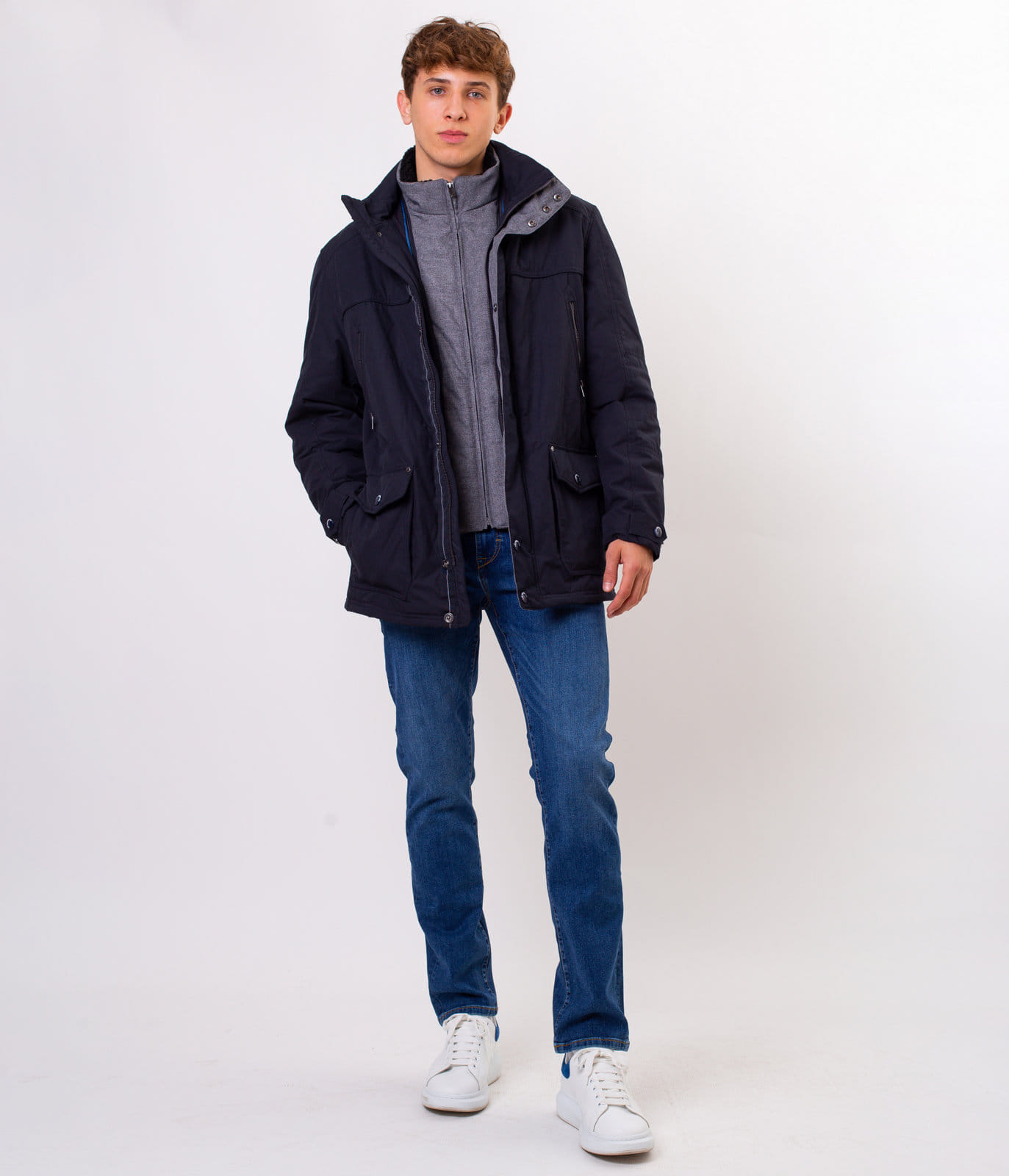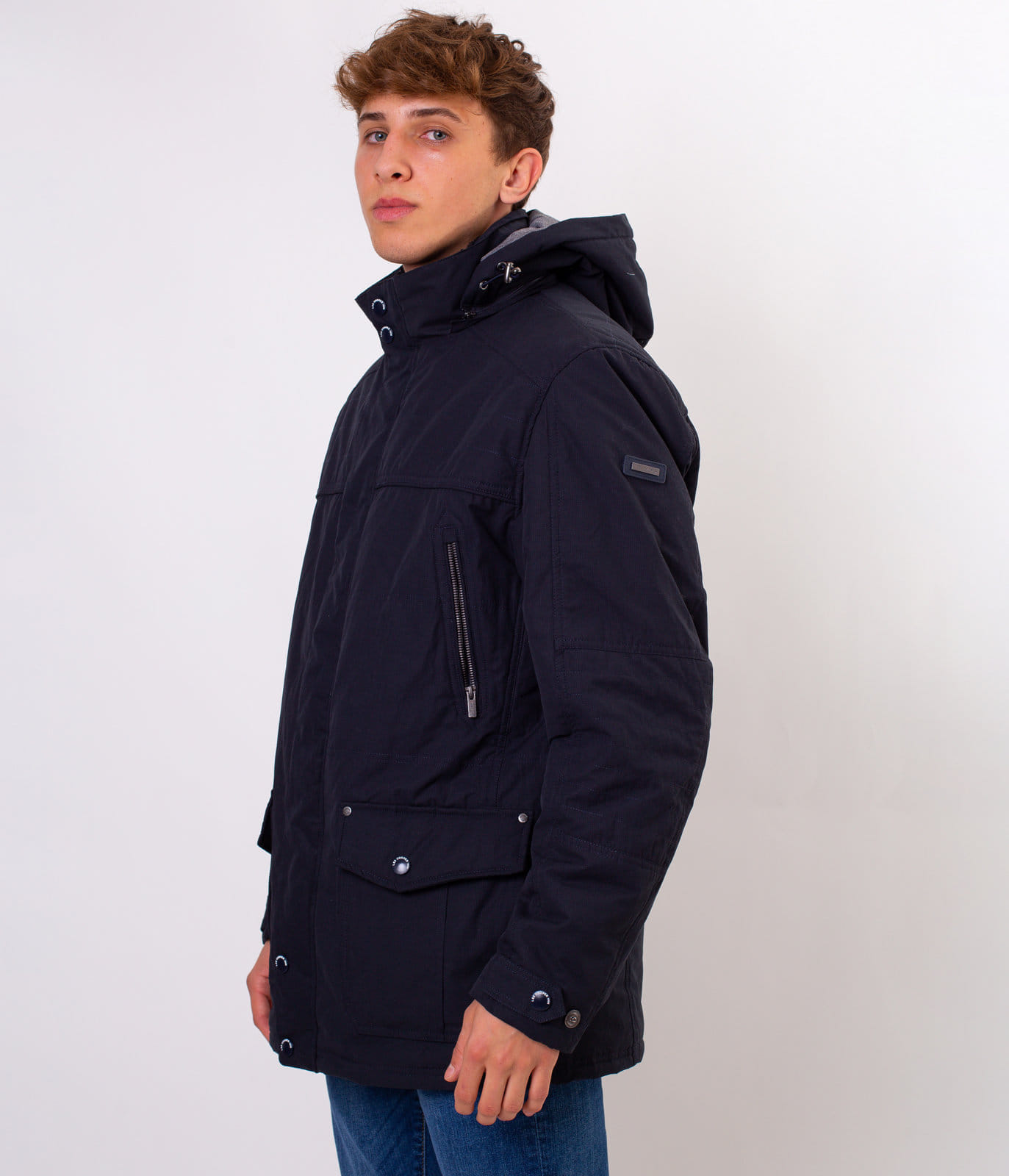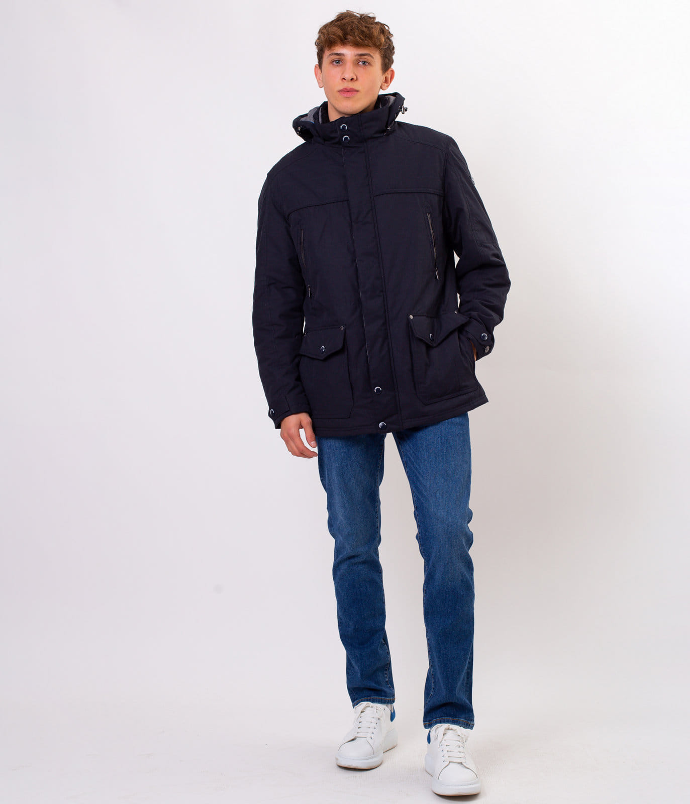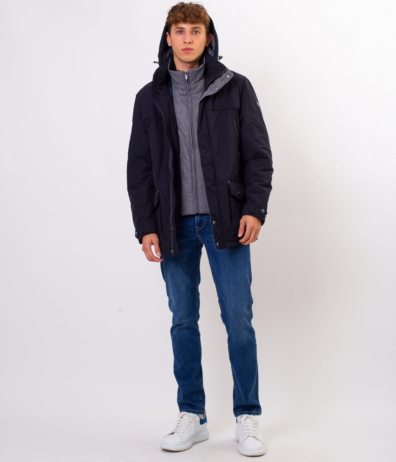 Мужская тёмно-синяя куртка со съёмным капюшоном. Средняя часть отстёгивается на молнии. Классический крой, застёжка на молнию, прикрытую планкой с кнопками. Спереди имеется шесть карманов, в которые поместятся все необходимые вещи. На рукаве размещена небольшая эмблема с логотипом Lee Cooper.
