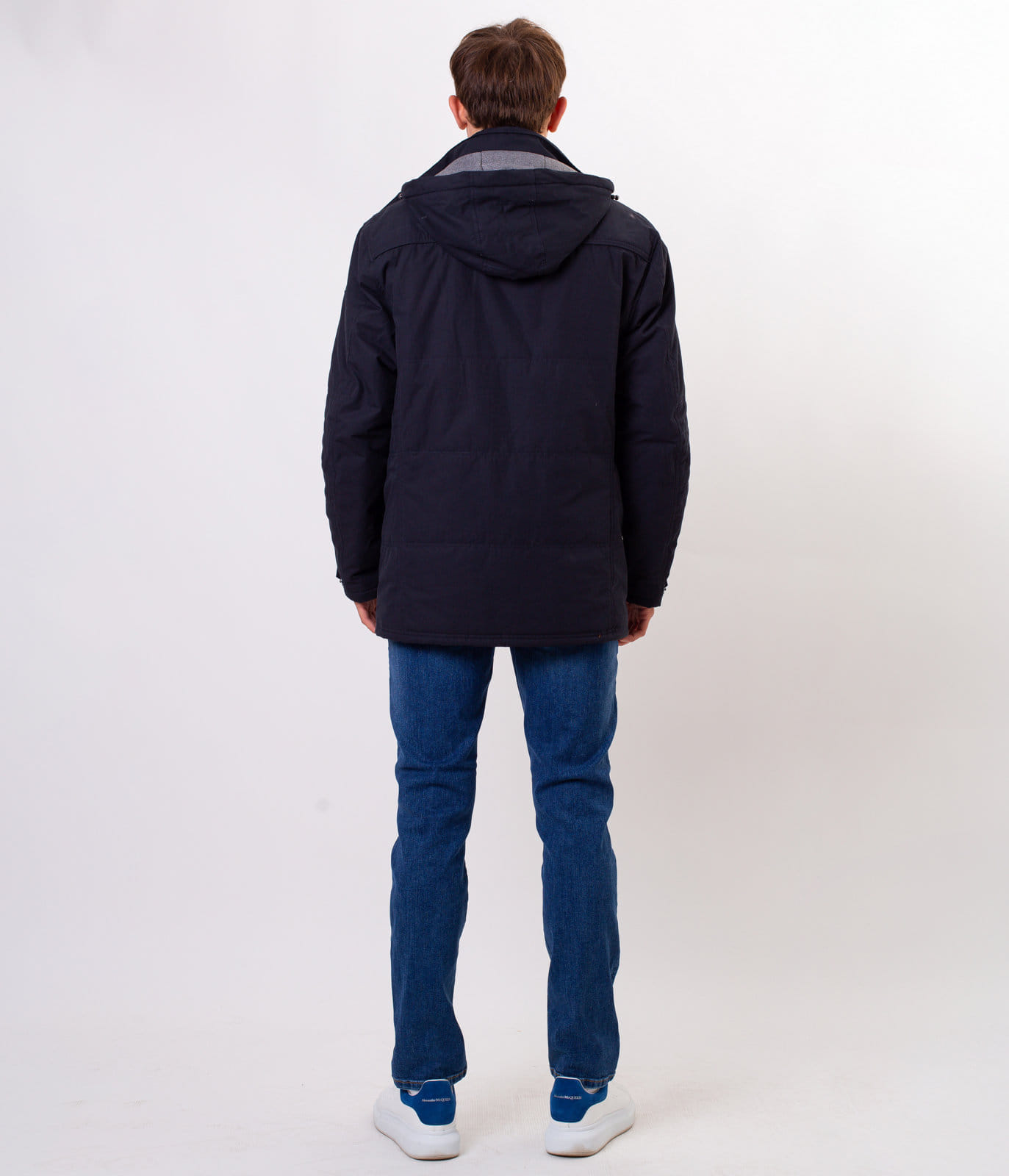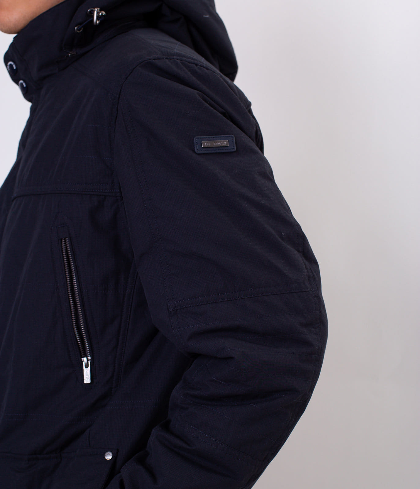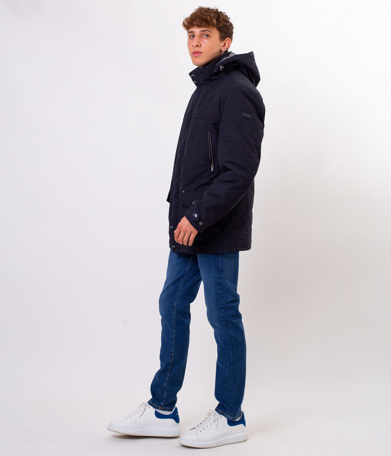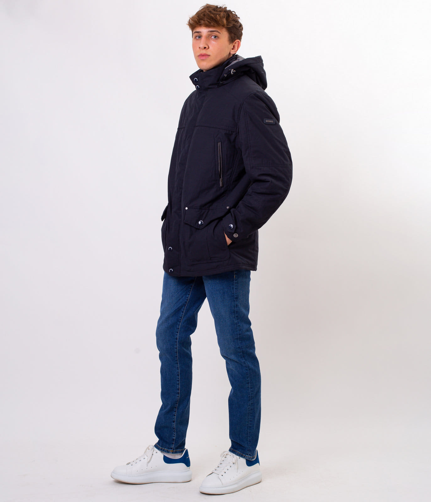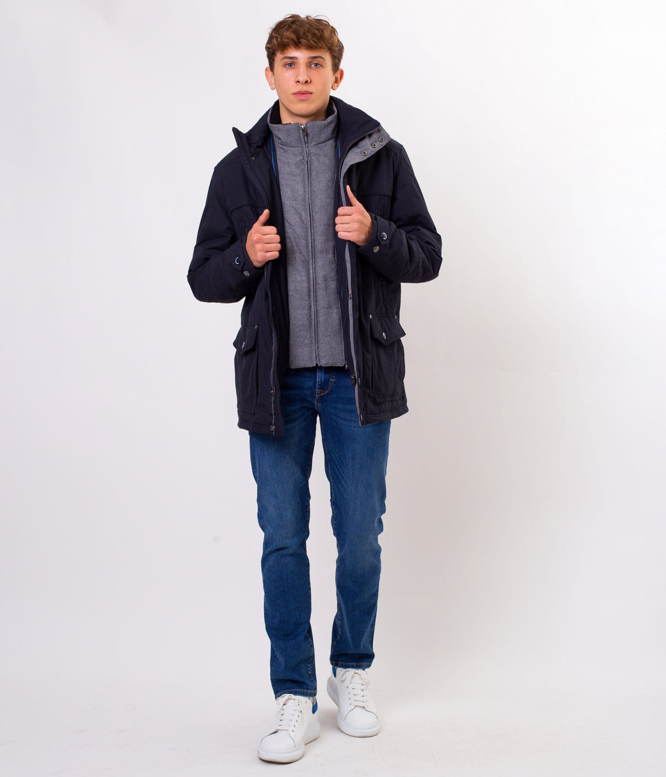 Мужская тёмно-синяя куртка со съёмным капюшоном. Средняя часть отстёгивается на молнии. Классический крой, застёжка на молнию, прикрытую планкой с кнопками. Спереди имеется шесть карманов, в которые поместятся все необходимые вещи. На рукаве размещена небольшая эмблема с логотипом Lee Cooper.