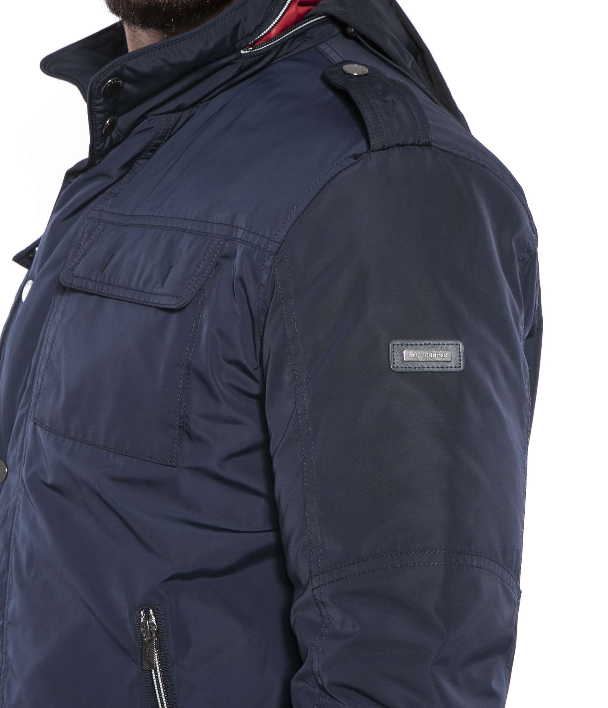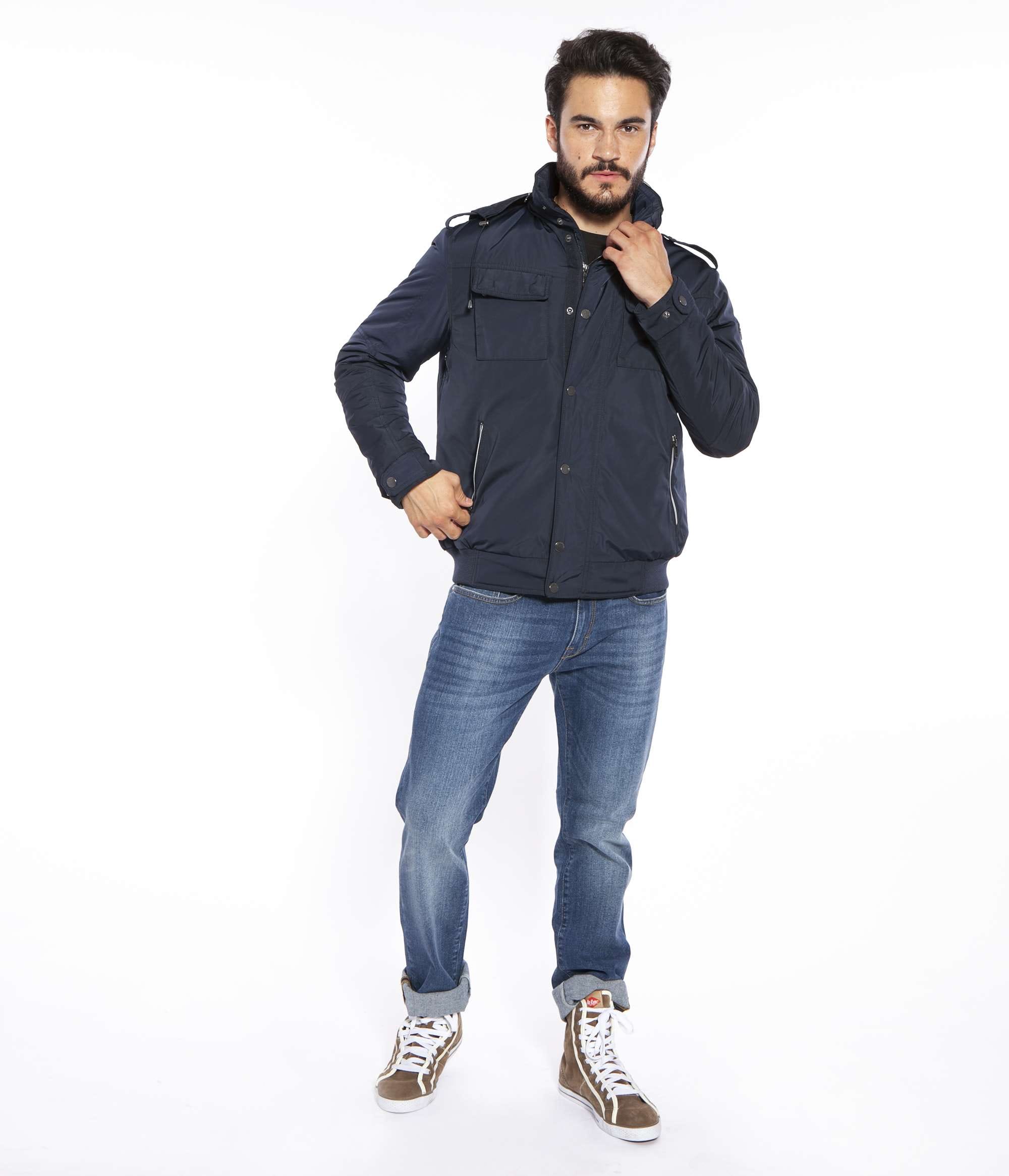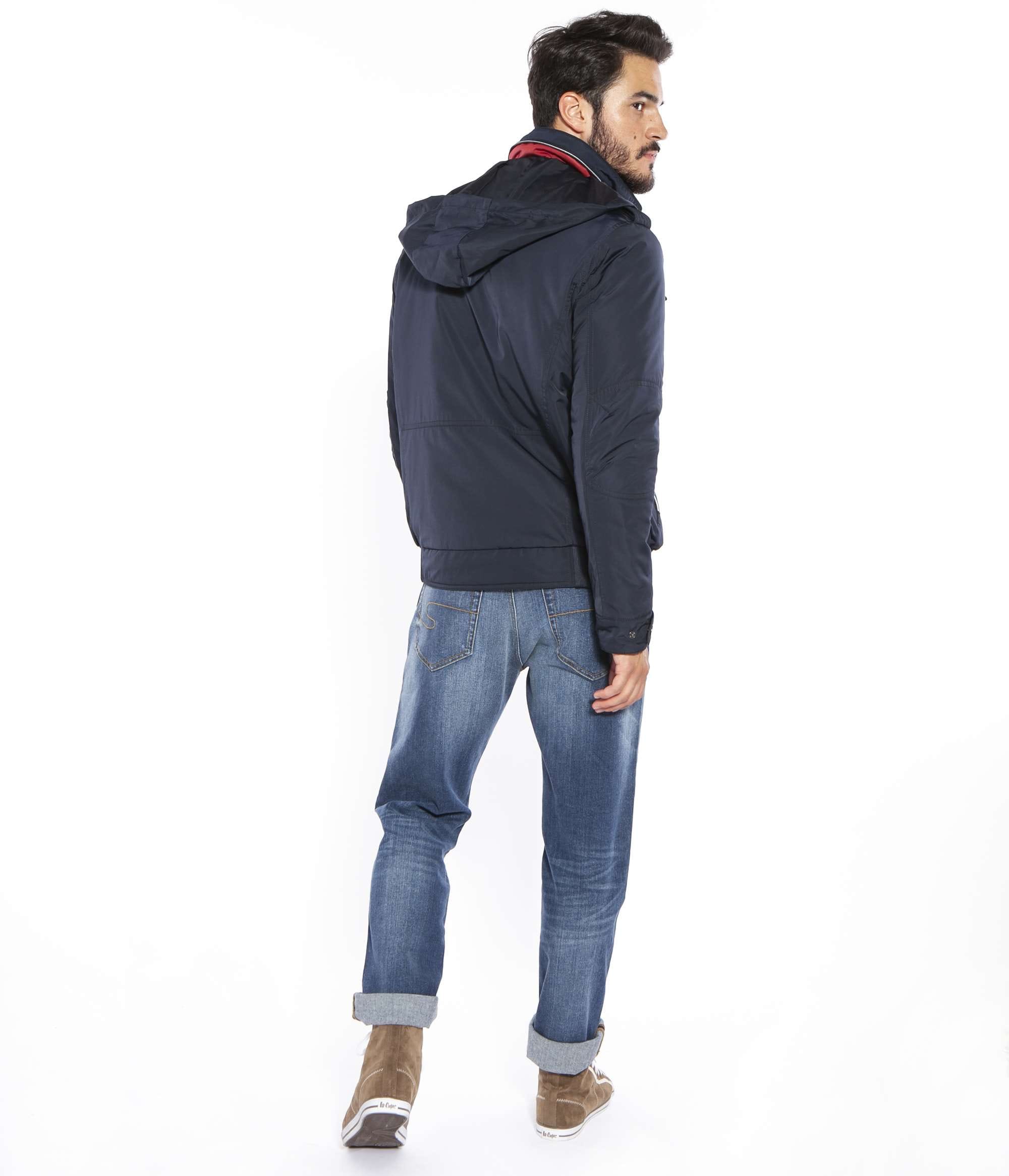 Мужская тёмно-синяя куртка стандартного кроя на подкладке. Капюшон с регулируемой застёжкой-молнией в воротнике. Куртка застёгивается на молнию и кнопки, погоны на плечах. Два боковых кармана на молнии и два нагрудных кармана. Регулировка манжеты на кнопках. Внизу на резинке.