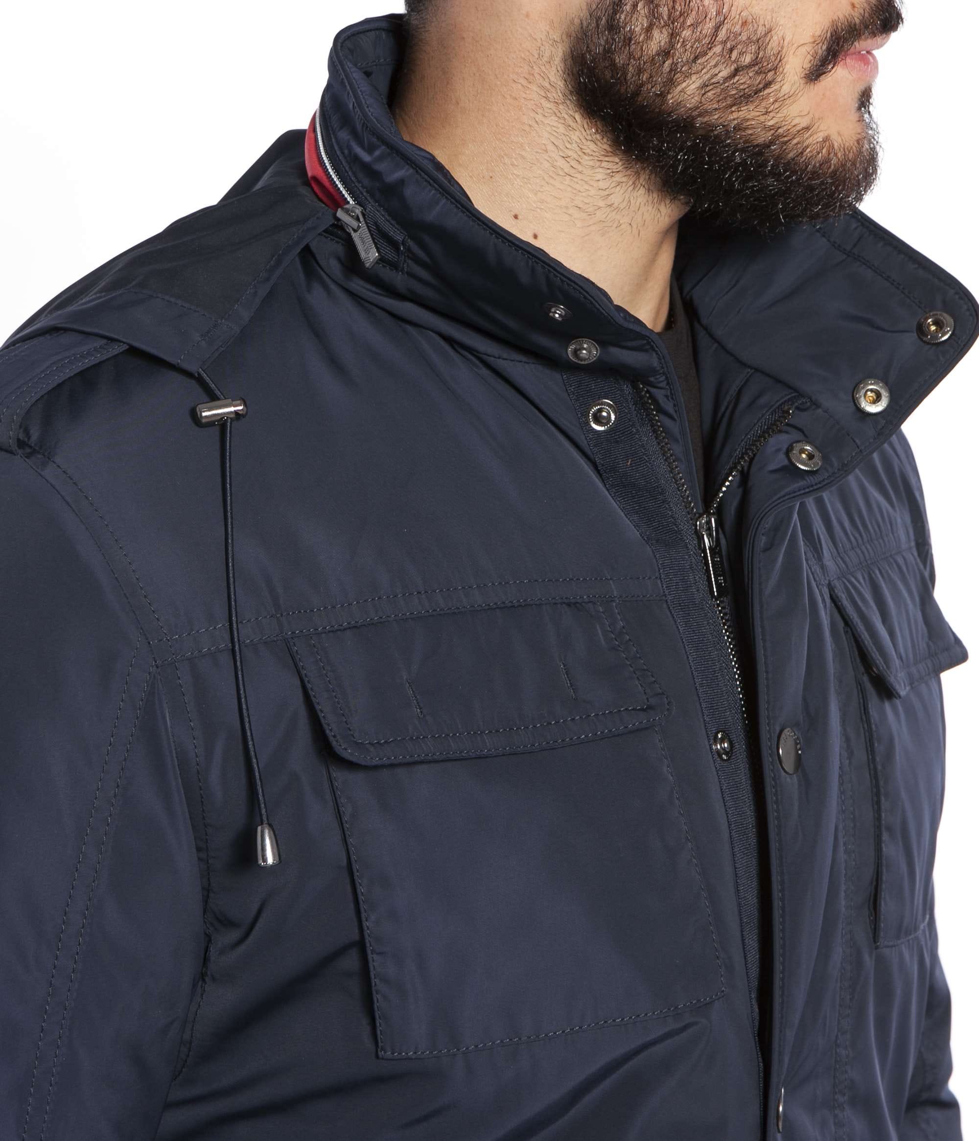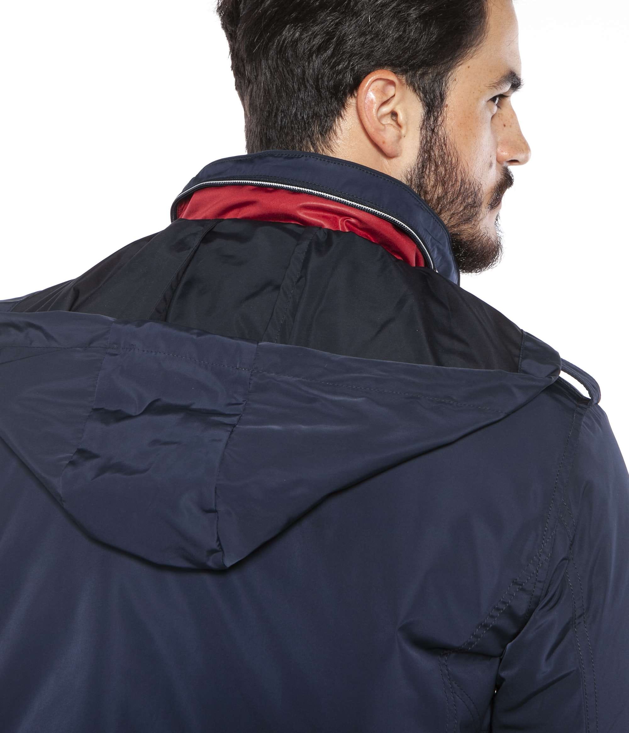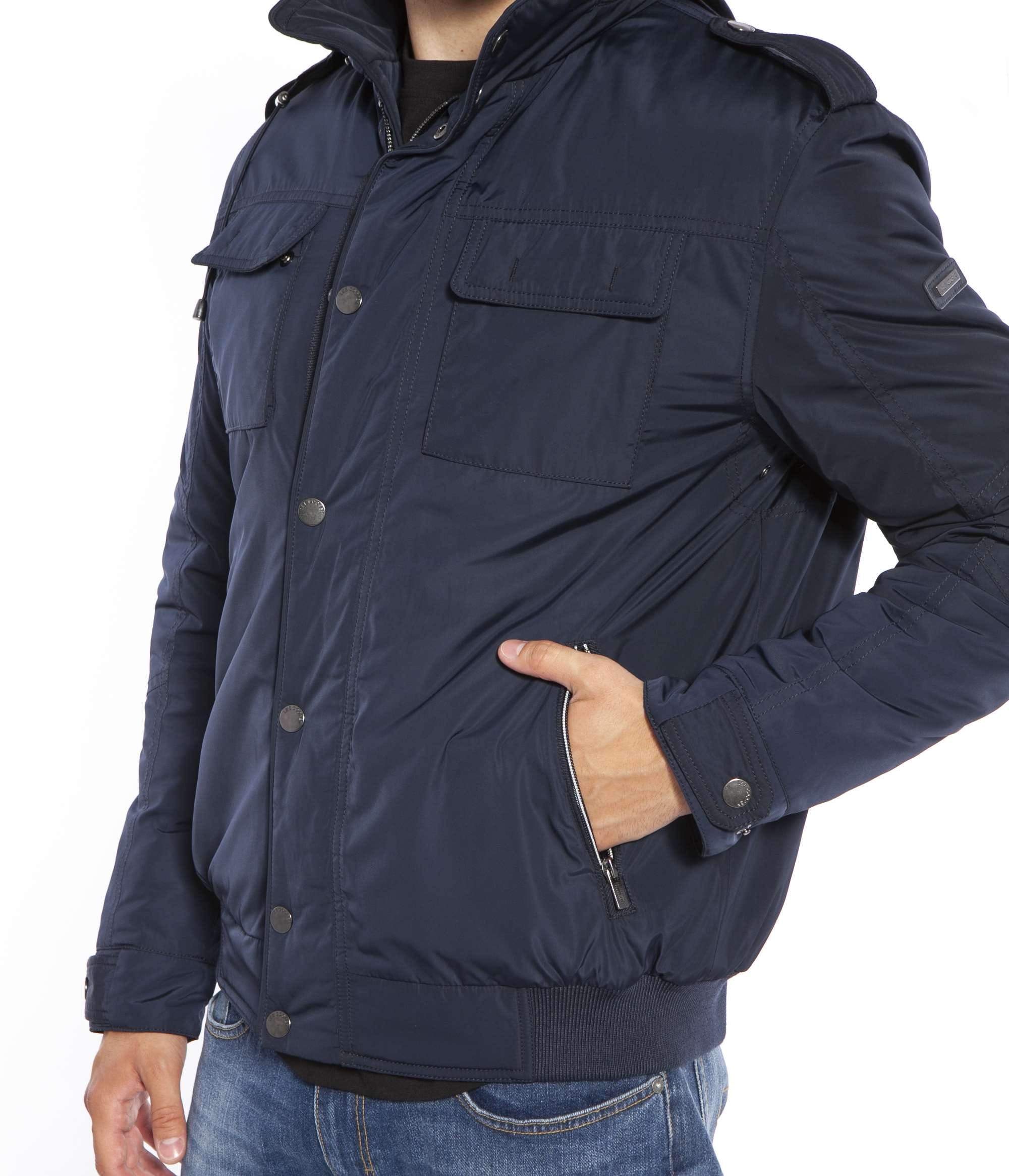 Мужская тёмно-синяя куртка стандартного кроя на подкладке. Капюшон с регулируемой застёжкой-молнией в воротнике. Куртка застёгивается на молнию и кнопки, погоны на плечах. Два боковых кармана на молнии и два нагрудных кармана. Регулировка манжеты на кнопках. Внизу на резинке.