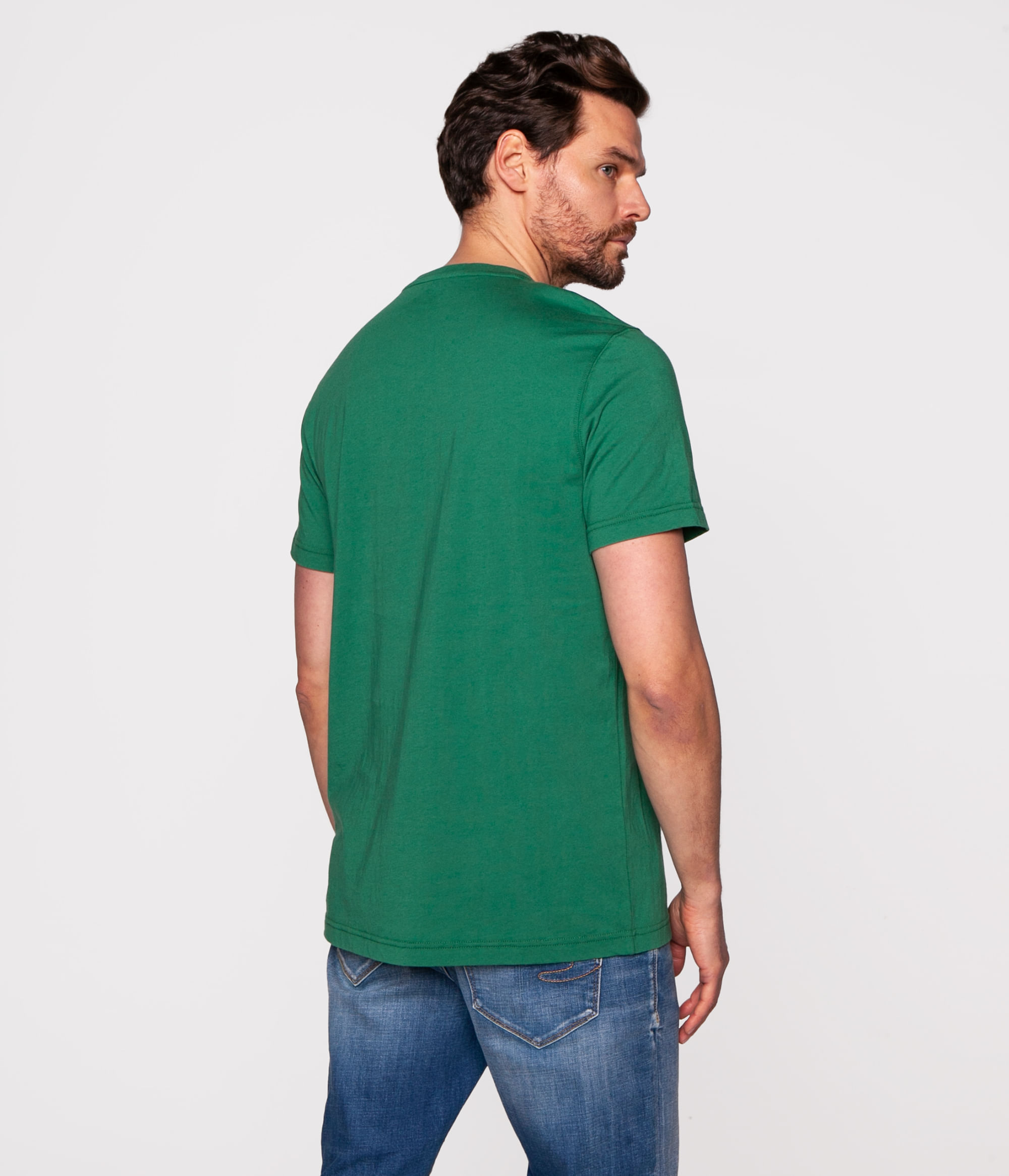 Мужская зелёная футболка с крупным принтом, прямого кроя, из 100% дышащего хлопка. Круглый вырез горла. Модель на фото ростом 186 см и носит размер L.
