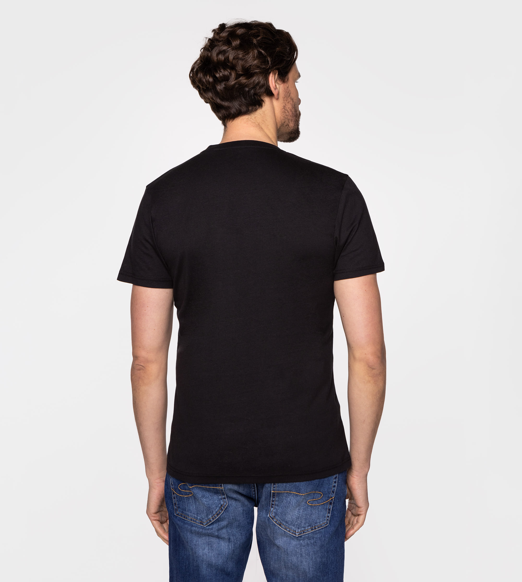 Мужская чёрная хлопковая футболка обычного кроя с круглым вырезом и принтом спереди. Наша фотомодель ростом 186 см. и носит размер L.