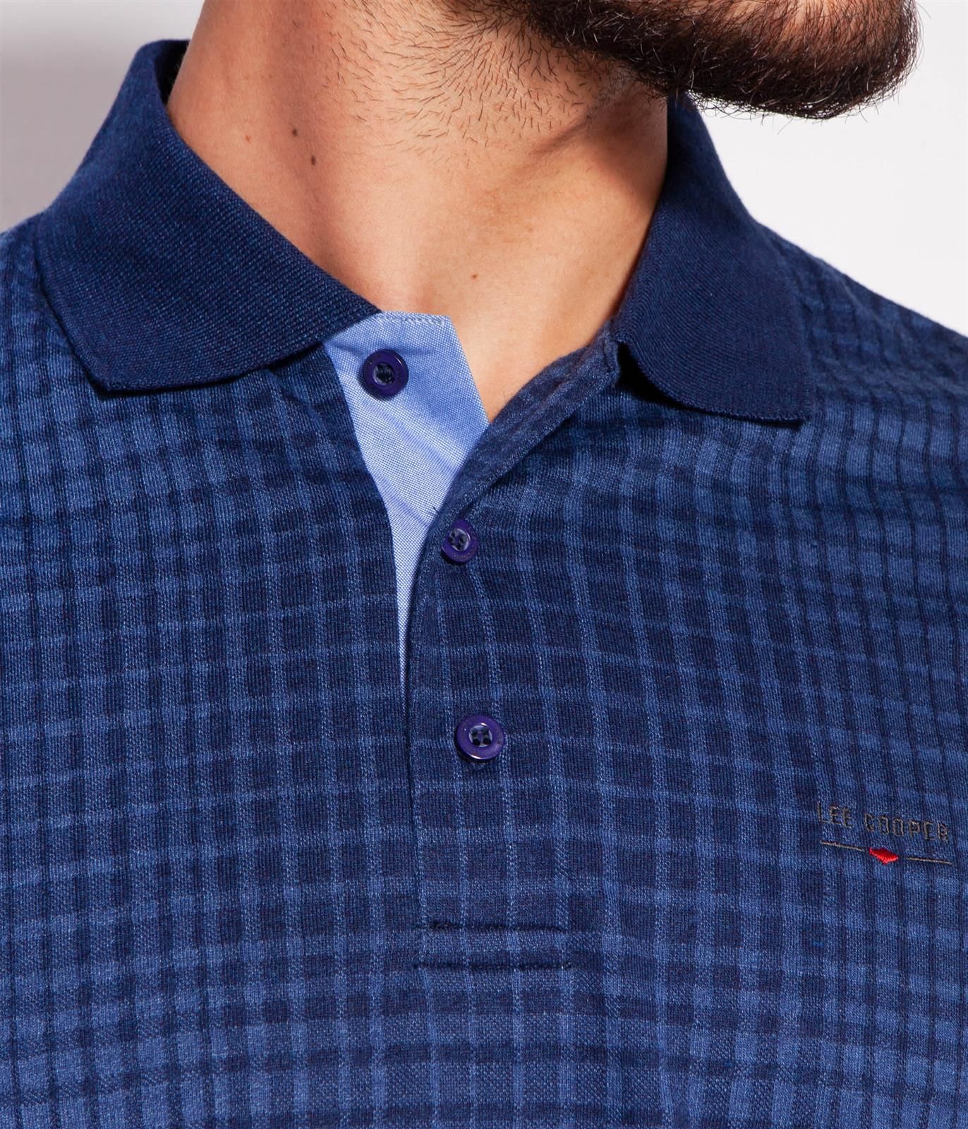 Мужское поло стандартного кроя из хлопчатобумажной ткани с мелкой клеткой по всей поверхности. Модель украшена небольшой вышивкой с логотипом Lee Cooper спереди слева. На пуговицах, с короткими рукавами, классический воротник, небольшие боковые разрезы.