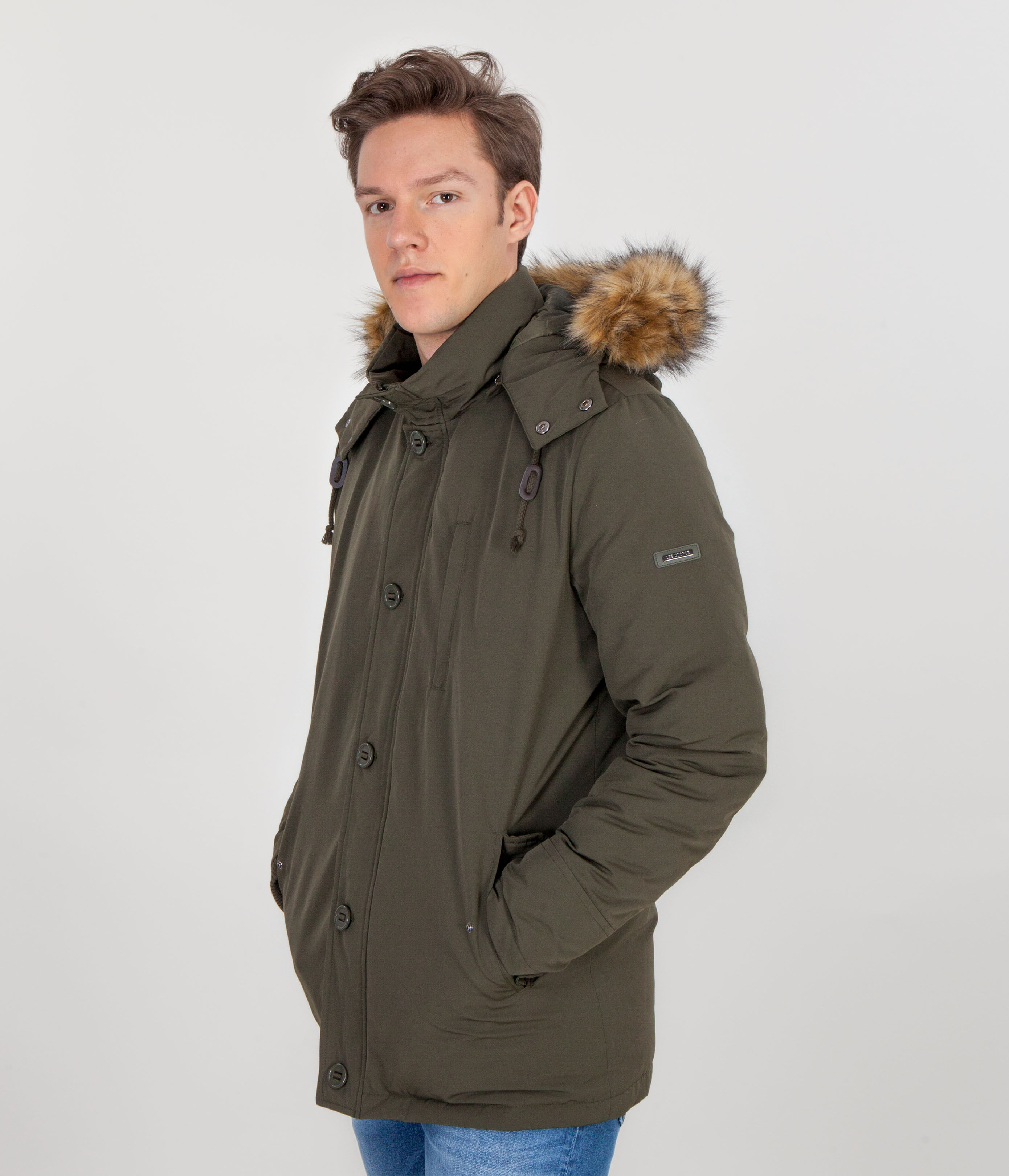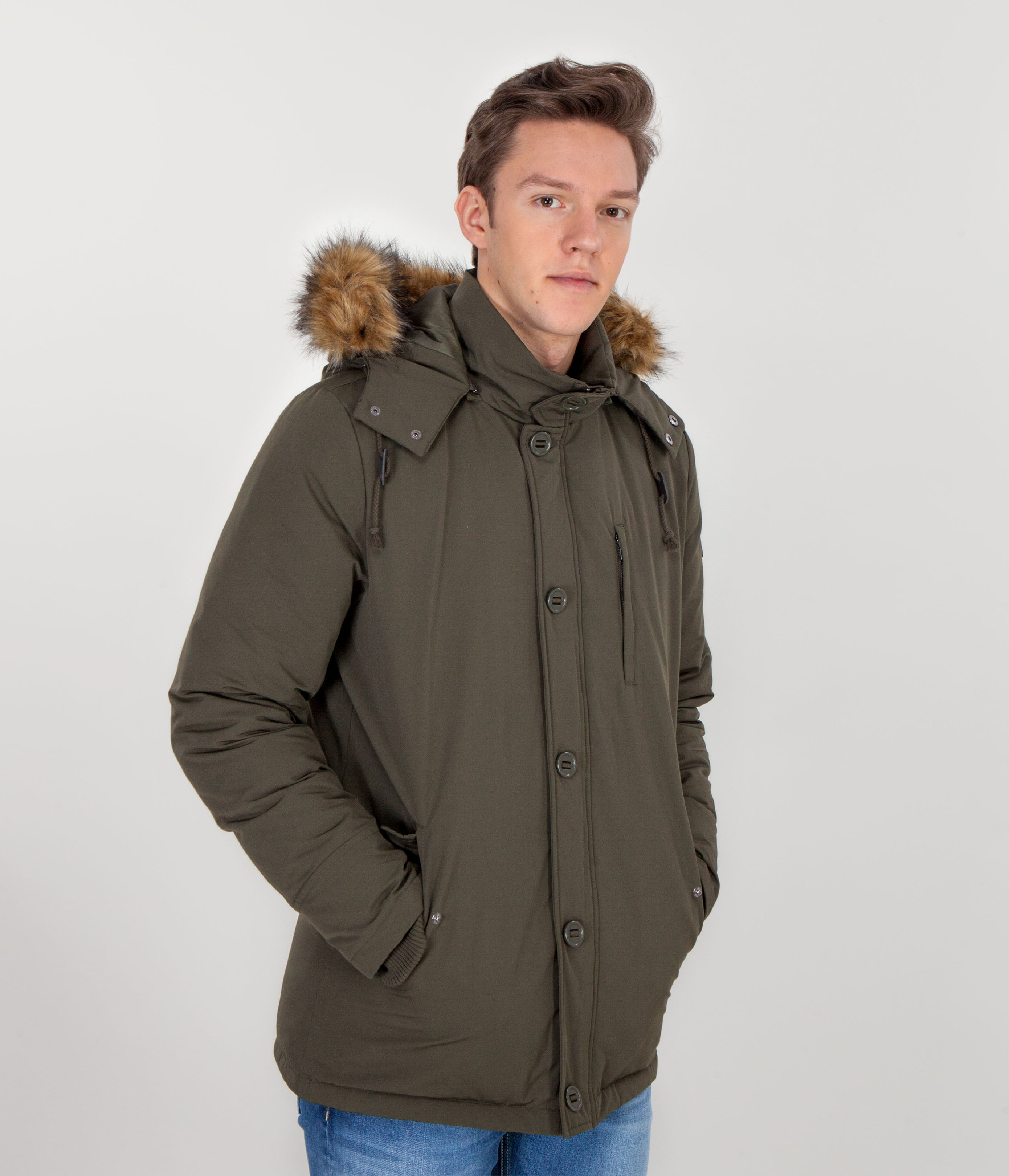 Мужской пуховик с капюшоном, украшен искусственным мехом, который отстёгивается. Пуховик выполнен из ветро- и водонепроницаемого текстиля последнего поколения, утеплитель из натурального пуха и пера. Детали: прямой крой, застёжка на молнию и пуговицы, боковые карманы на кнопках.