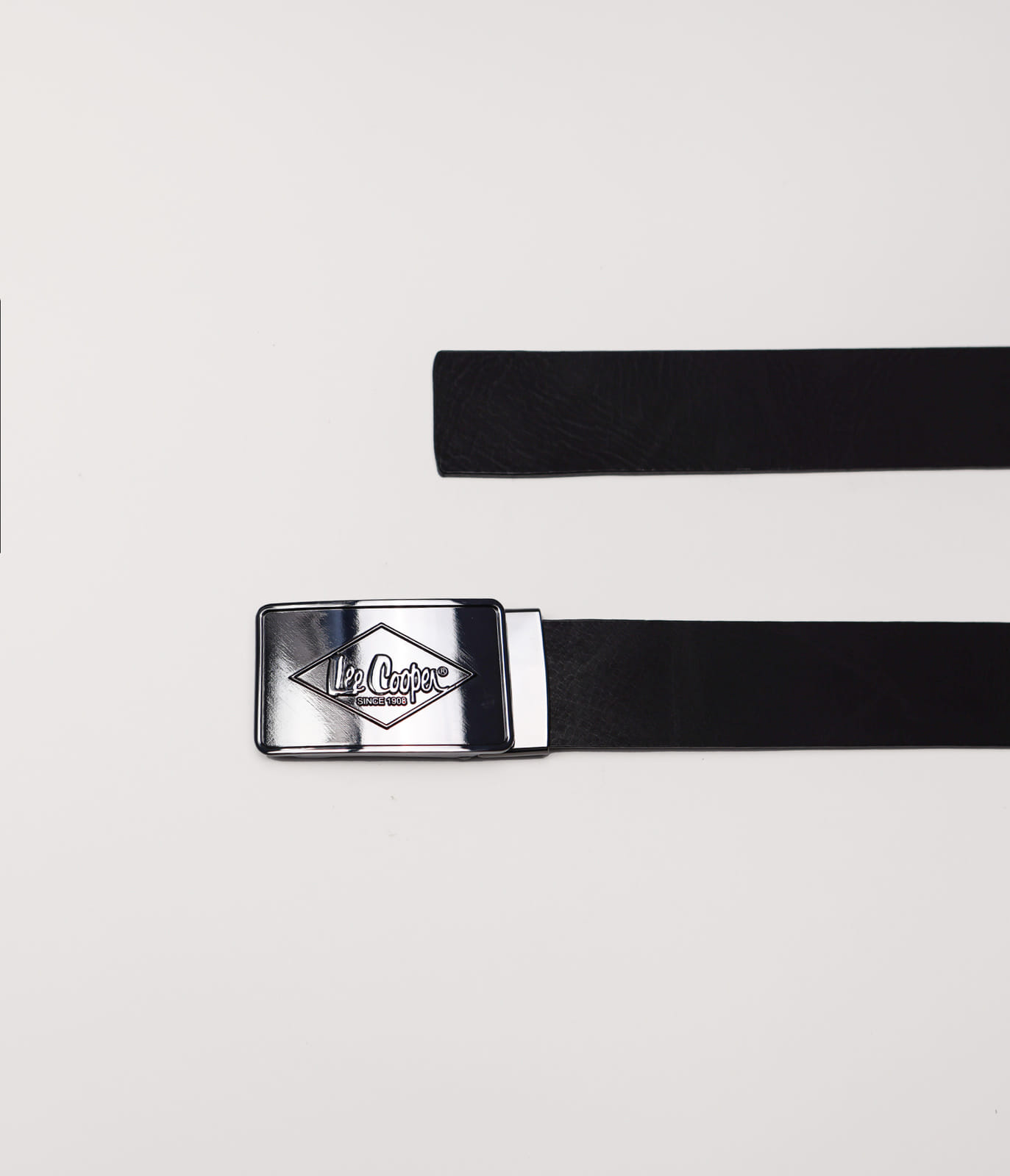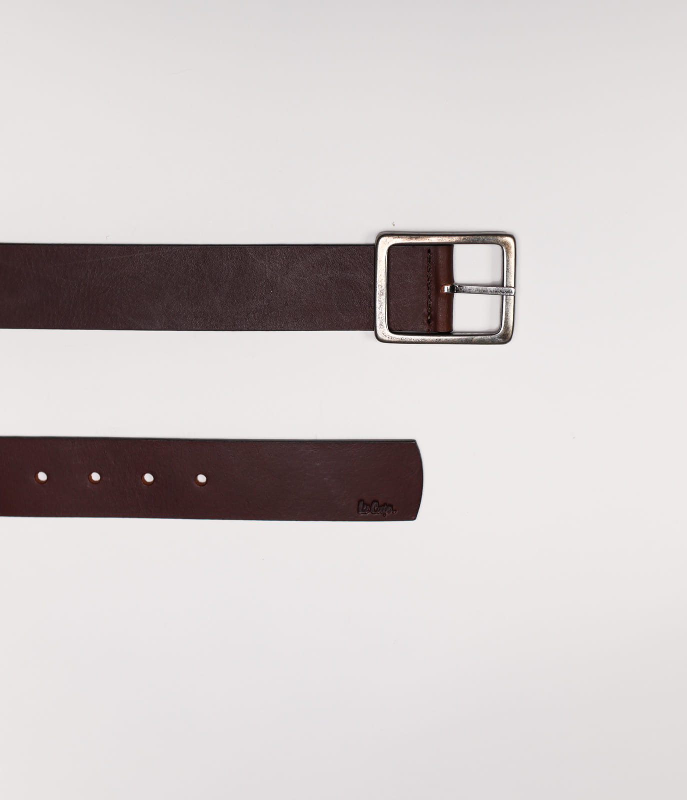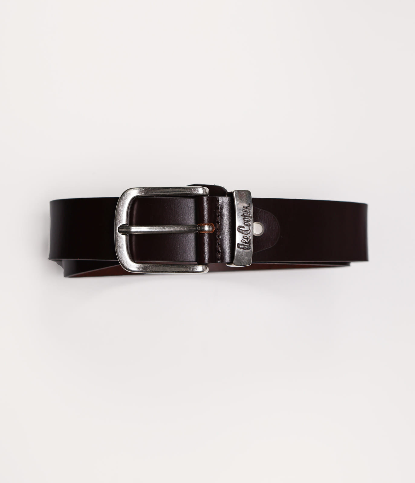 Мужской, гладкий, кожаный ремень, изготовленный из кожи со сдержанным эффектом, имеет тонкую металлическую пряжку с логотипом Lee Cooper.