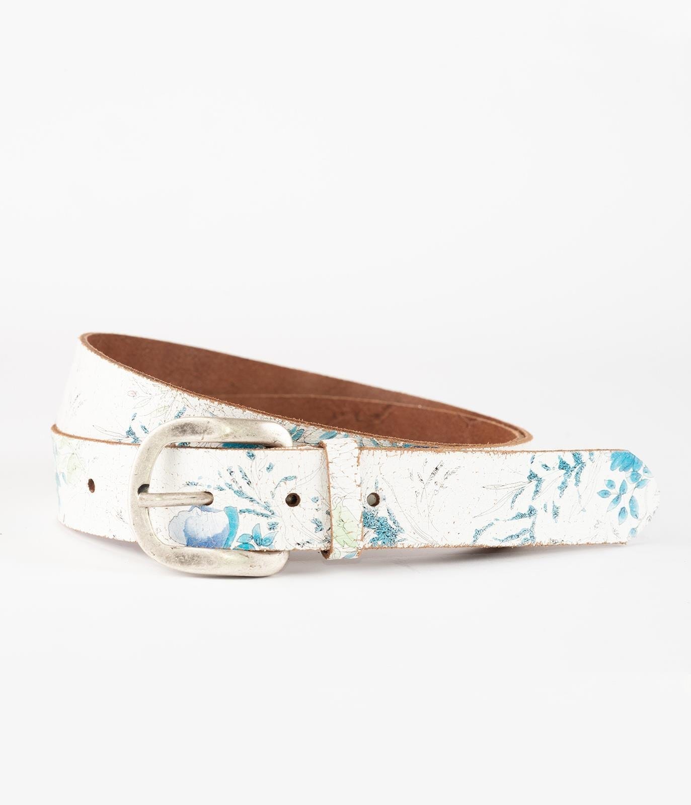 Кожаный женский ремень с классической пряжкой и нежным цветочным мотивом на белом фоне.