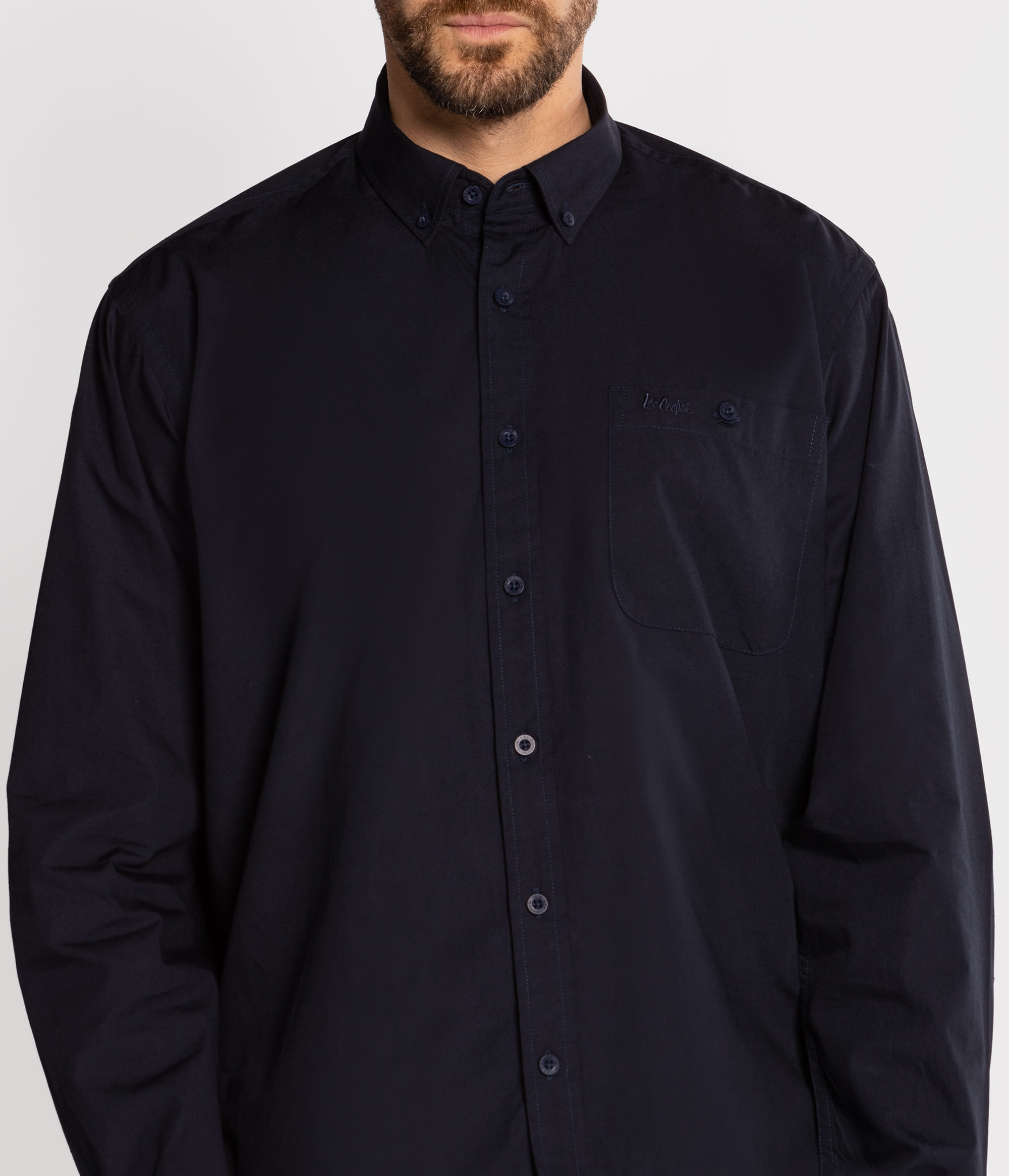 Мужская тёмно-синяя рубашка с длинными рукавами повседневного кроя comfort fit из 100% хлопка. У нашей модели на фото рост 186 см, размер L.