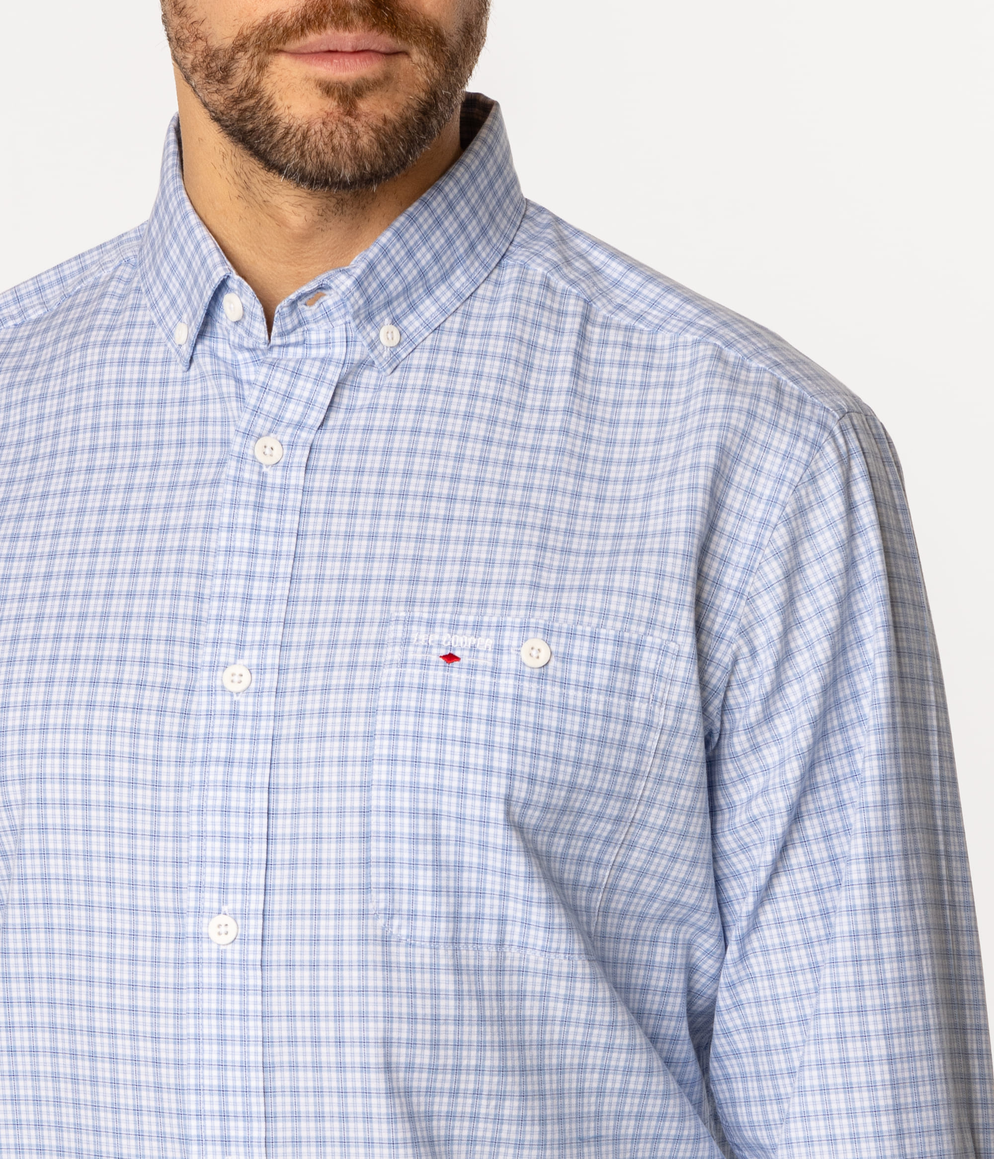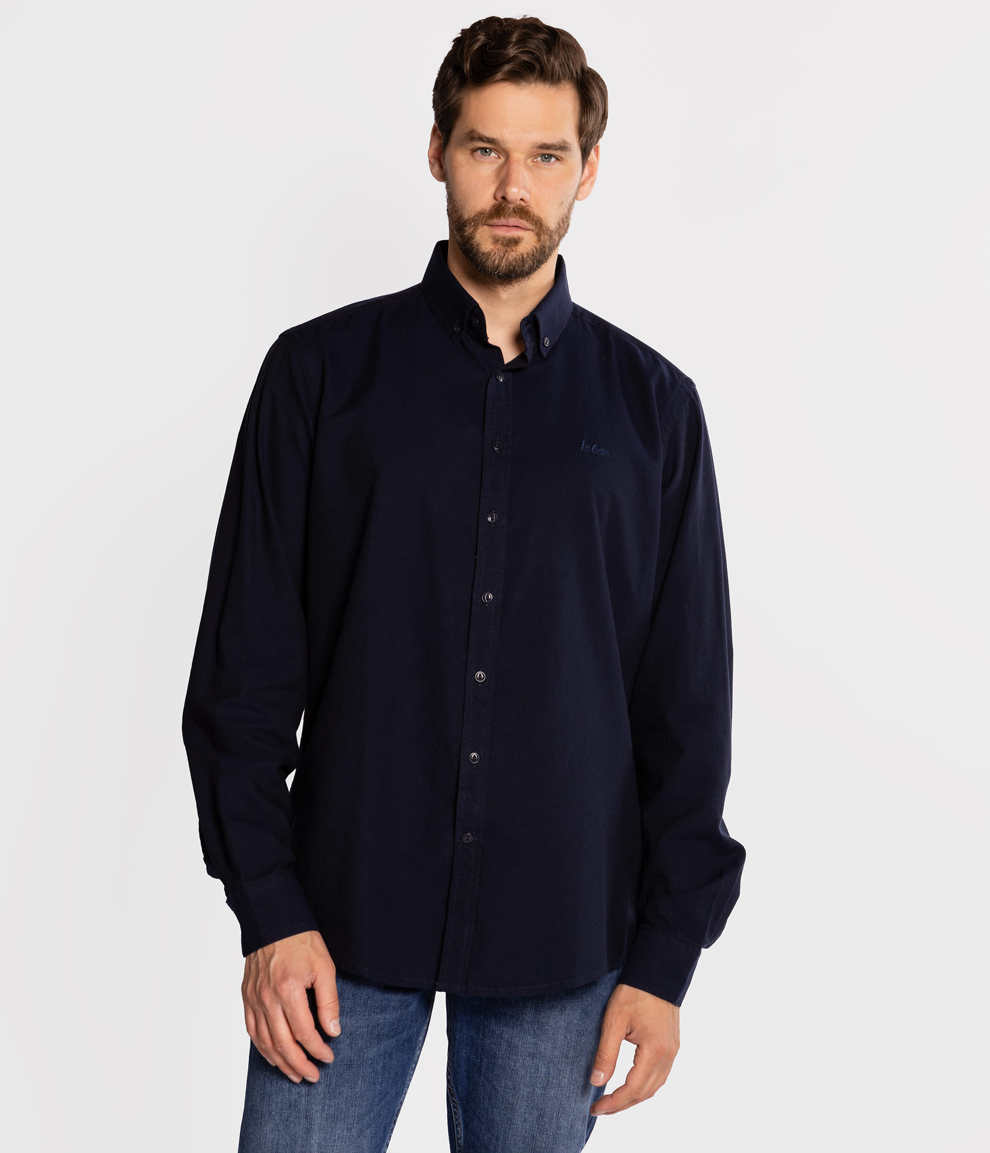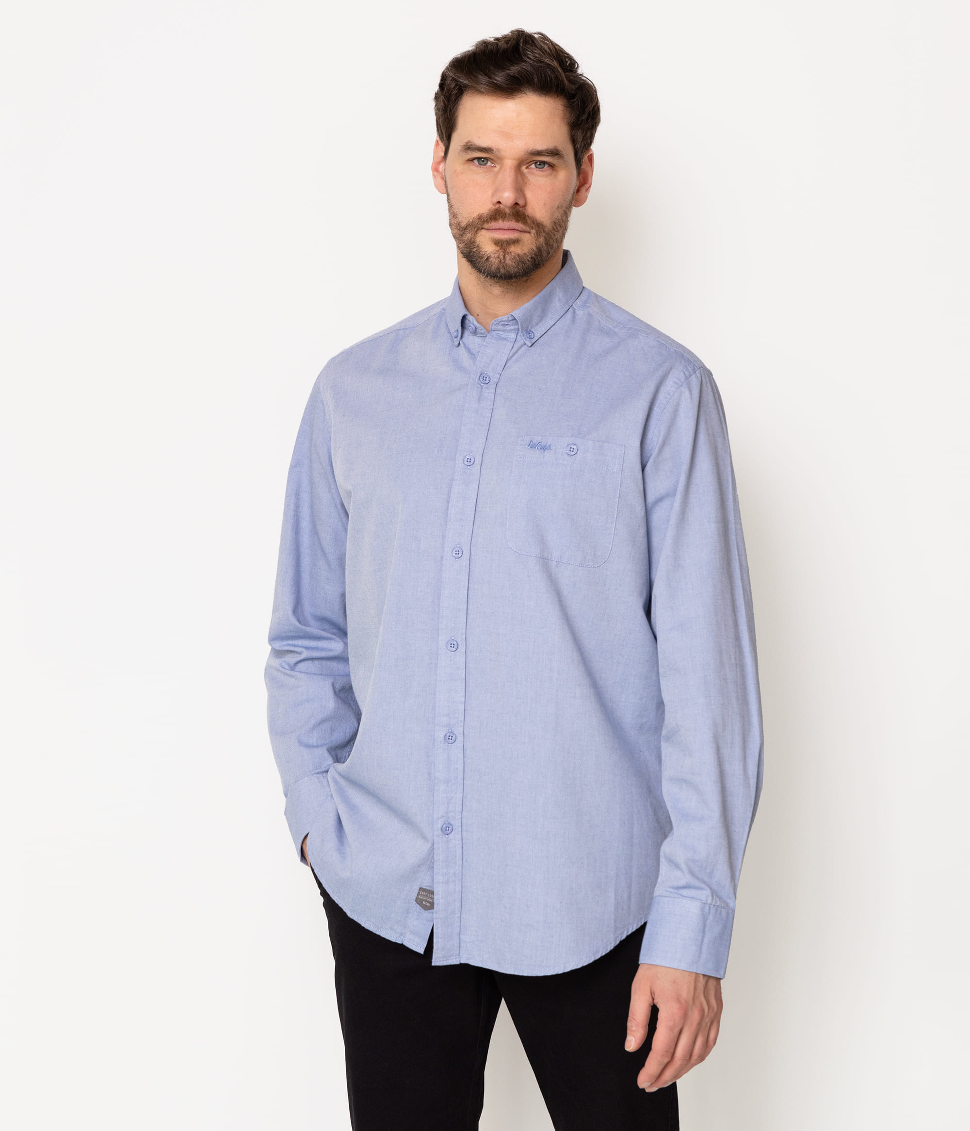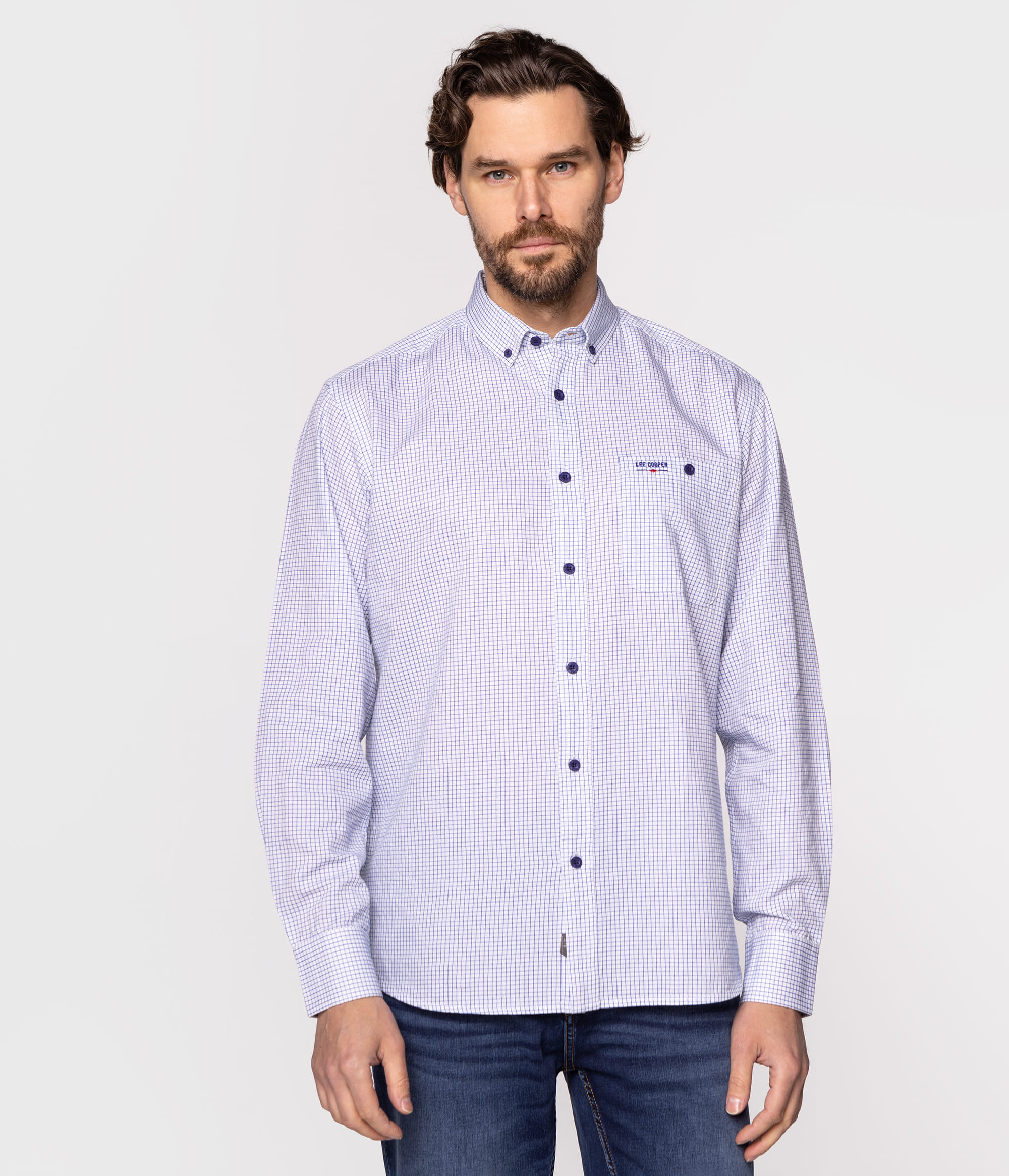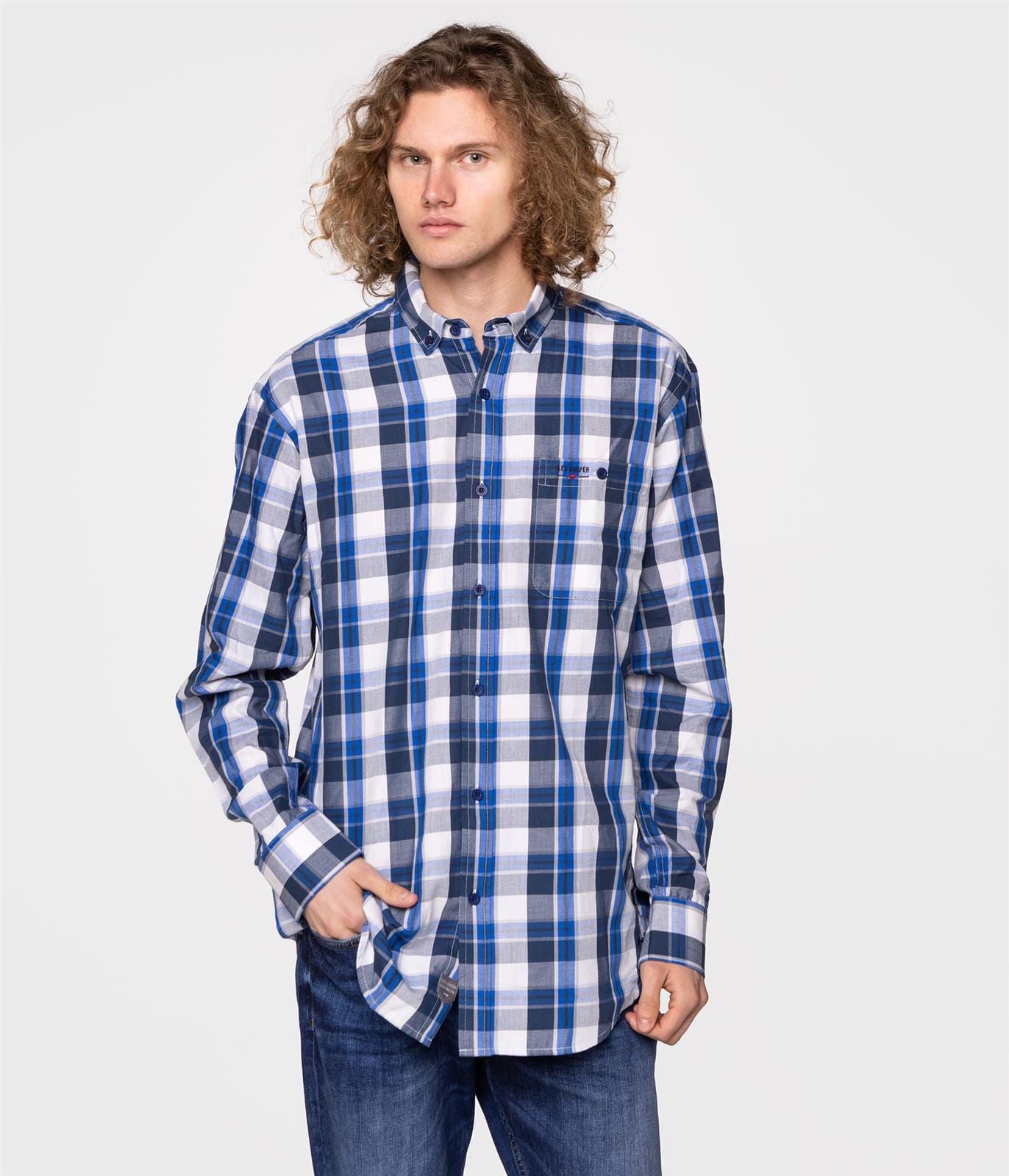 Мужская рубашка с длинными рукавами повседневного кроя comfort fit из 100% хлопка. Воротник и карман на пуговицах. Спереди украшена тонкой фирменной вышивкой. Имеется в разнообразных цветах. У наших моделей рост 186 см. и размер L.