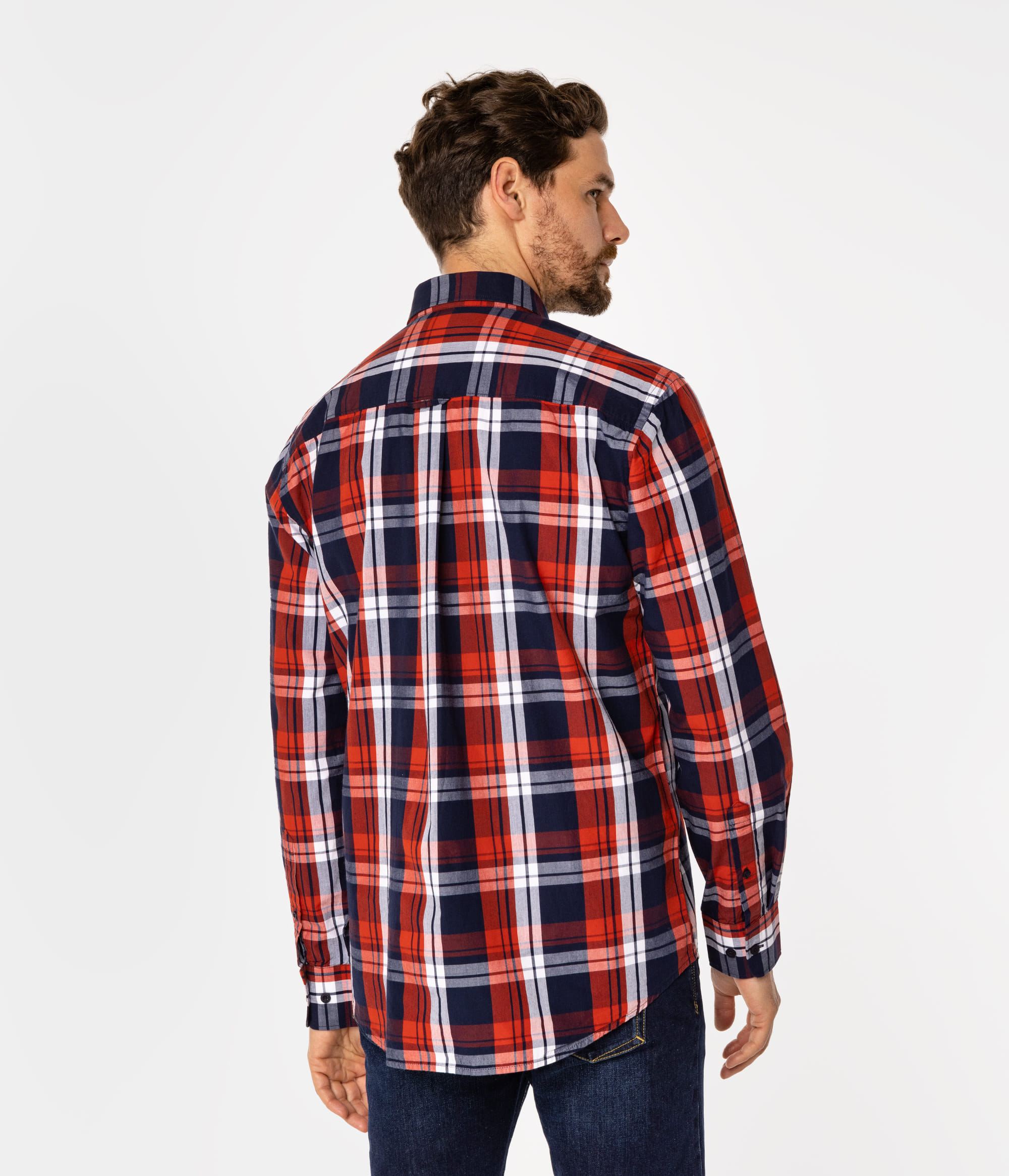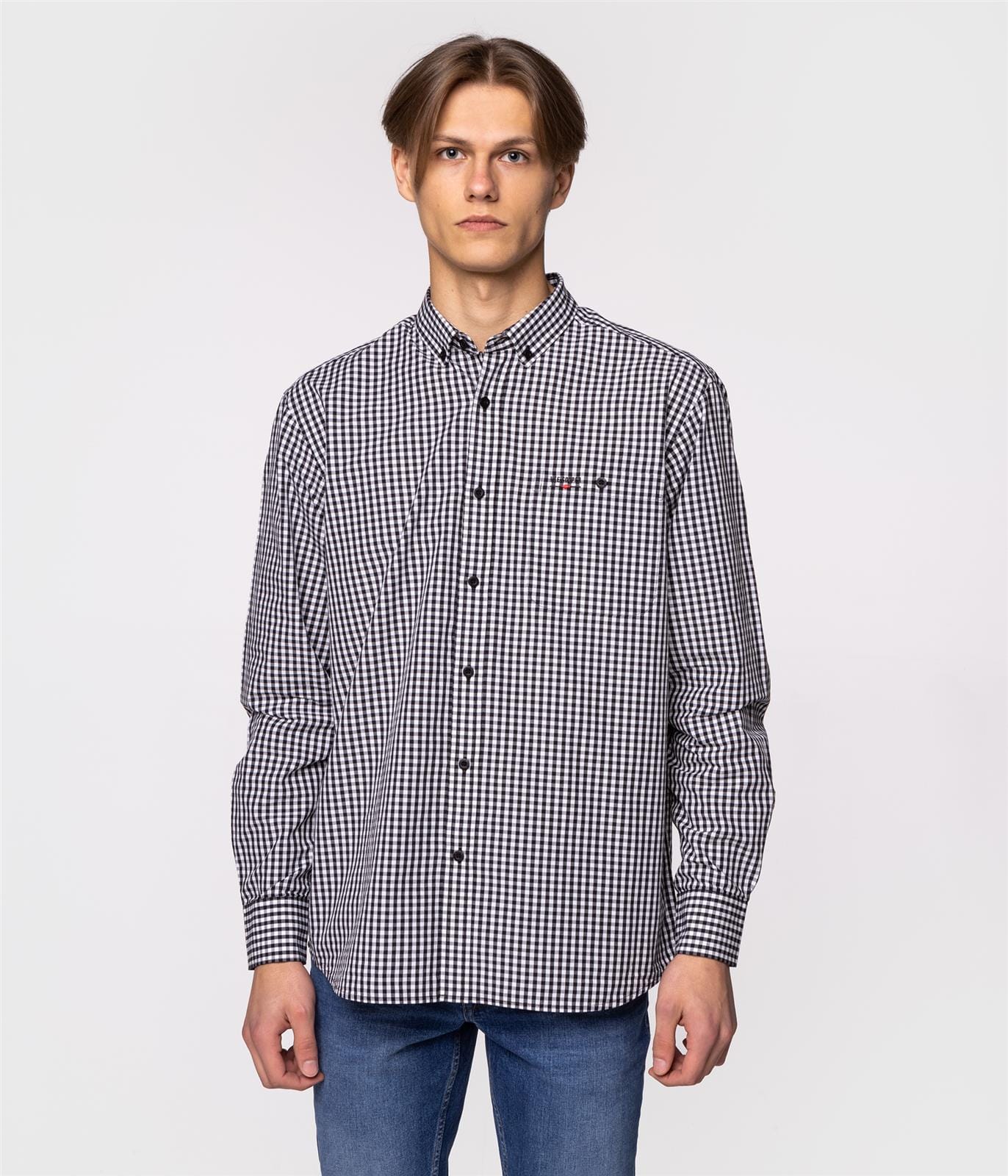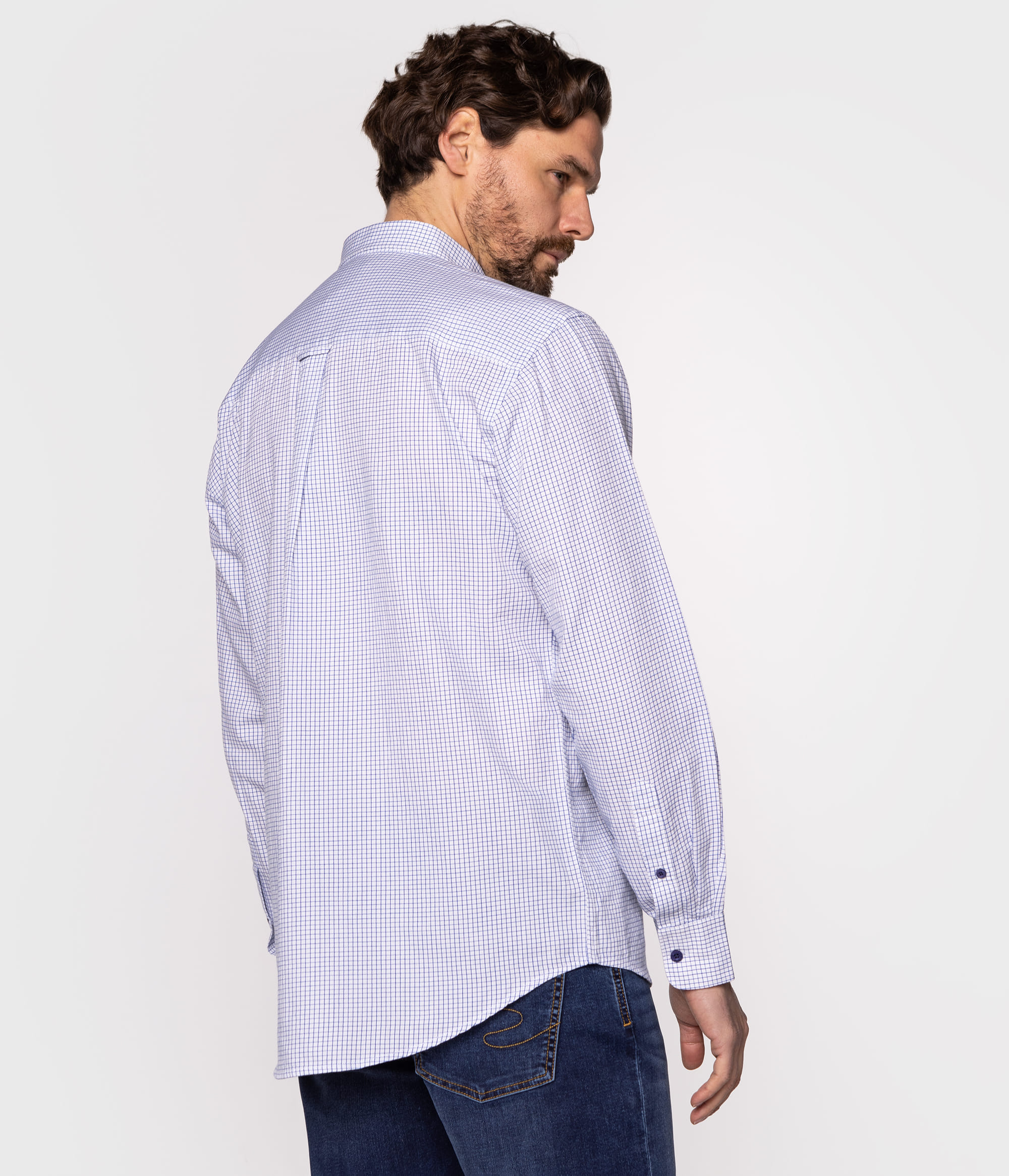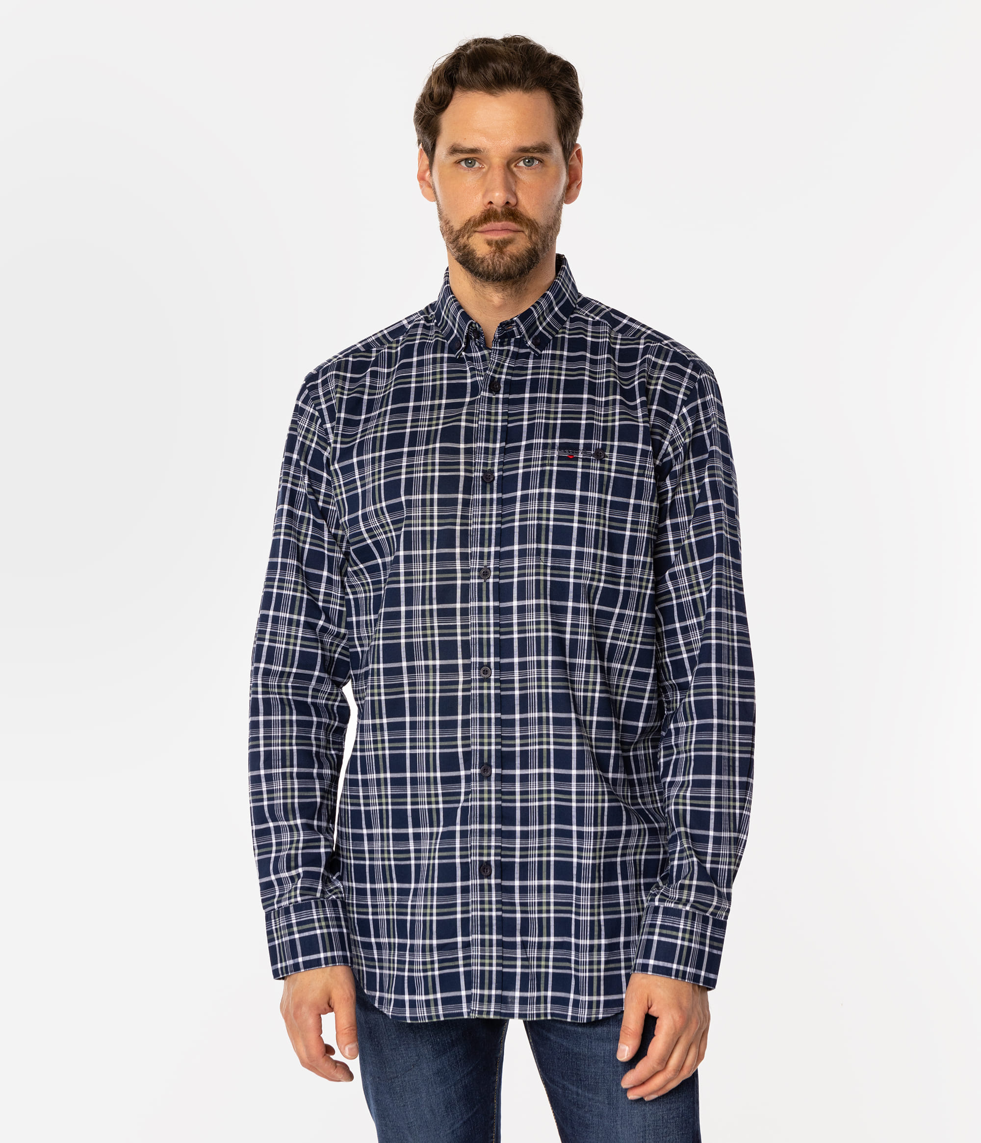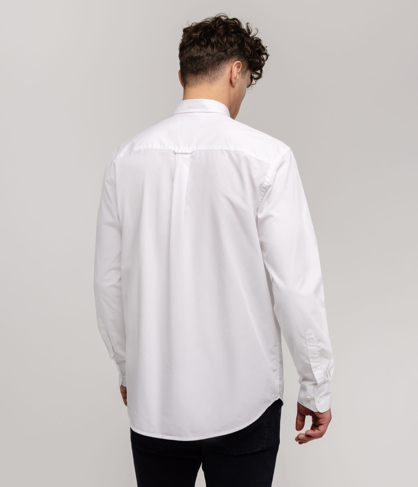Мужская рубашка с длинными рукавами повседневного кроя comfort fit из 100% хлопка. Воротник и карман на пуговицах. Спереди украшена тонкой фирменной вышивкой. Имеется в разнообразных цветах. У наших моделей рост 186 см. и размер L.