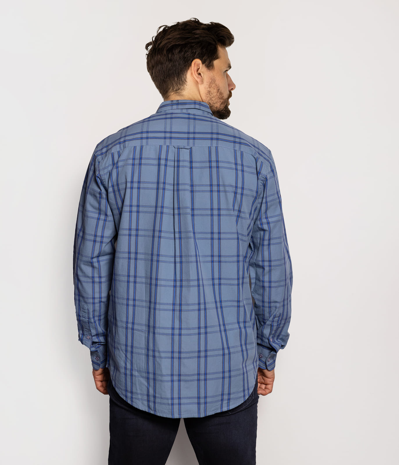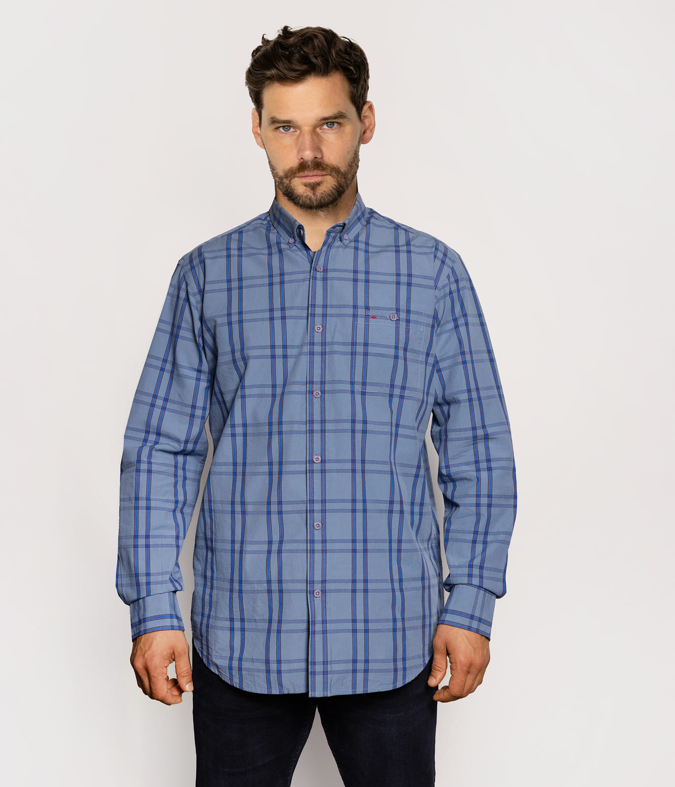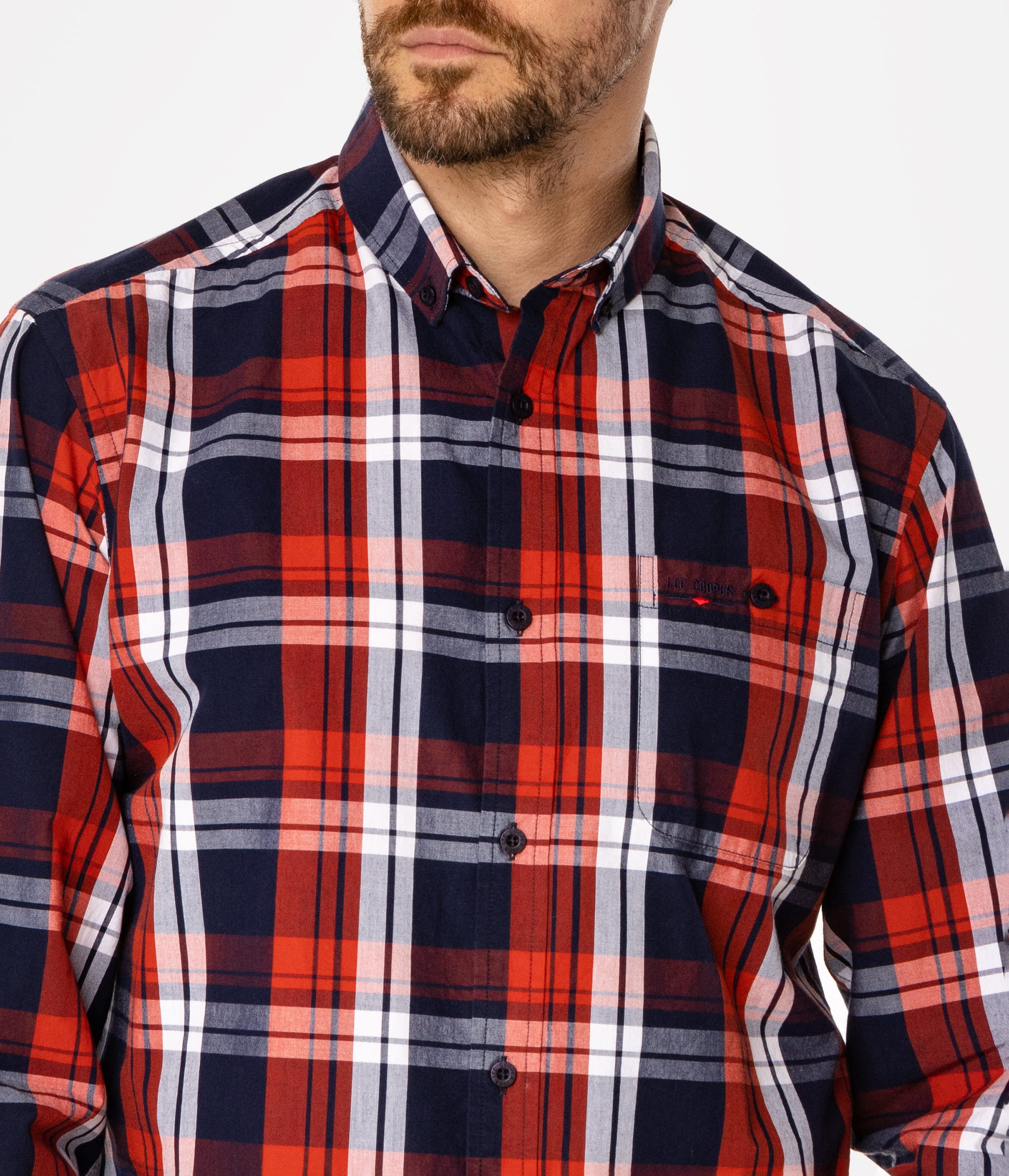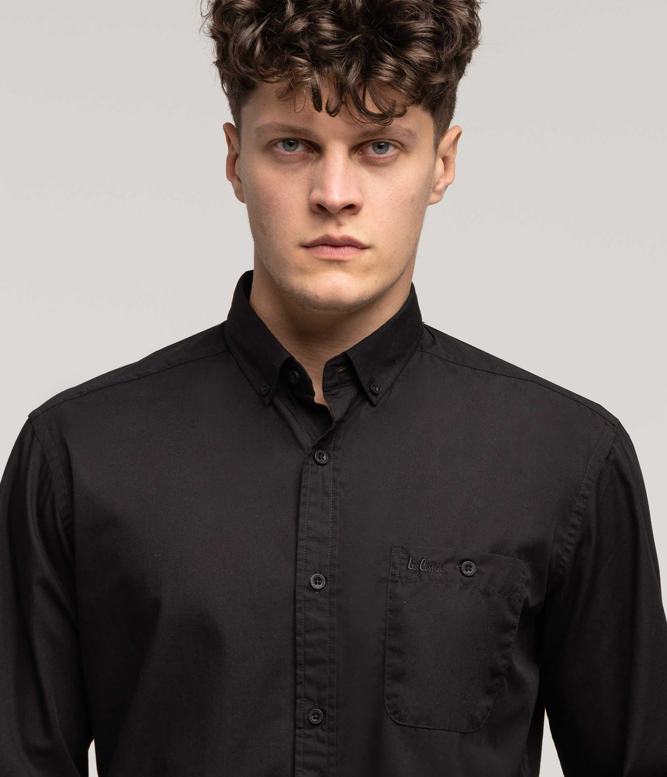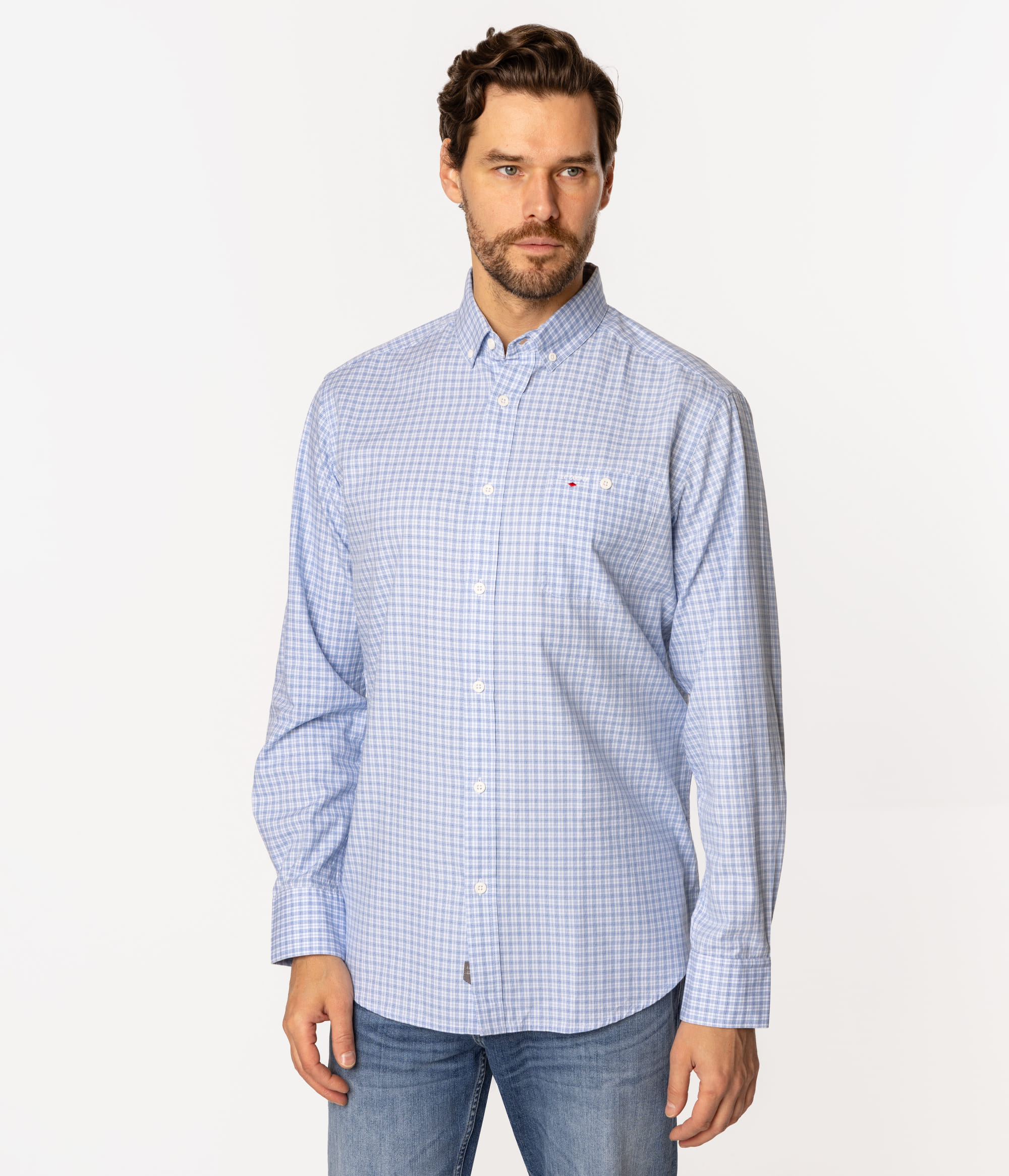 Мужская рубашка с длинными рукавами повседневного кроя comfort fit из 100% хлопка. Воротник и карман на пуговицах. Спереди украшена тонкой фирменной вышивкой. Имеется в разнообразных цветах. У наших моделей рост 186 см. и размер L.
