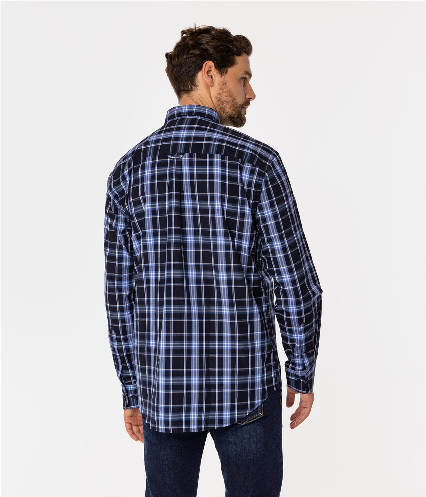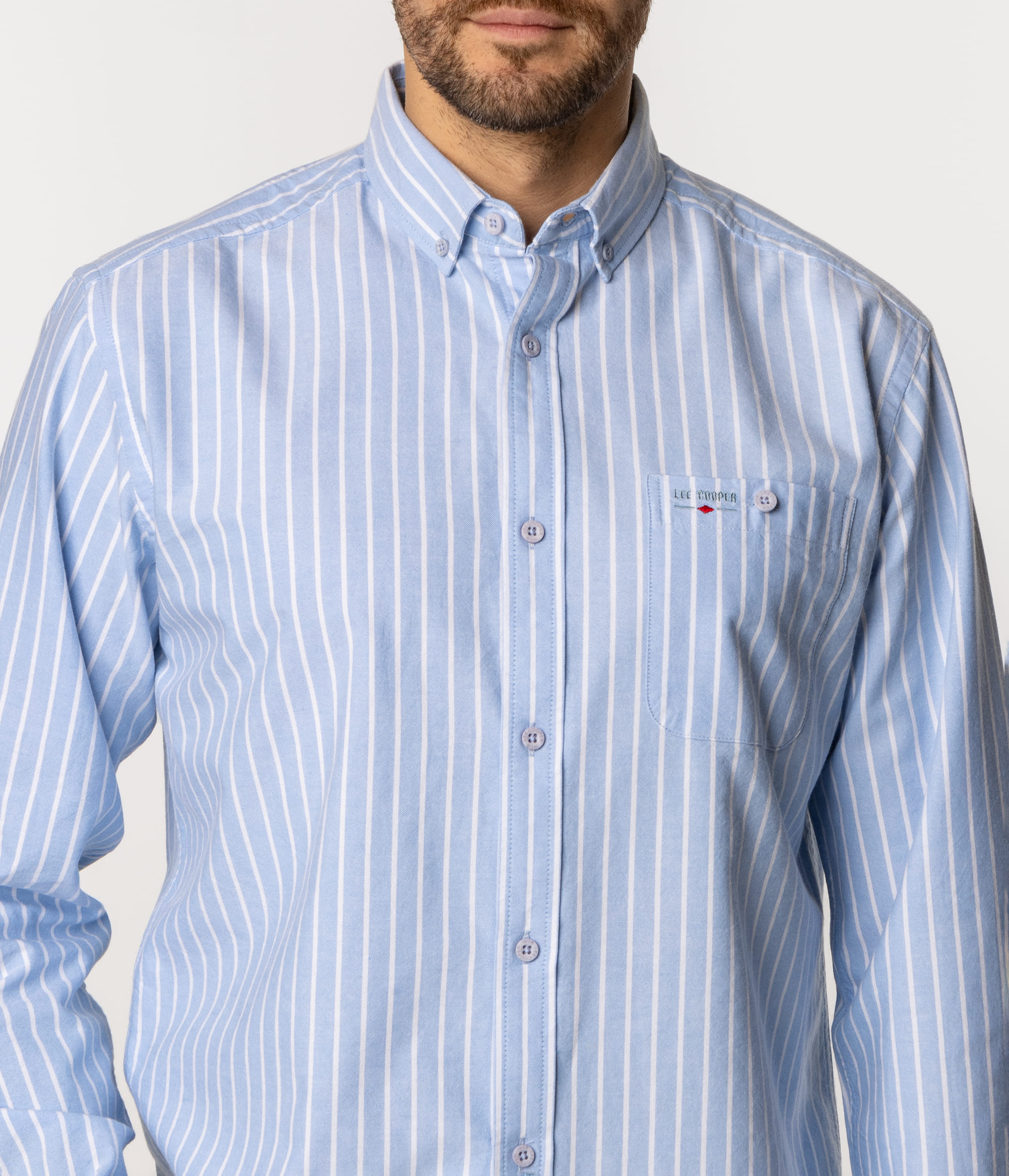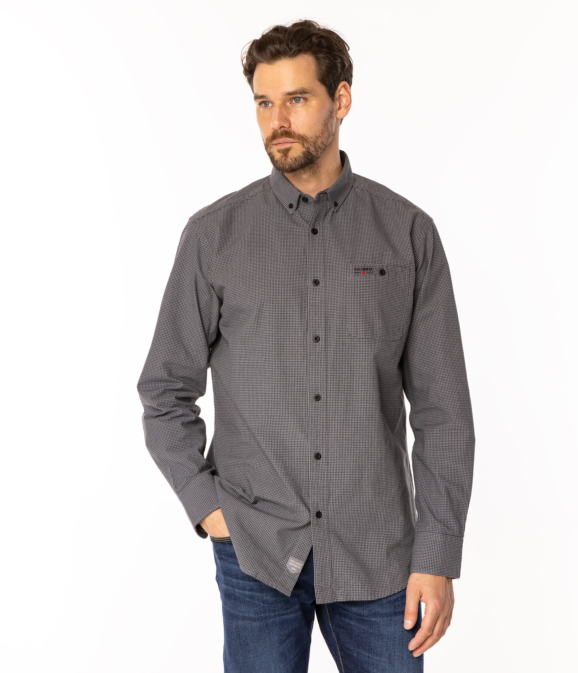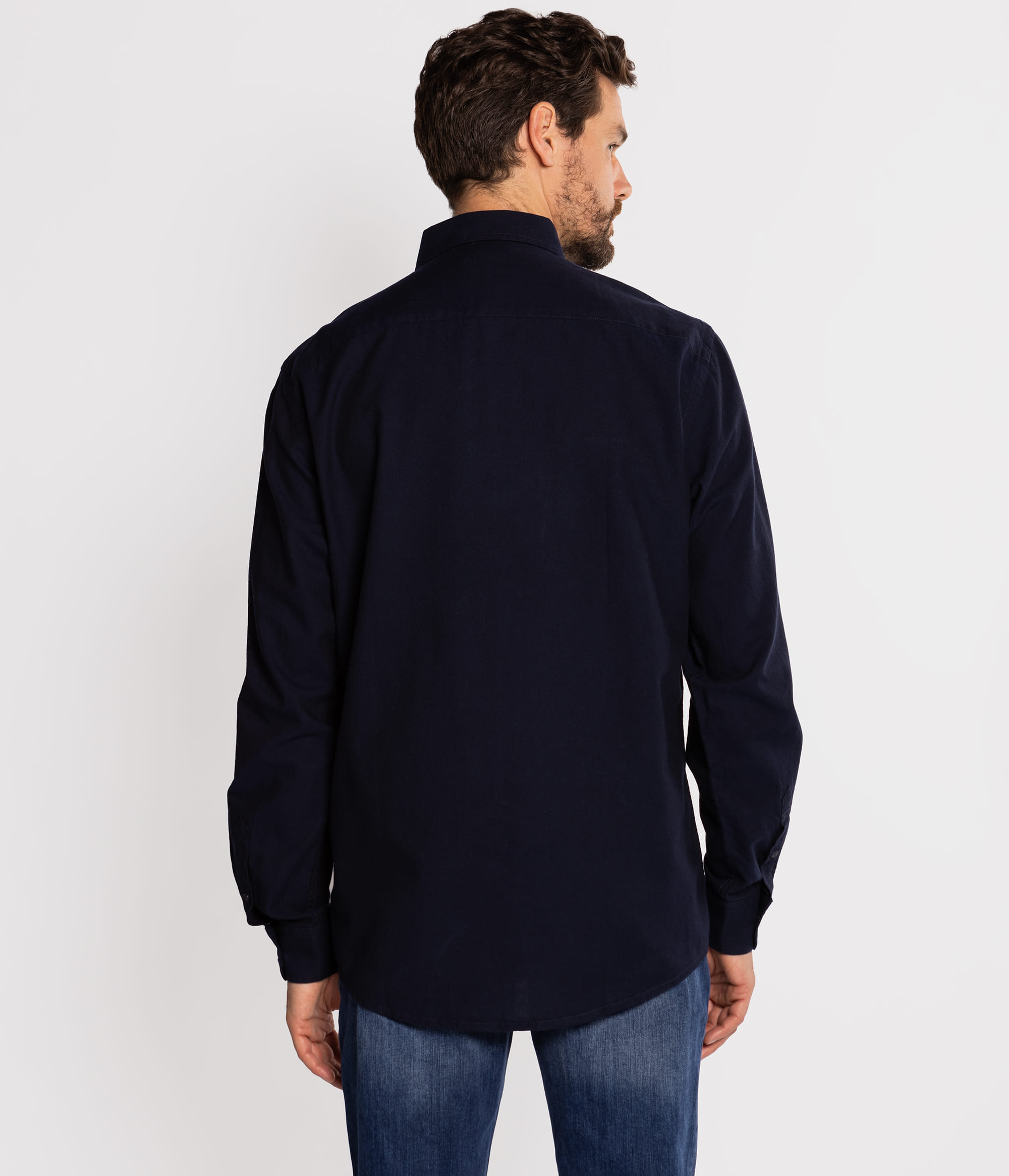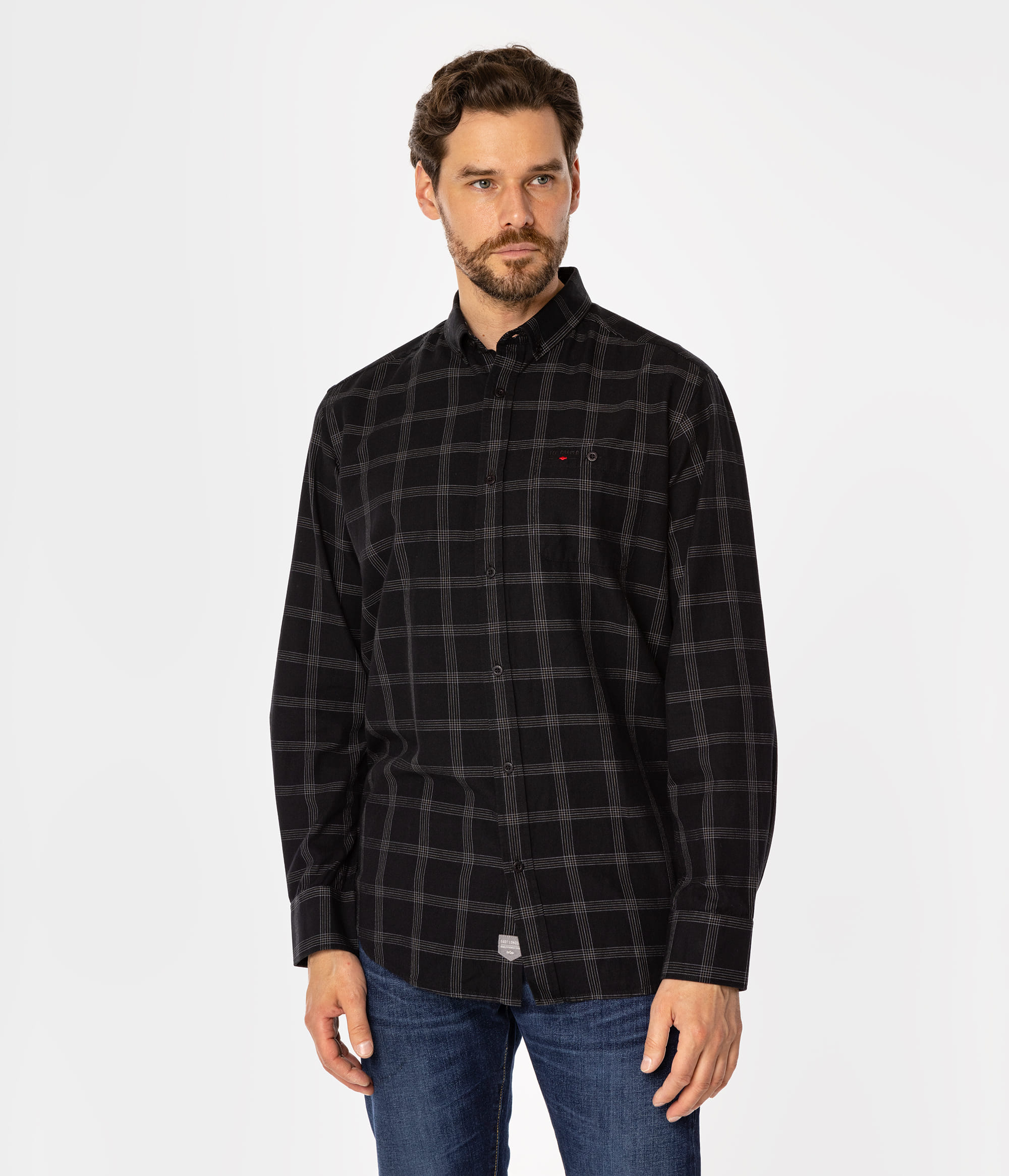 Мужская рубашка с длинными рукавами повседневного кроя comfort fit из 100% хлопка. Воротник и карман на пуговицах. Спереди украшена тонкой фирменной вышивкой. Имеется в разнообразных цветах. У наших моделей рост 186 см. и размер L.