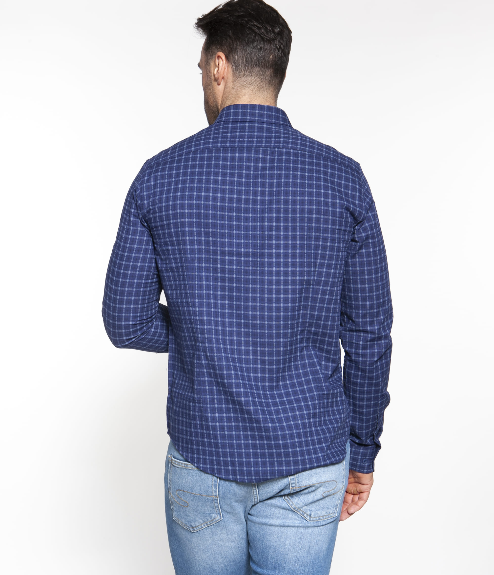 Мужская рубашка в тёмно-синюю клетку с длинным рукавом классического кроя REGULAR fit. Выполнена из 100% хлопка, с логотипом бренда на груди.
