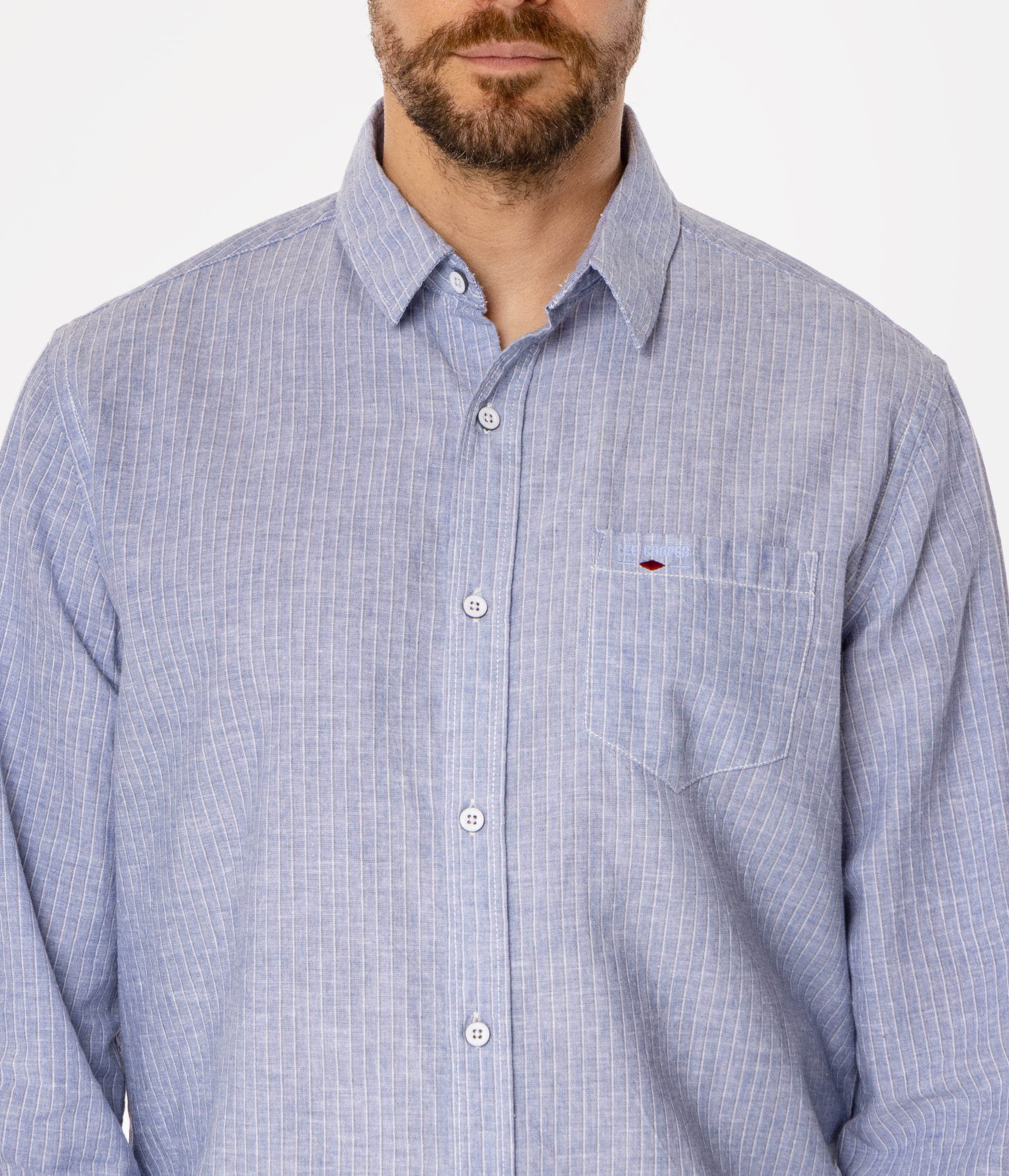 Мужская голубая рубашка обычного кроя regular, длинные рукава, классический воротник, открытый карман спереди. У нашей модели рост 186 см., размер L.