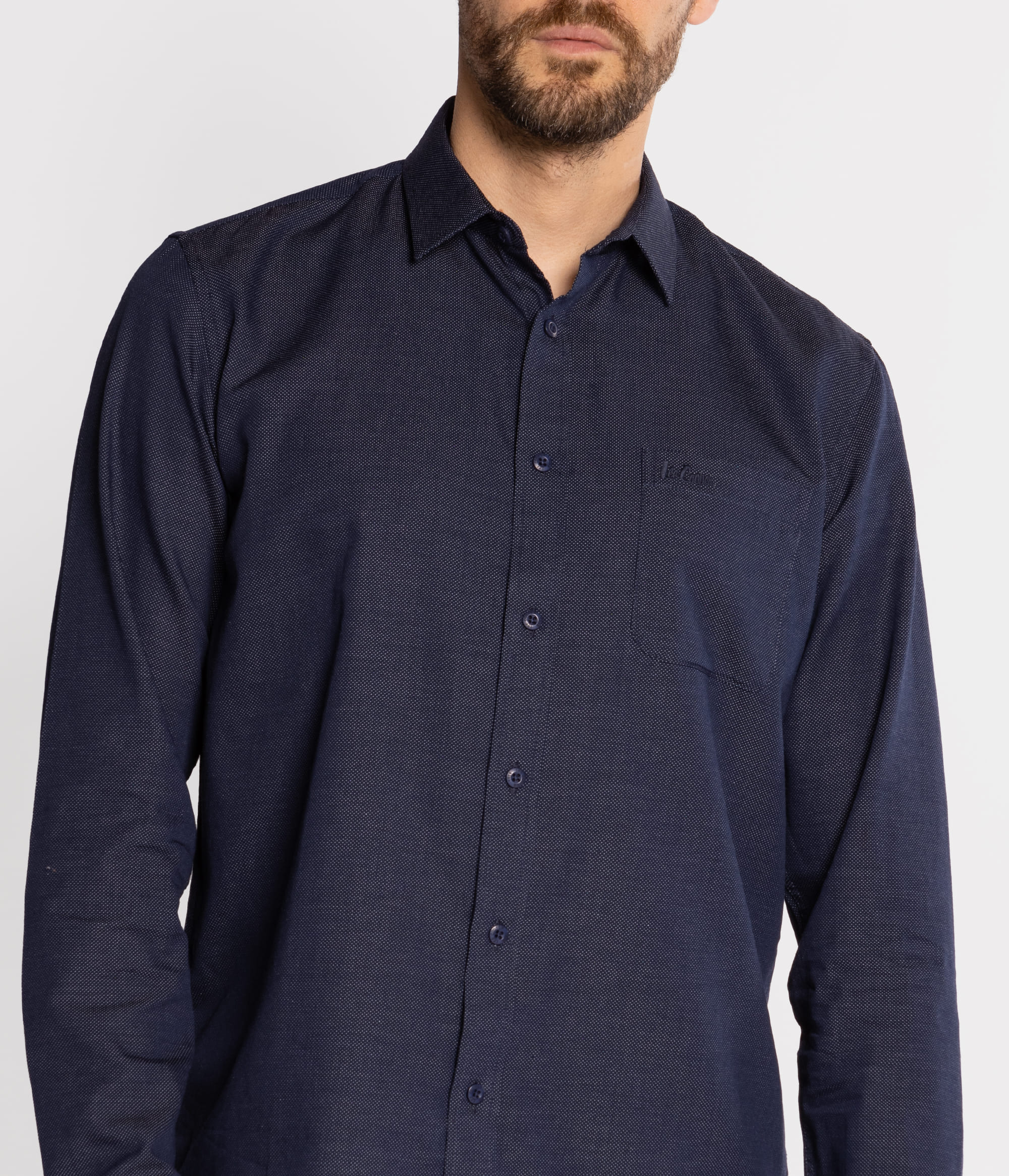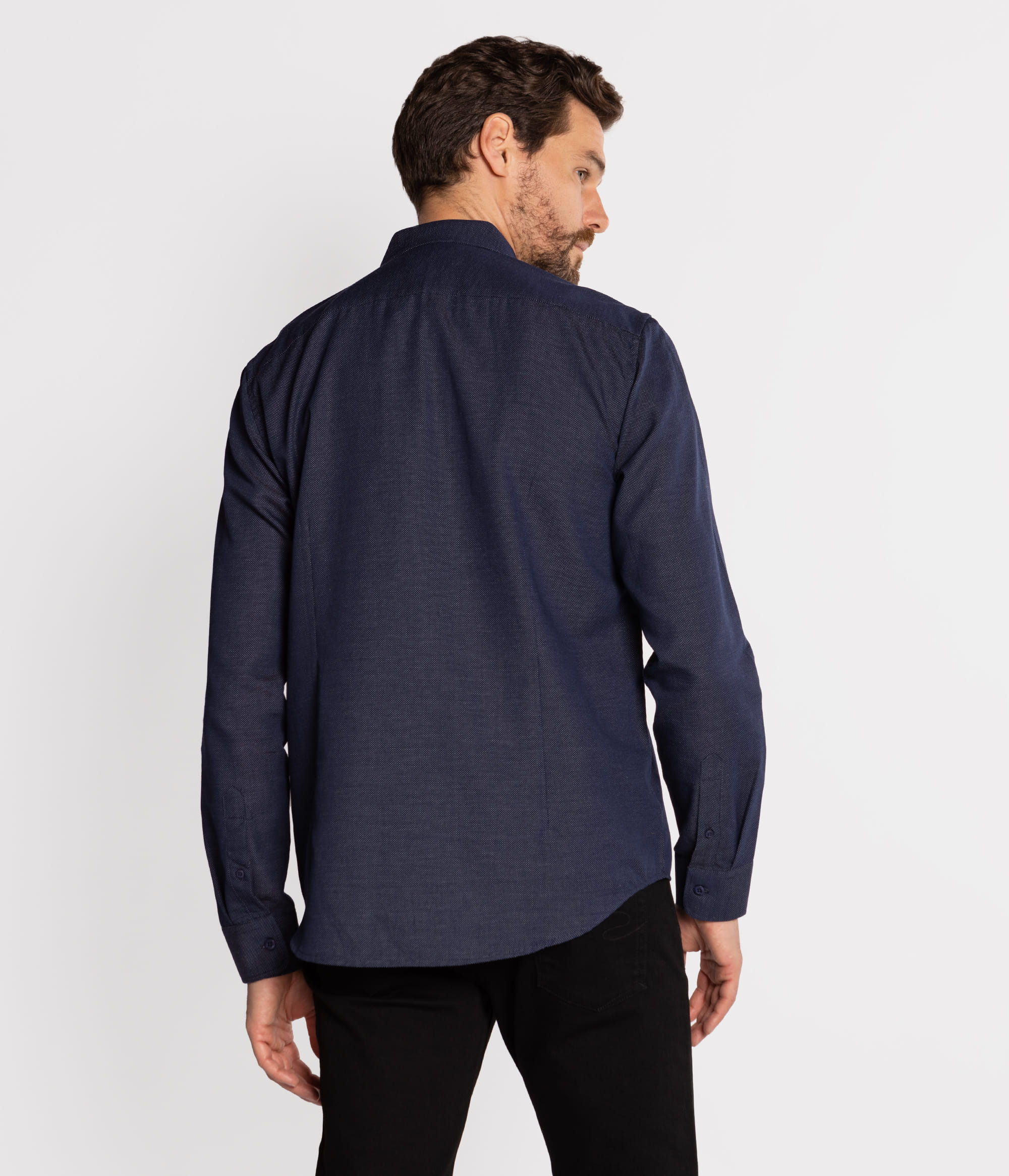 Мужская тёмно-синяя рубашка обычного кроя regular с длинными рукавами, из 100% хлопка с классическим воротником и открытым нагрудным карманом, отделанная небольшой фирменной вышивкой на груди. У нашей модели рост 186 см, размер L.