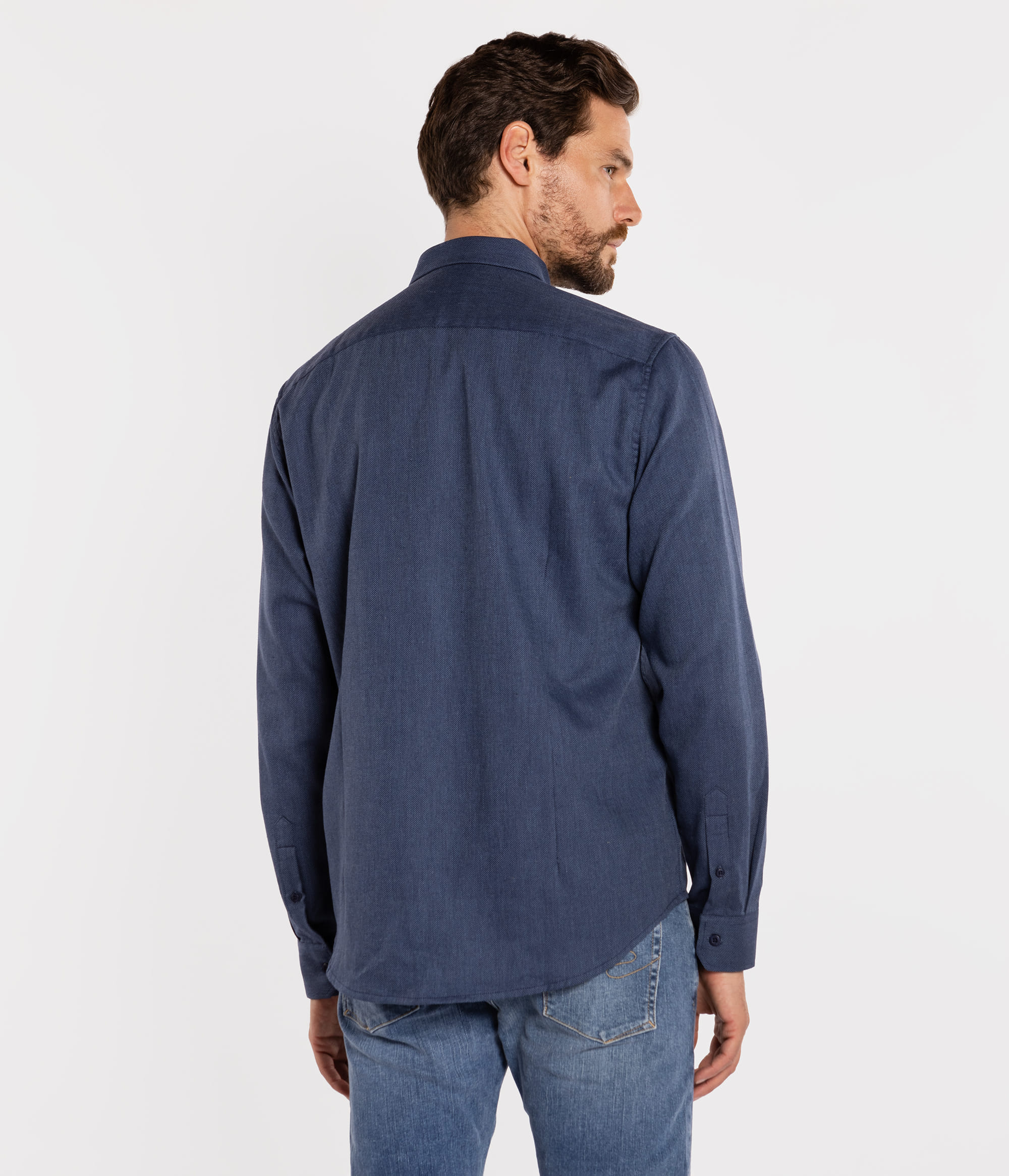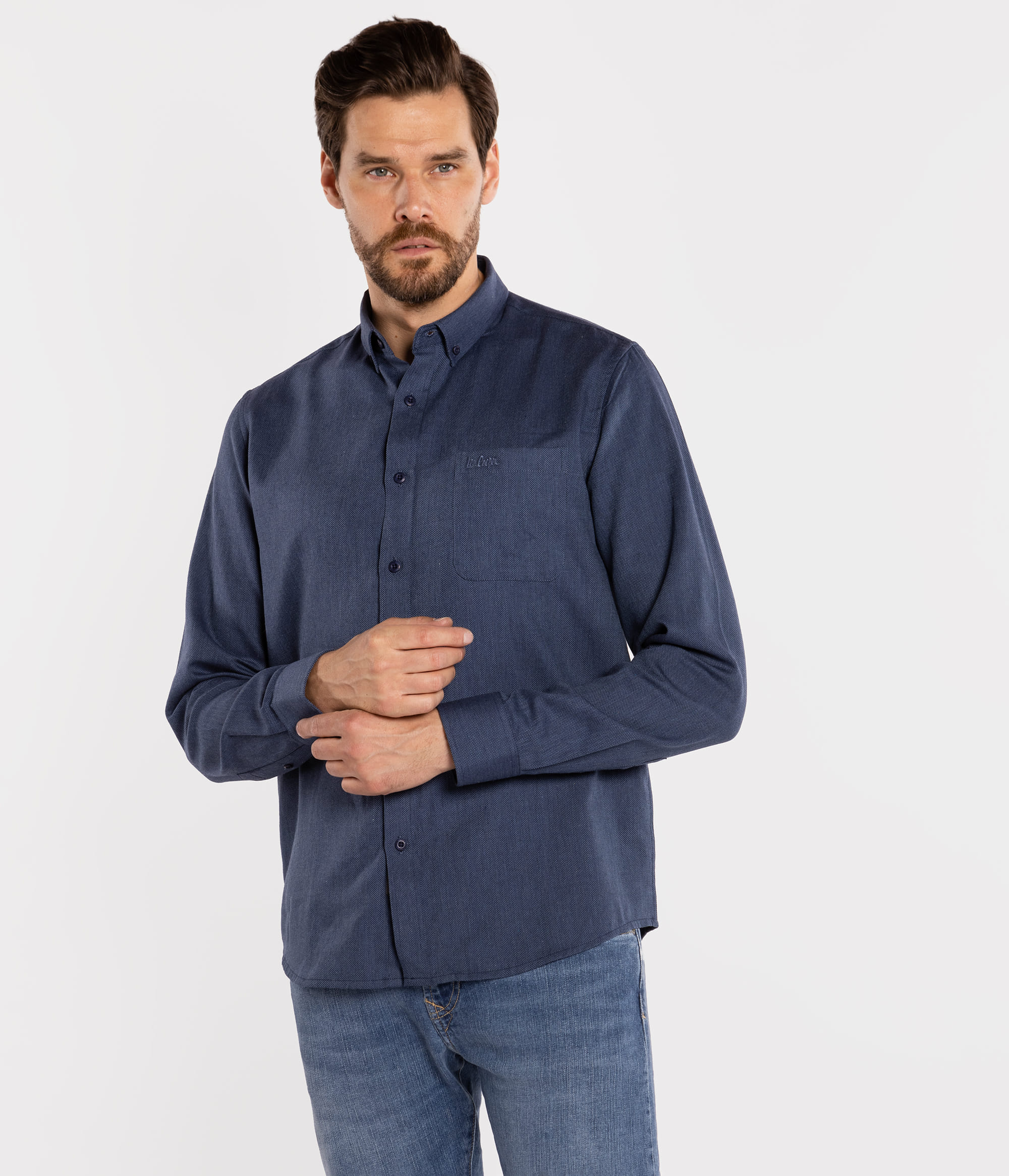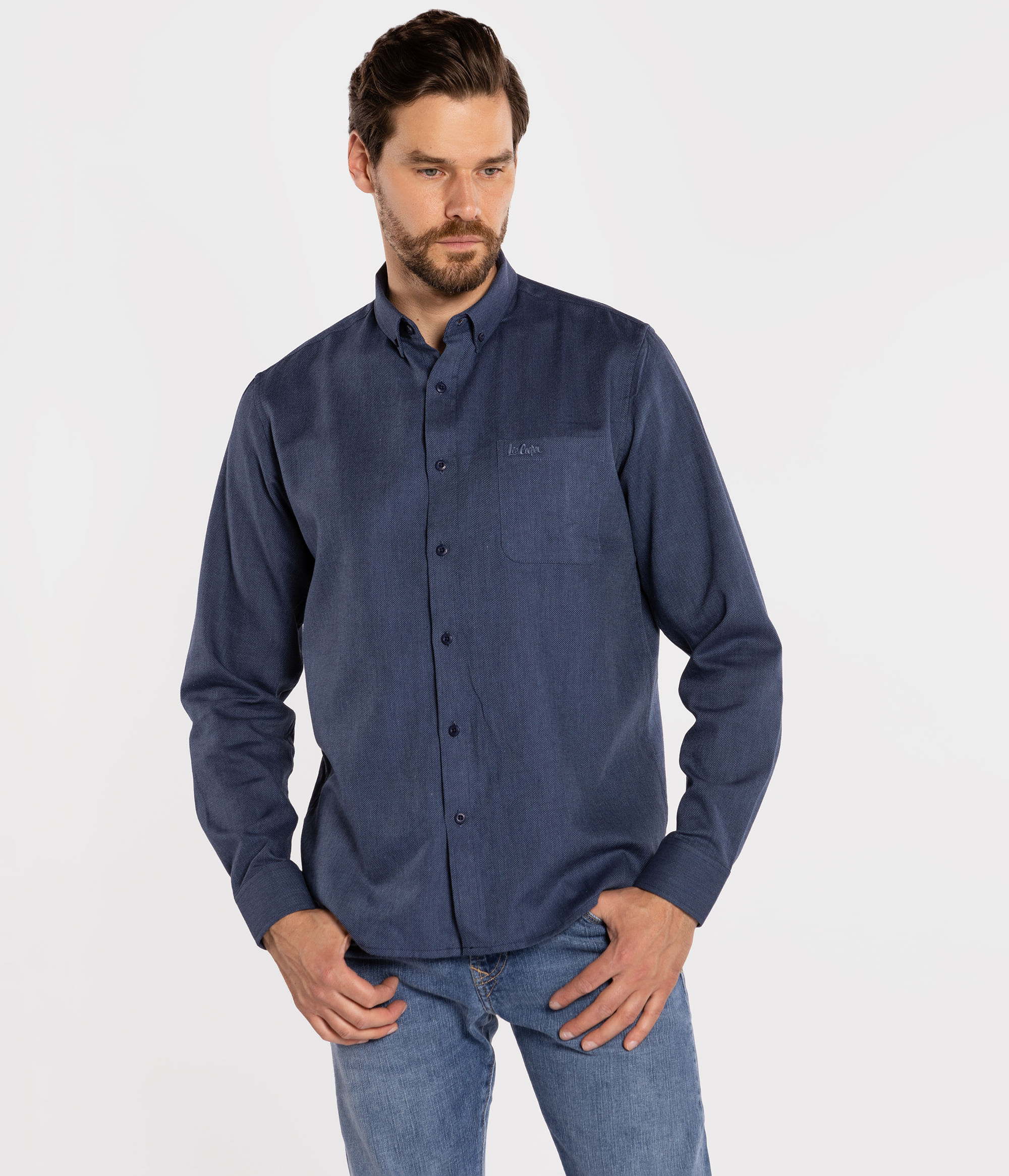 Мужская рубашка синего цвета обычного кроя regular fit, длинные рукава, из 100% хлопка, воротник на пуговицах, открытый карман. У нашей модели рост 186 см., размер L.