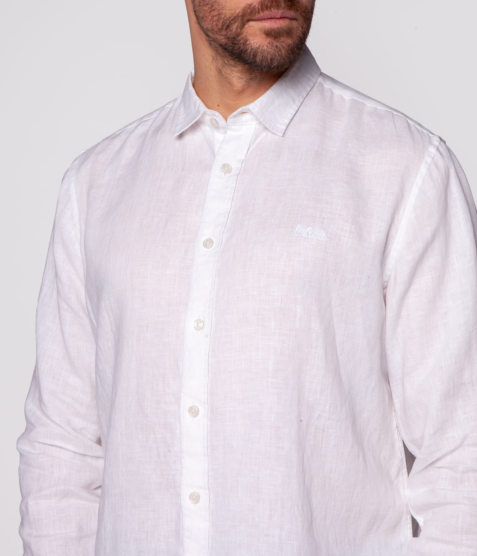 Мужская льняная рубашка длинный рукав, прямого кроя REGULAR fit из 100% льна. Классический воротник, застёжка на пуговицы, спереди отделана вышивкой Lee Cooper, без карманов. На фото представлена модель ростом 186 см и носит размер L.
