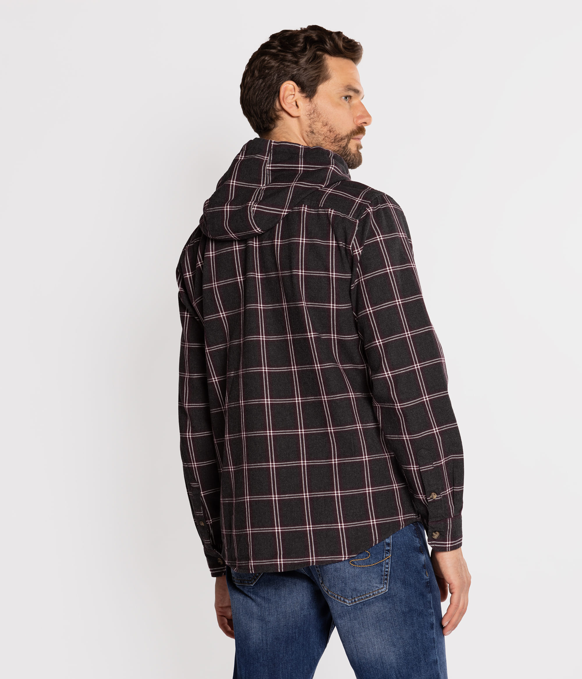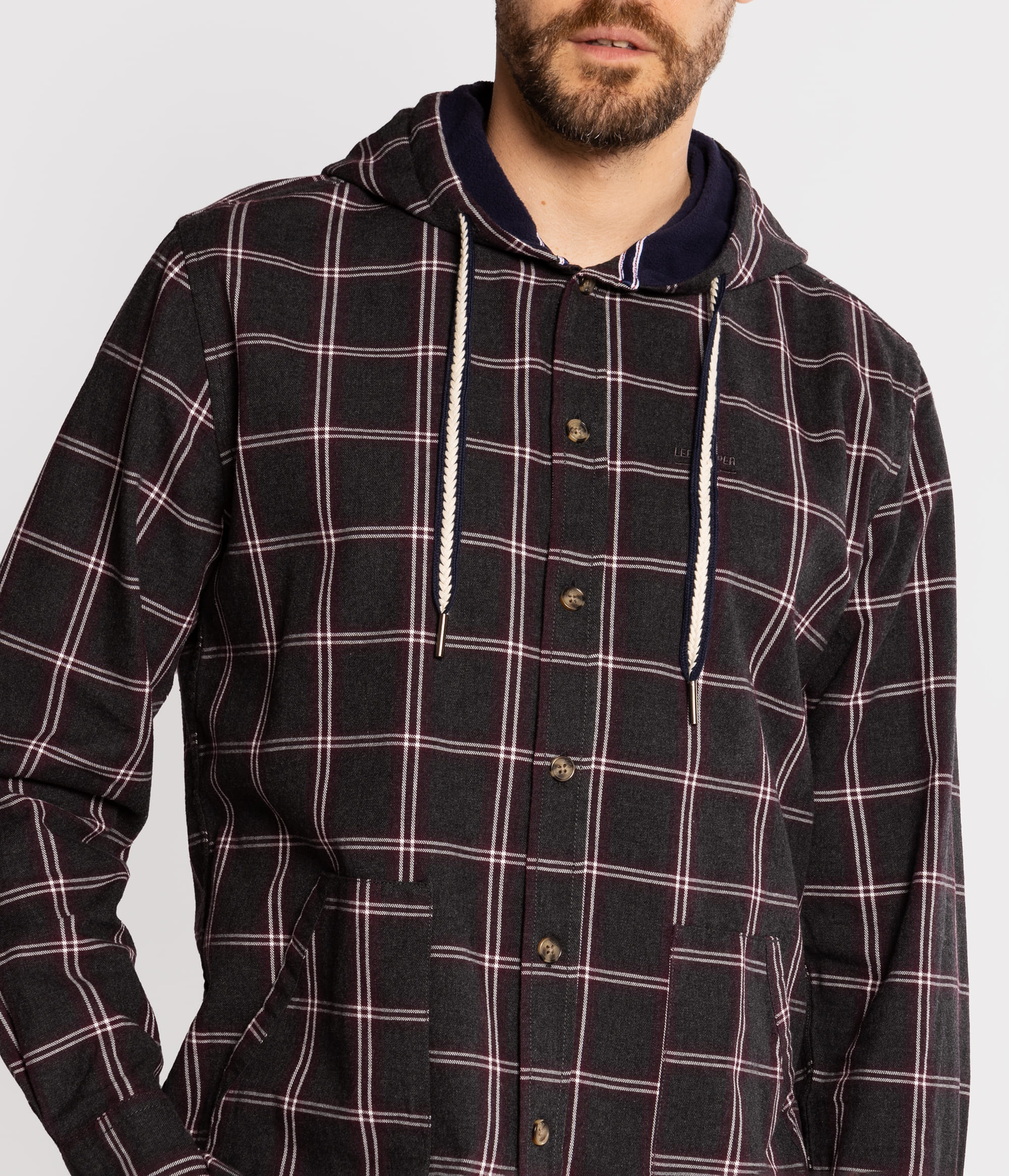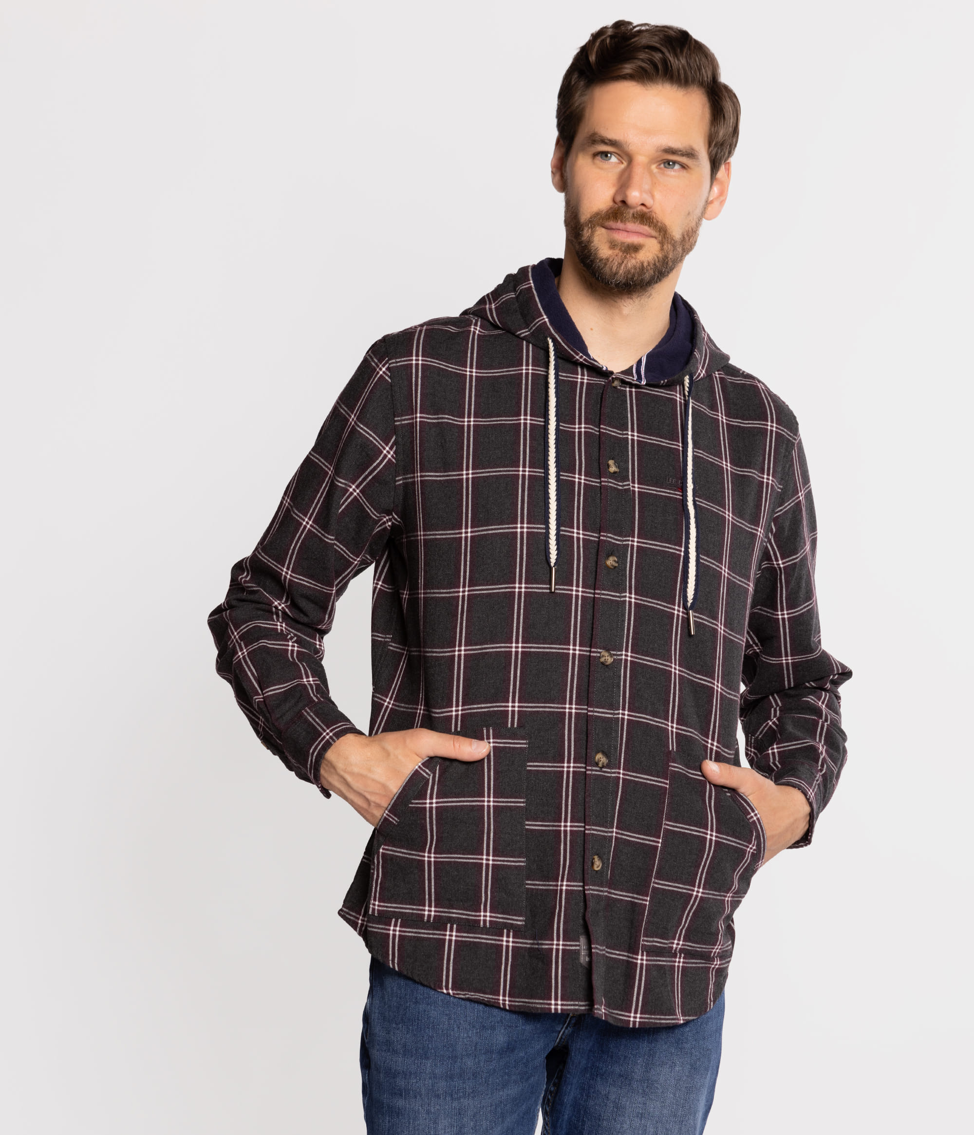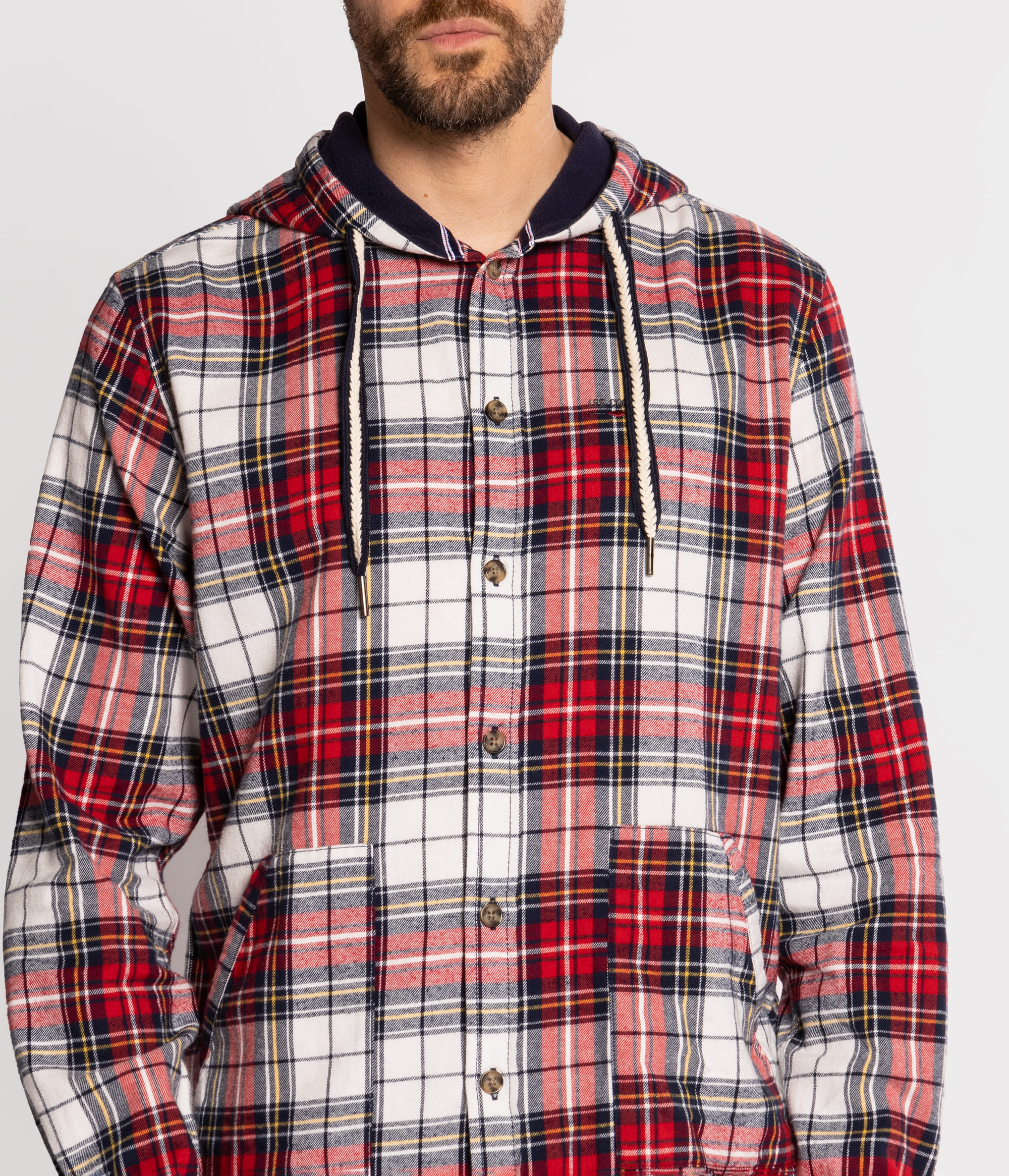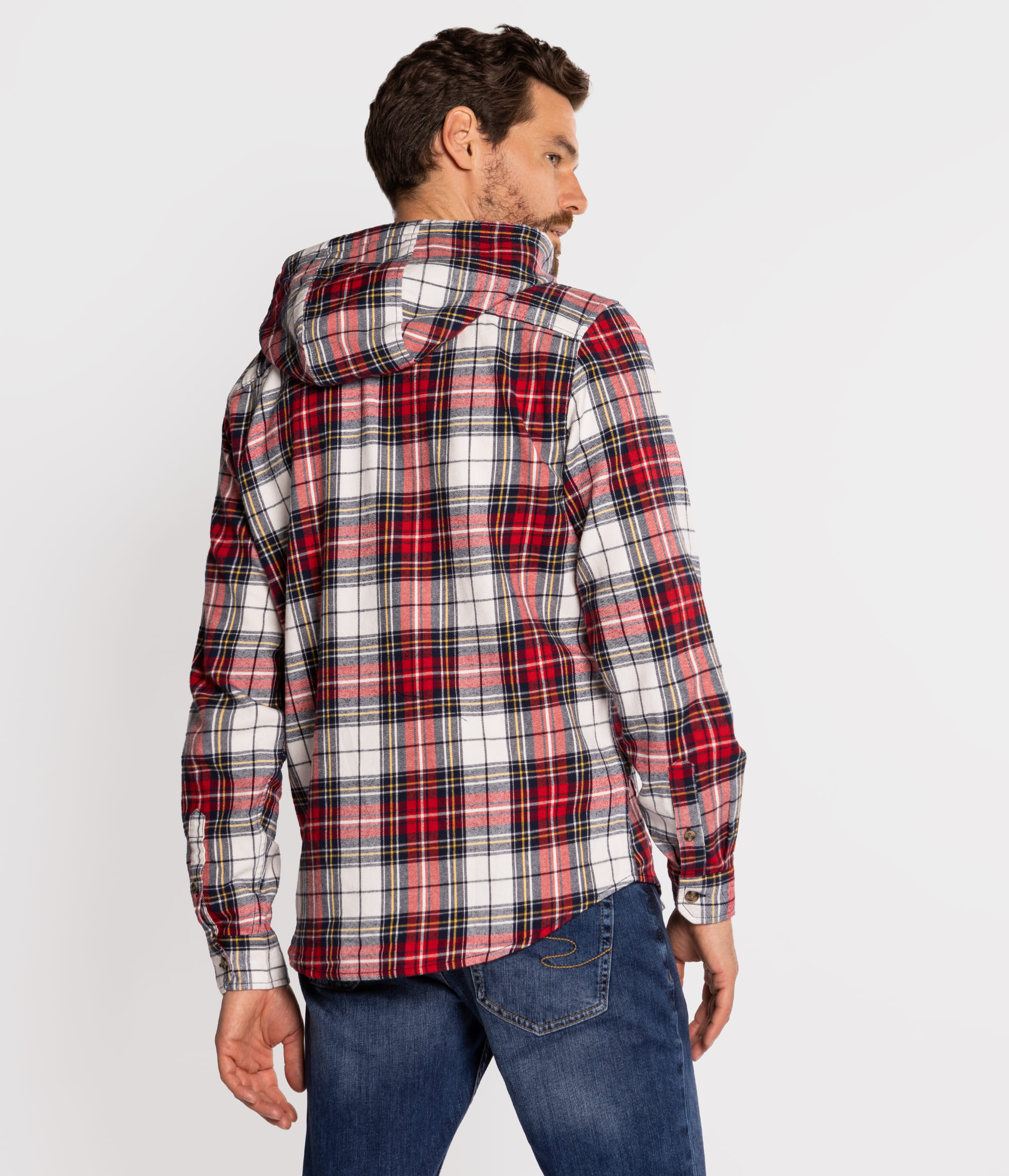Мужская клетчатая рубашка с капюшоном обычного кроя (regular fit), длинный рукав. Изготовлена из 100% хлопка. У нашей модели рост 186 см. и размер L. Два цвета на выбор: red или grey.