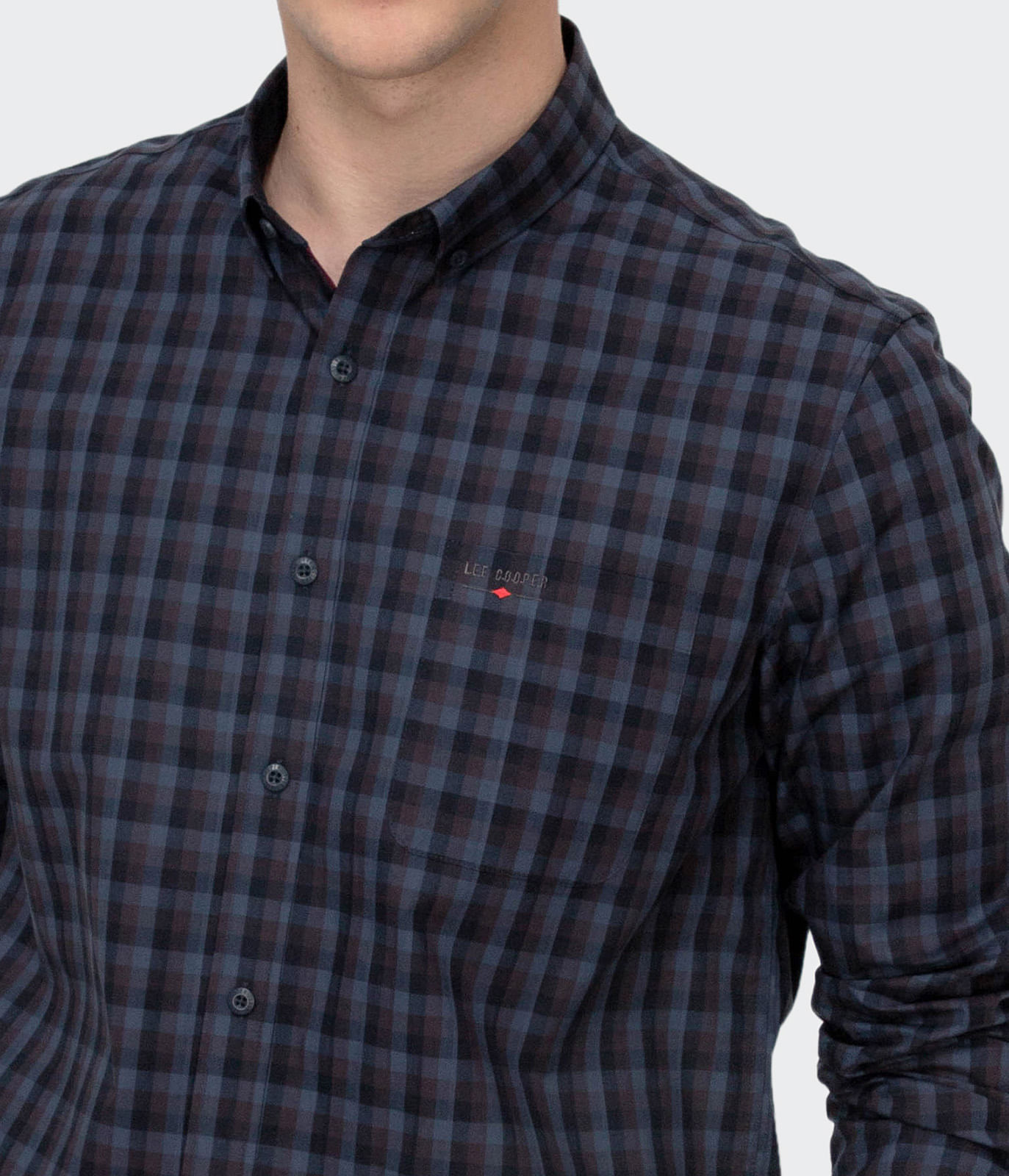 Мужская рубашка с длинными рукавами обычного кроя (regular fit) из хлопчатобумажной ткани с модным клетчатым рисунком. Узкий воротник на пуговицах. Застёжка на пуговицы спереди. Вышитый логотип Lee Cooper на переднем кармане.
