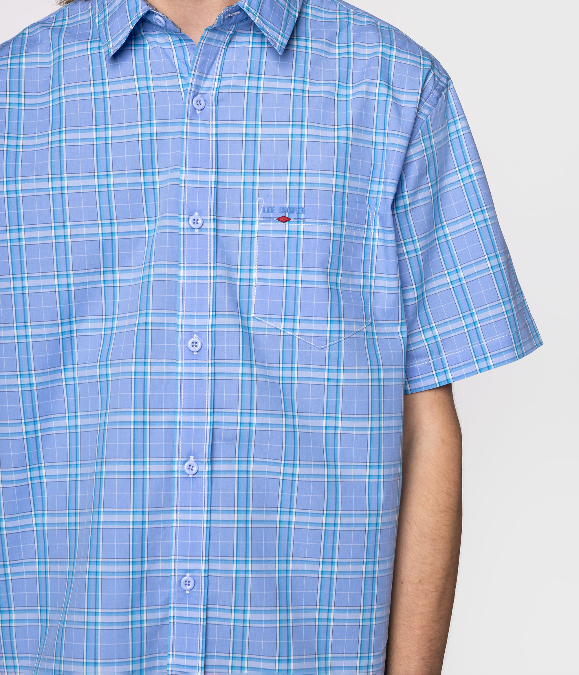 Мужская голубая рубашка в клетку с короткими рукавами обычного кроя REGULAR fit, изготовлена из 100% хлопка. У нашей модели на фото рост 186 см., размер L.