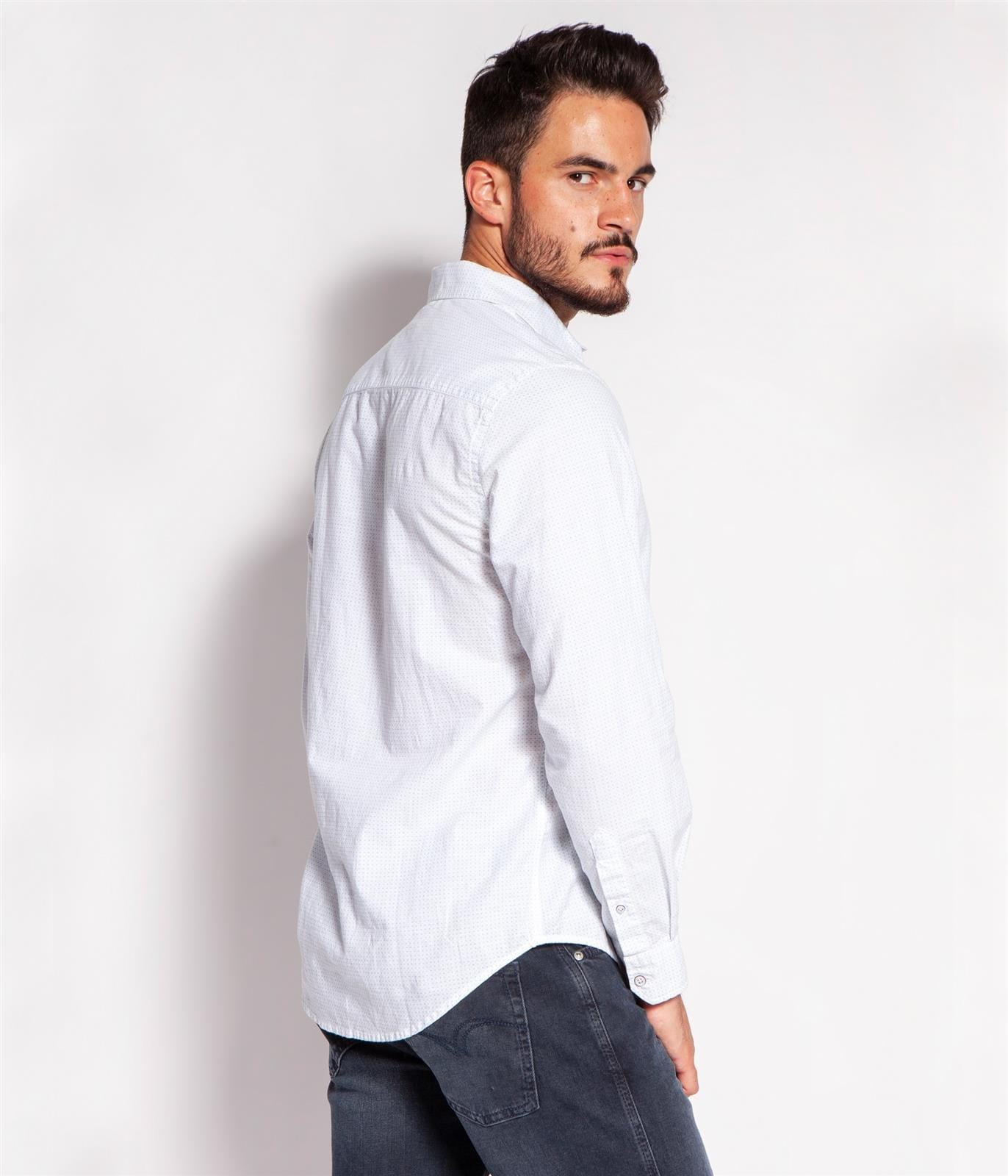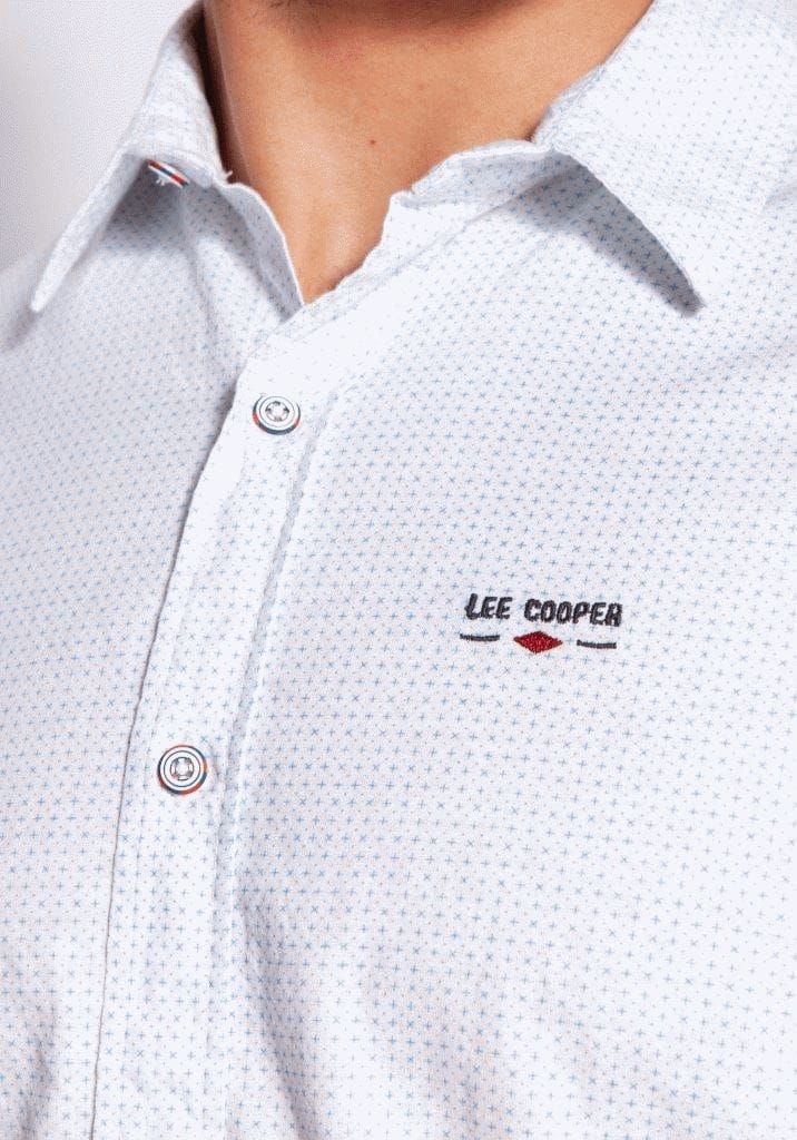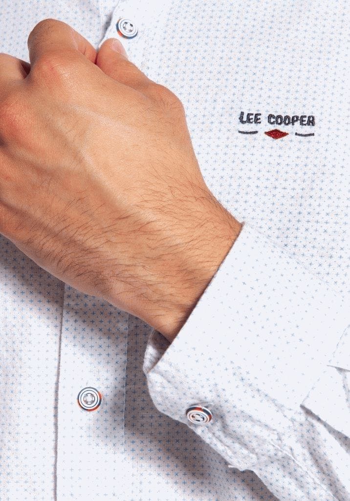 Мужская рубашка приталенного кроя (slim fit) с короткими рукавами с мелким принтом на всей поверхности. Застёжка на пуговицы спереди. Вышитый логотип Lee Cooper на переднем левом нагрудном кармане.