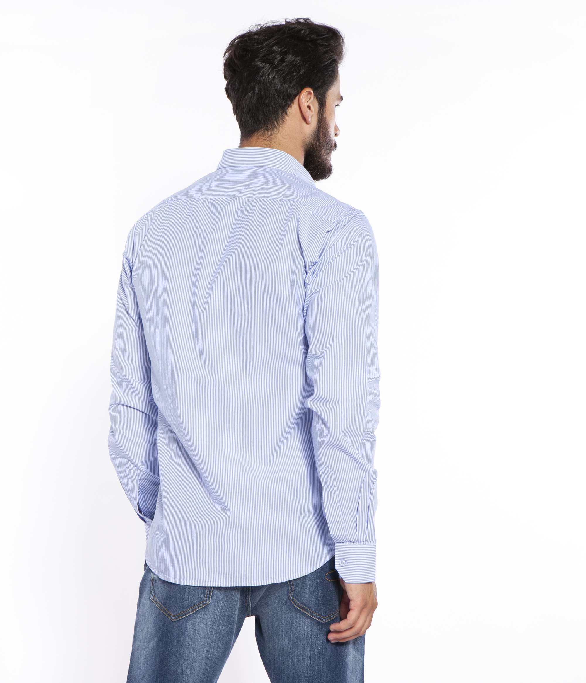 Мужская голубая рубашка с длинным рукавом приталенная slim fit из хлопковой ткани в мелкую полоску. Классический воротник. Застёжка - пуговицы. Изображение логотипа бренда Lee Cooper на нагрудном кармане.