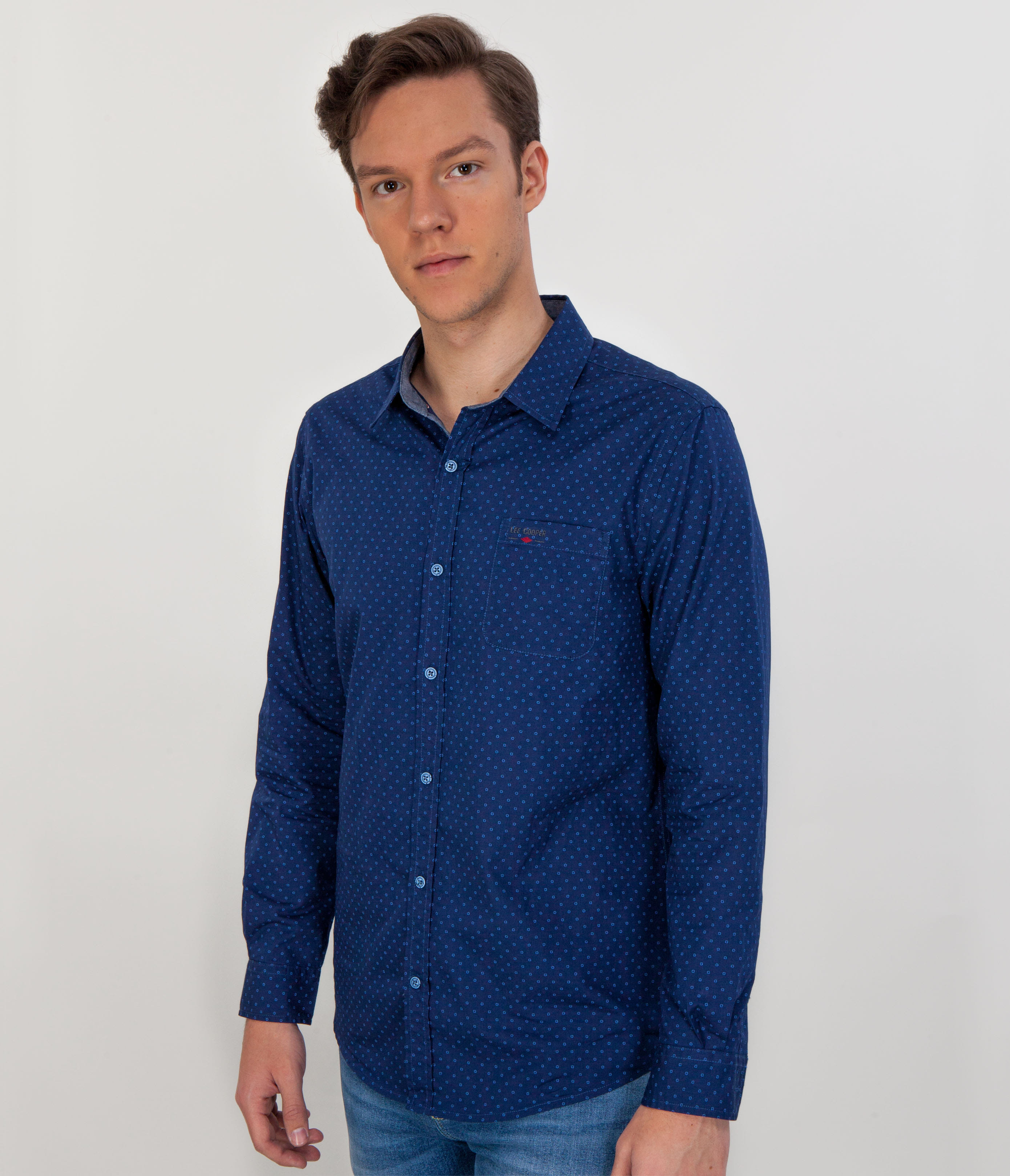 Мужская хлопковая рубашка с длинными рукавами, REGULAR fit, тёмно-синего цвета с мелким принтом. Вышитый логотип Lee Cooper на переднем левом нагрудном кармане. Если у вас крупное или мускулистое телосложение, Вам подойдёт эта модель. Она прекрасно подходит для делового стиля, так как её с лёгкостью можно заправить в джинсы, брюки, а поверх рубашки надеть пиджак. Этот цвет делает её универсальной, под любое событие в Вашей жизни.