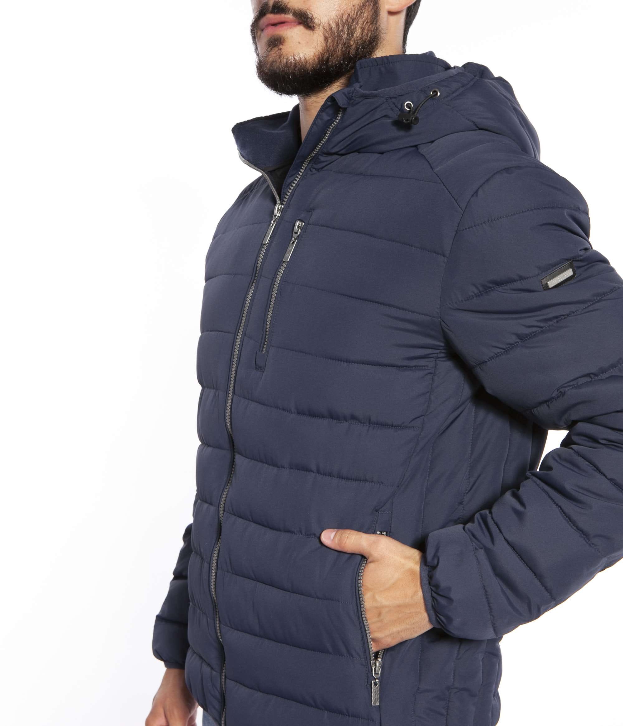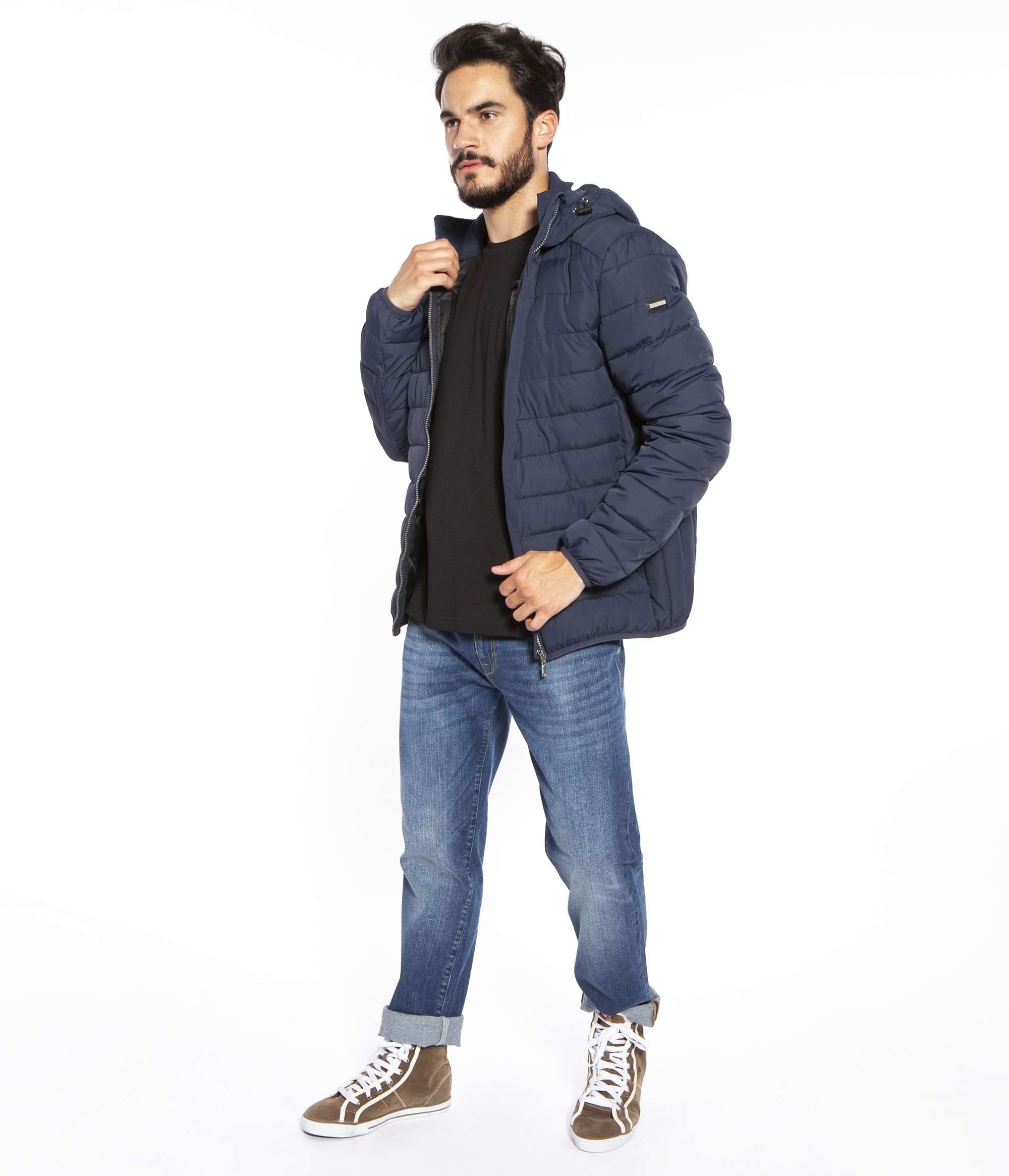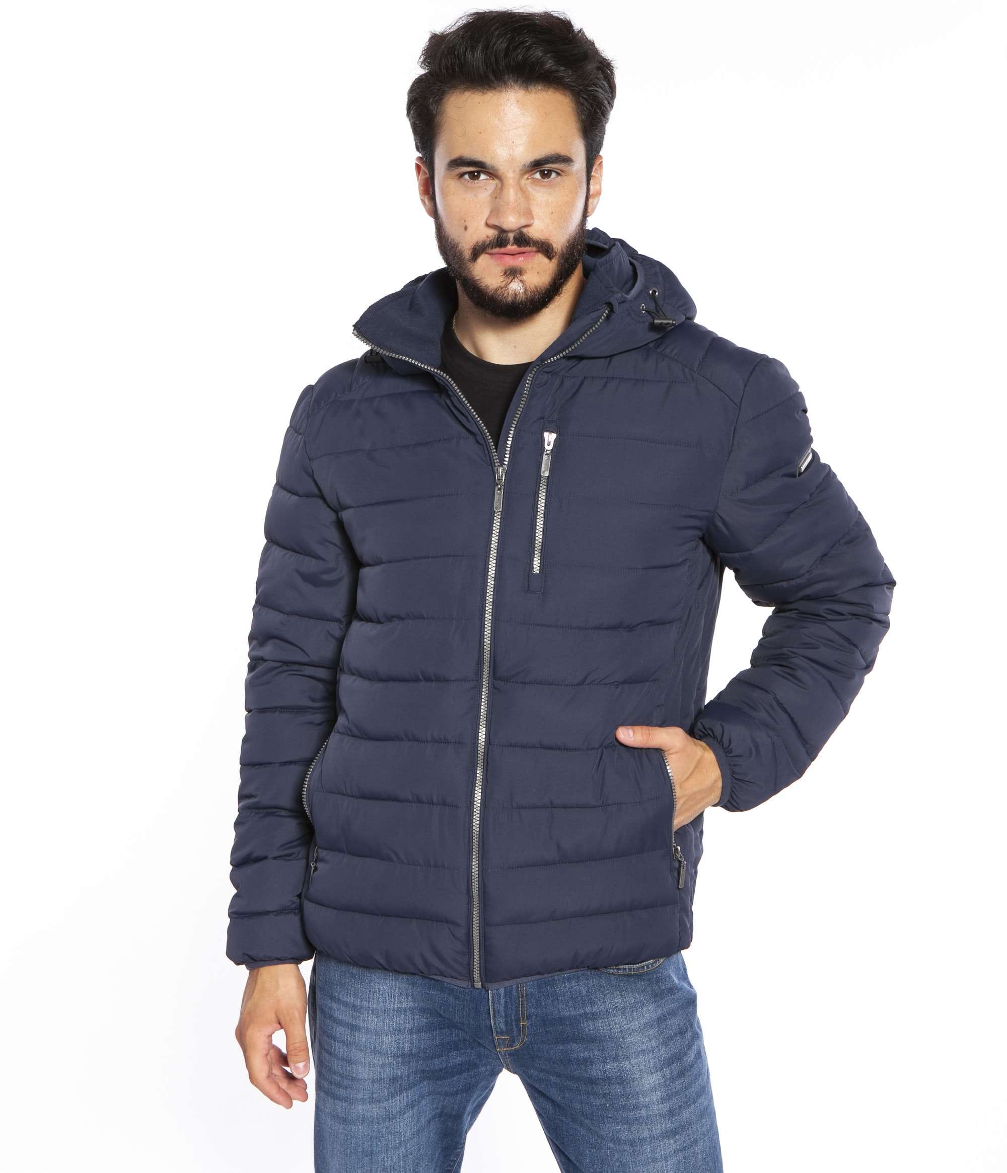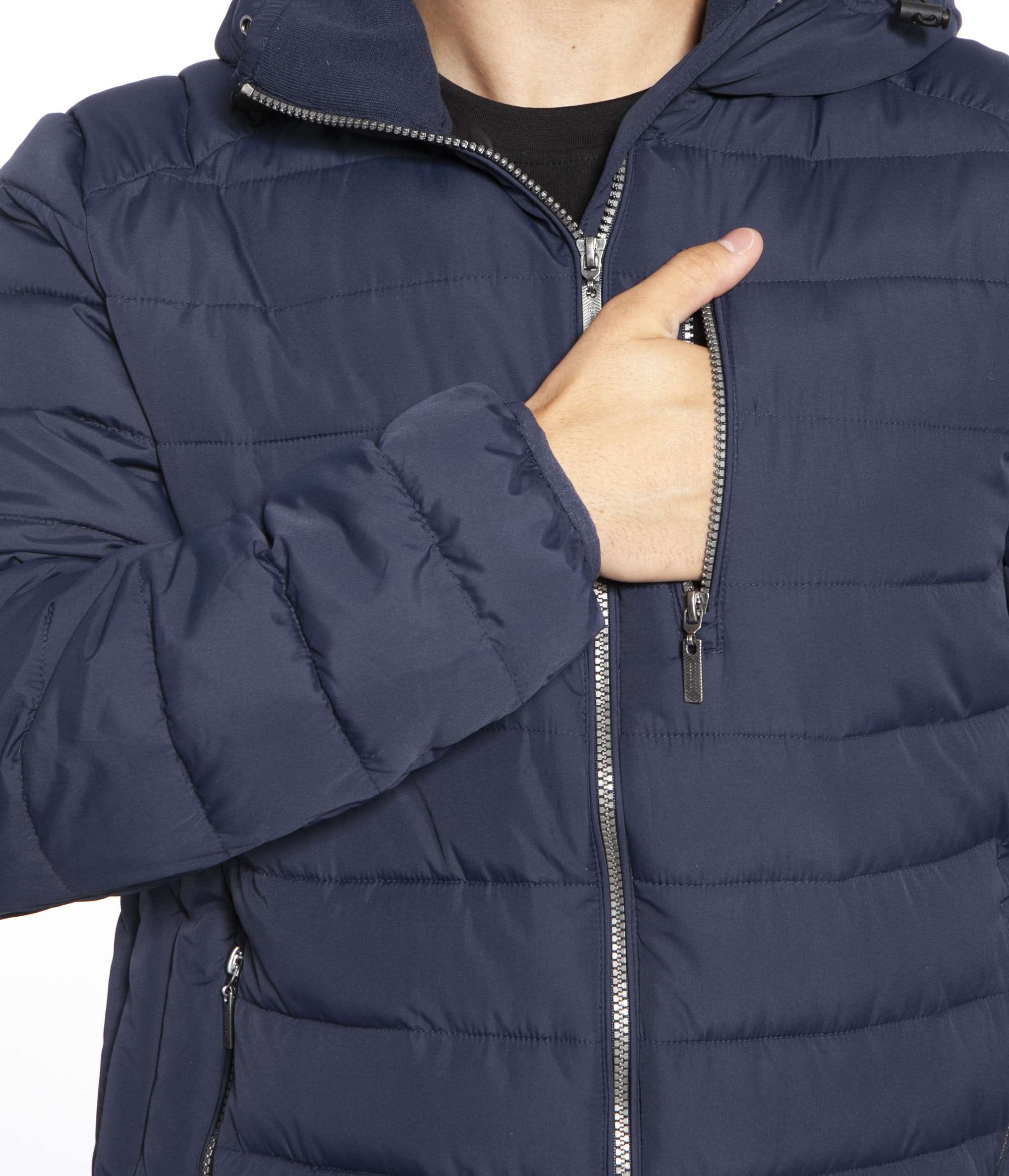 Стёганая утеплённая мужская тёмно-синяя куртка с регулируемым несъёмным капюшоном. Застёгивается на молнию. Три внешних кармана на молнии (два боковых и один нагрудный).