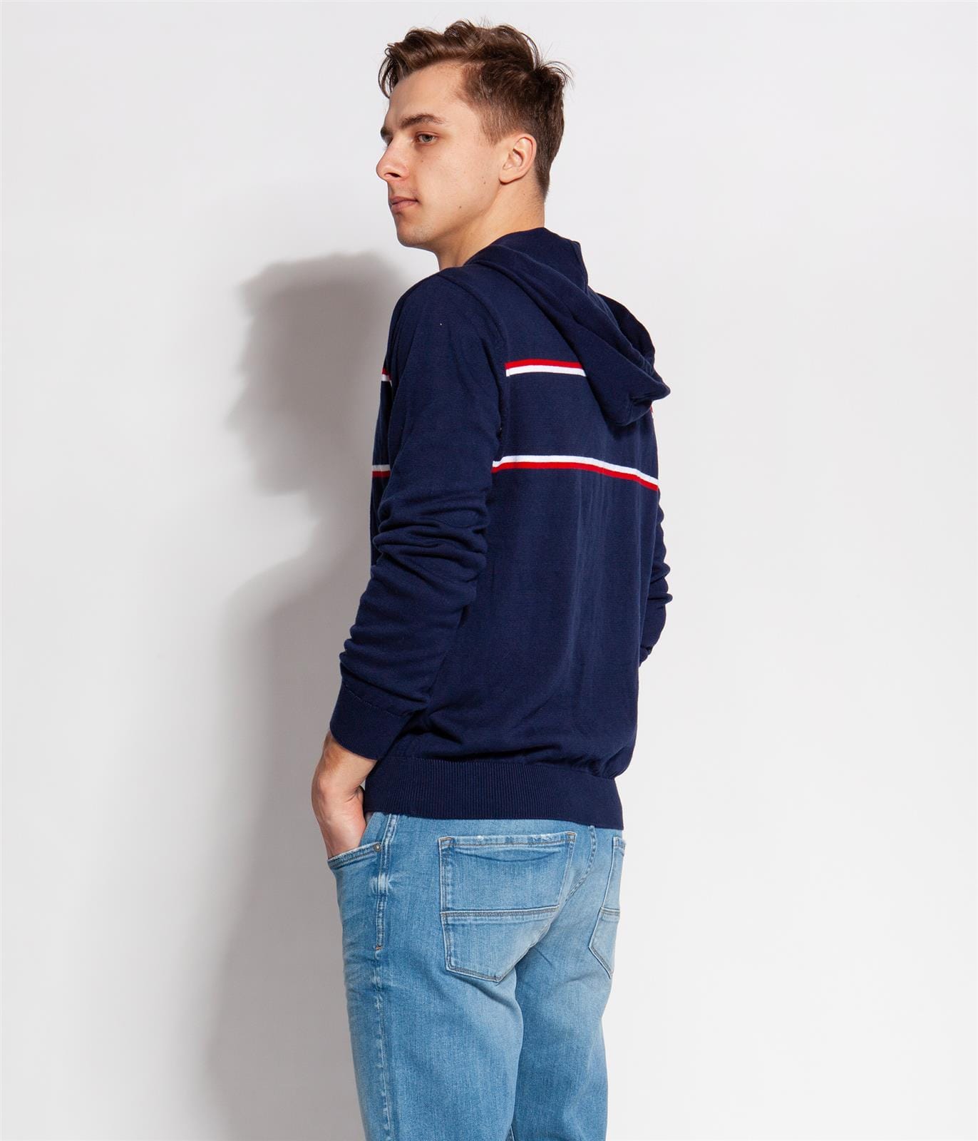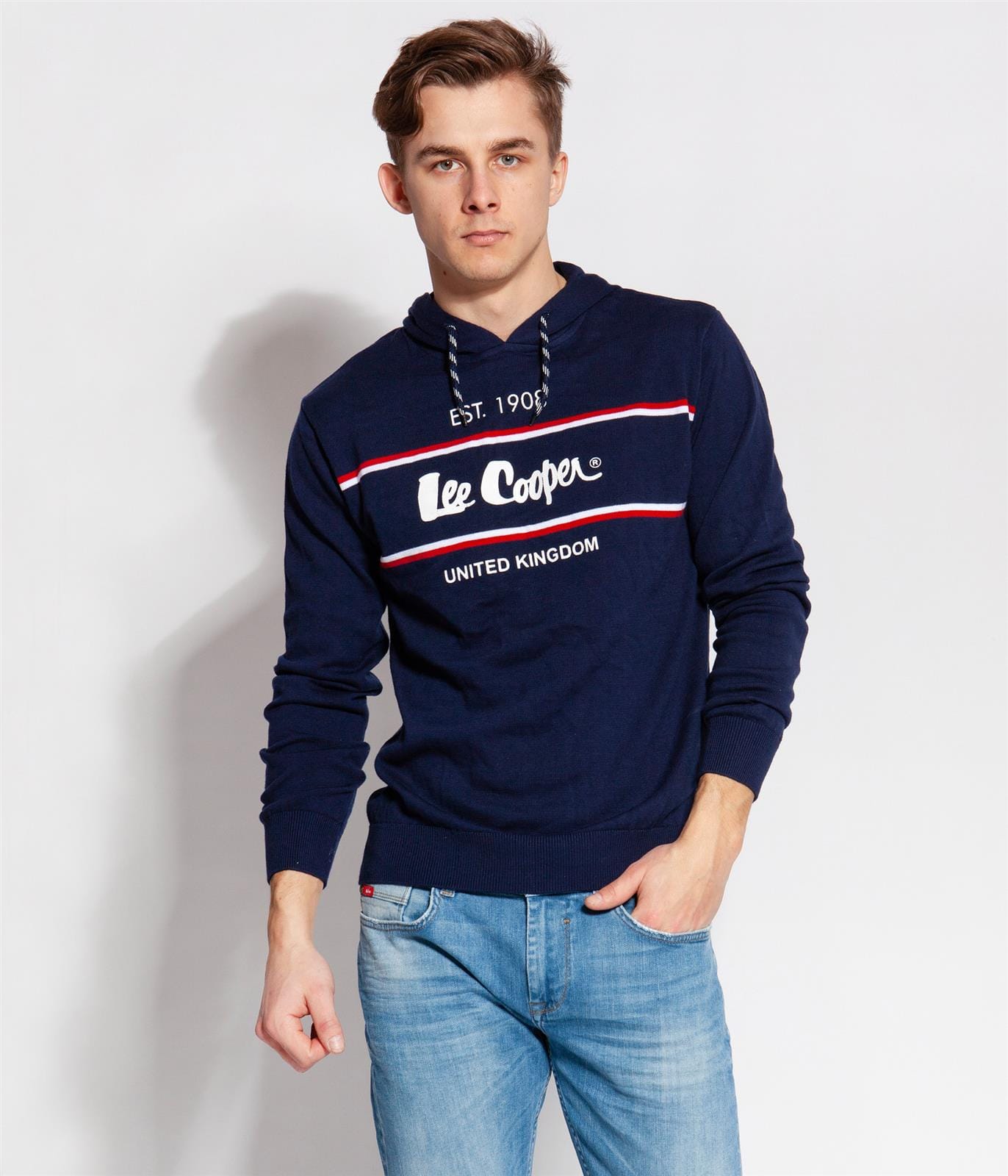 Мужской тёмно-синий свитер с капюшоном и завязками. Классический крой из хлопковой ткани с крупным логотипом Lee Cooper спереди. Рукава и низ в рубчик.