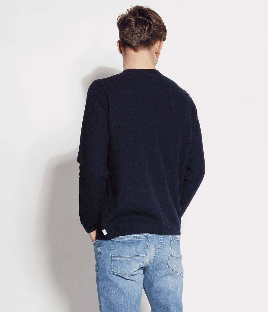 Мужской тёмно-синий свитер классического стандартного кроя с полукруглым вырезом из 100% хлопка, обеспечивающий максимальный комфорт. Длинные рукава, узкие трикотажные края.