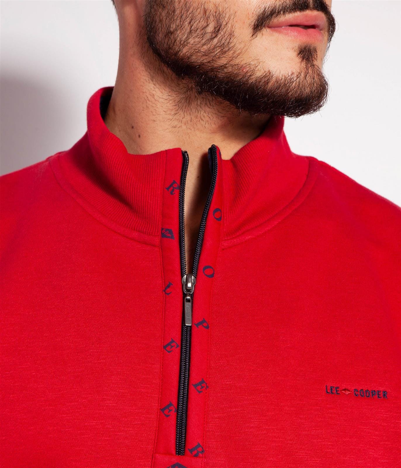 Мужской красный свитшот с застёжкой-молнией на шее, изготовлен из мягкой, приятной на ощупь ткани. Длинные рукава, манжеты и низ в рубчик, логотип Lee Cooper спереди слева.
