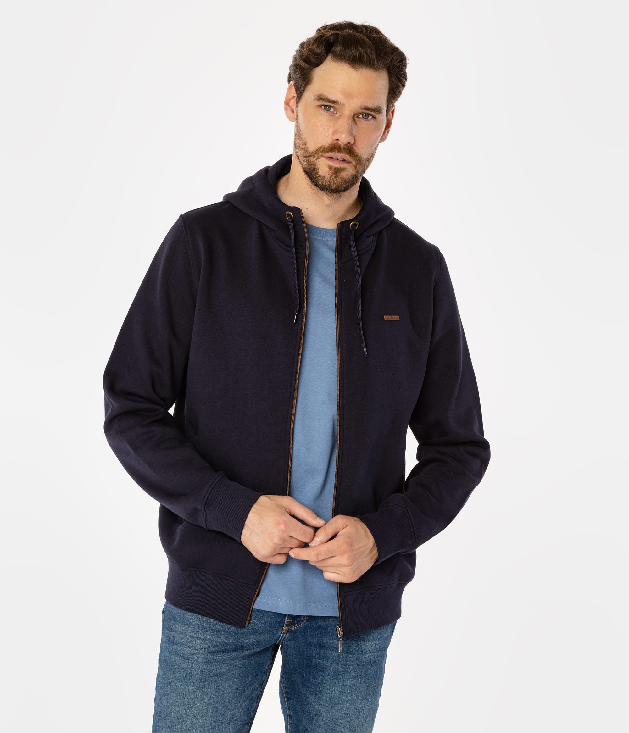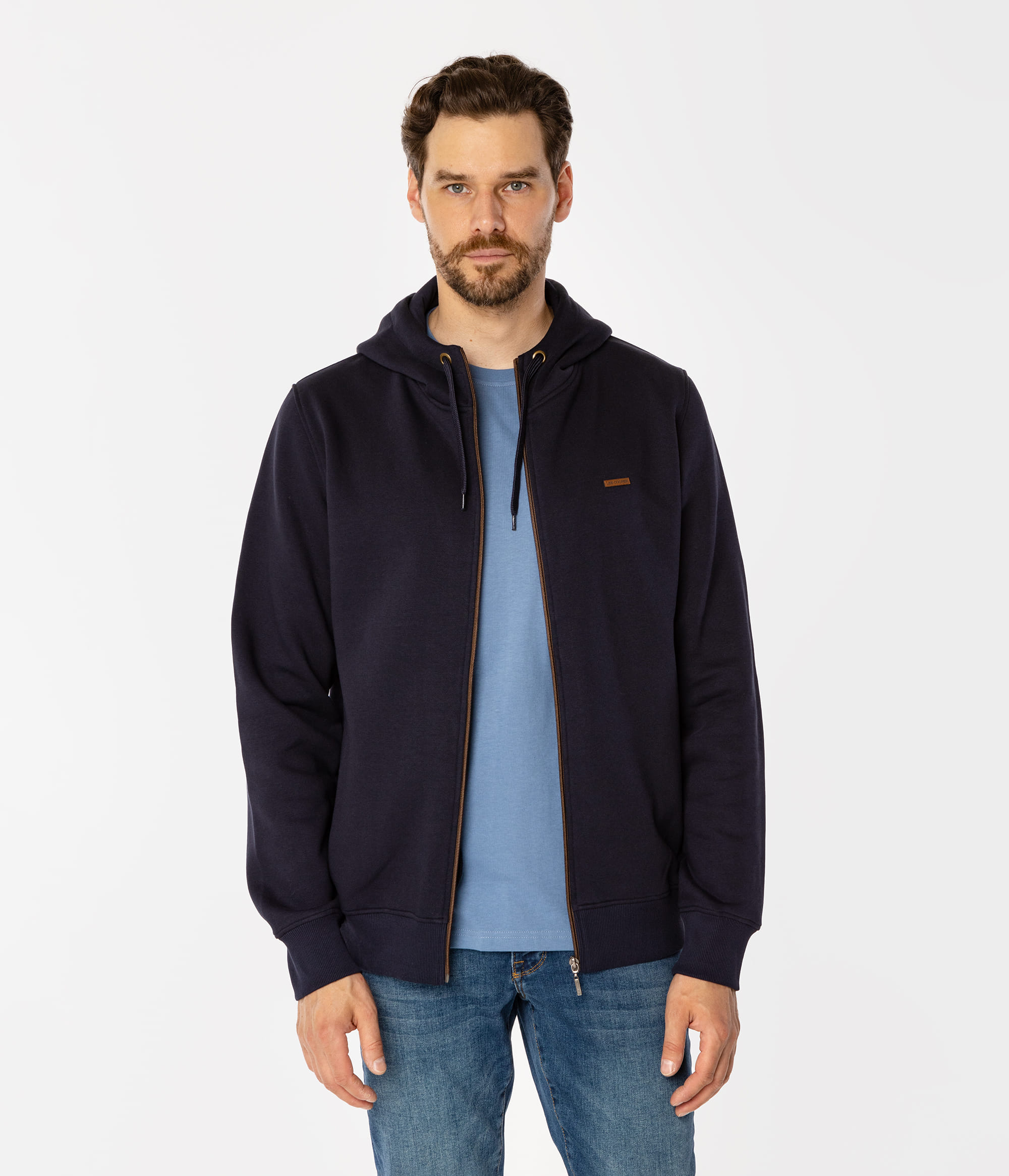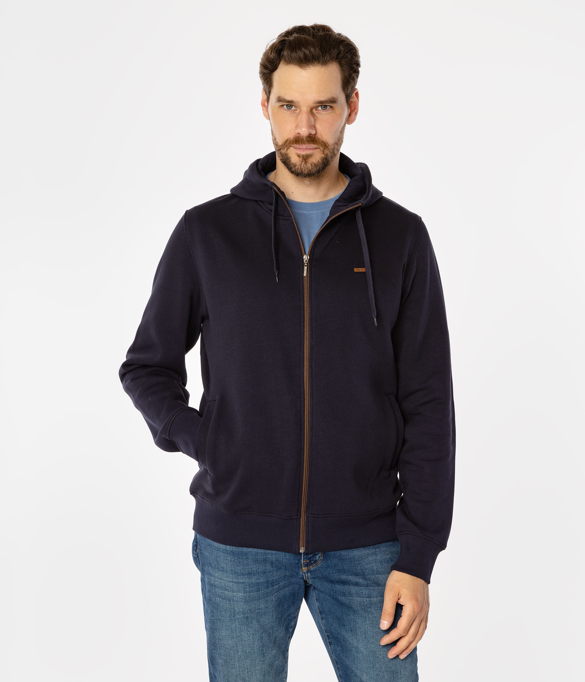 Мужская толстовка синего цвета на молнии с капюшоном. Контрастный цвет возле молнии придаёт толстовке характер. Два боковых кармана, манжеты по краям, застёжка-молния. Дополнена небольшой фирменной нашивкой на груди слева. У нашей модели рост 186 см., размер L.