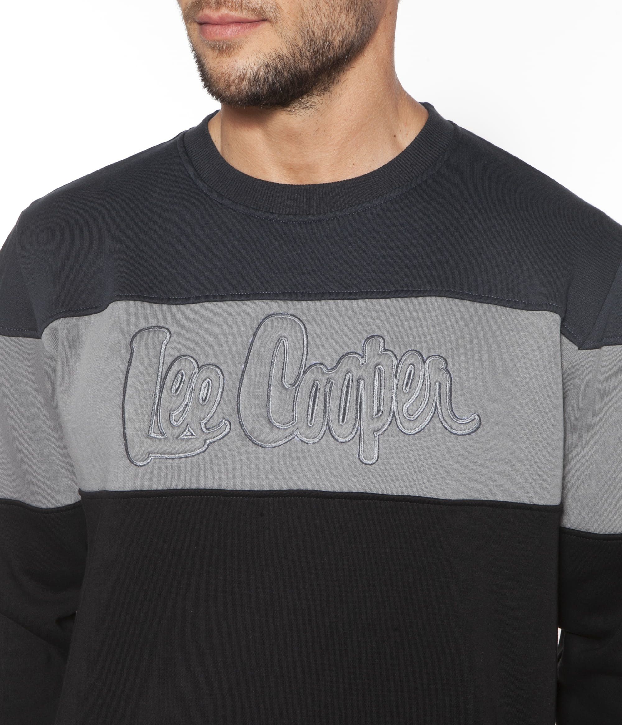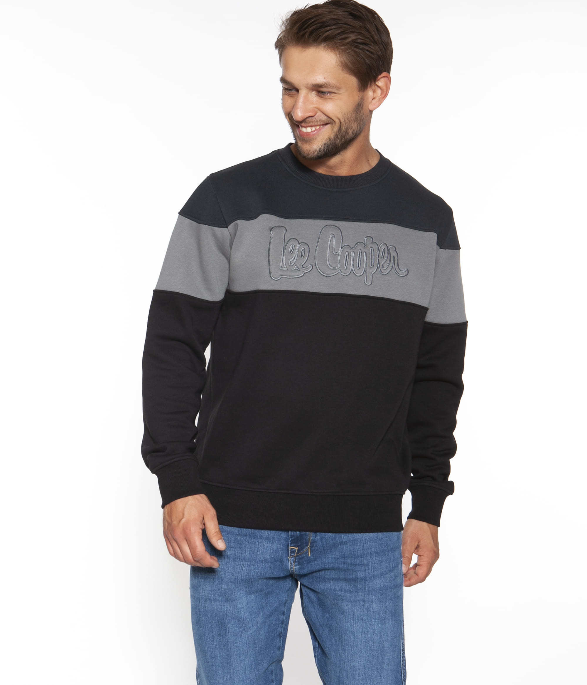 Мужская толстовка в стиле колор-блок с выпуклым логотипом бренда. Круглый вырез горла, резинка по краям.