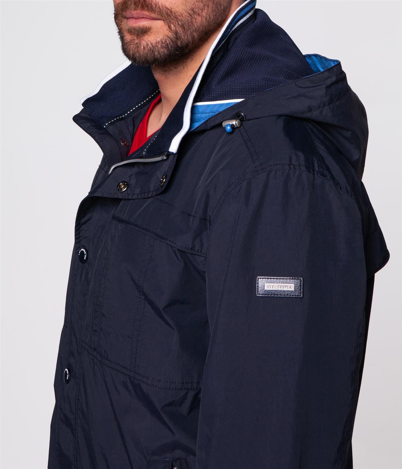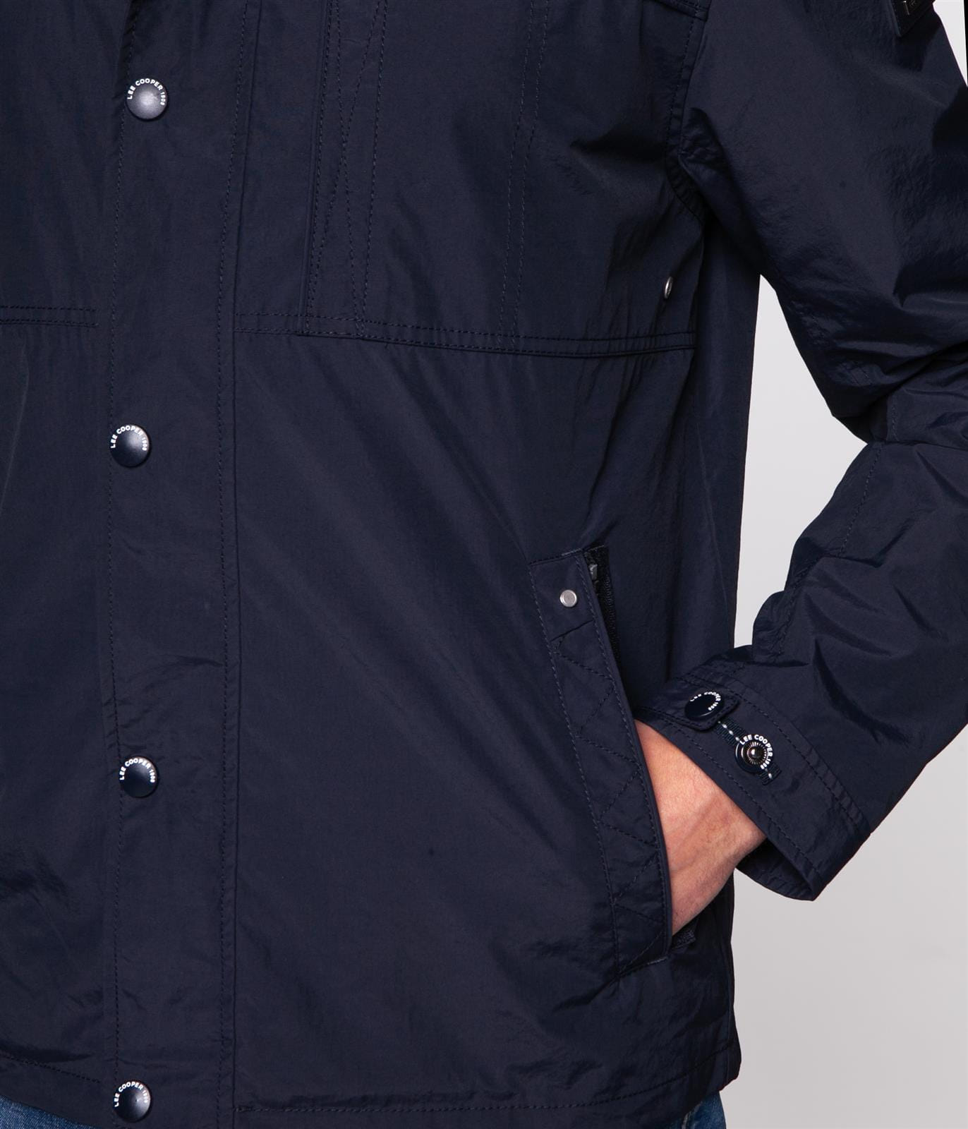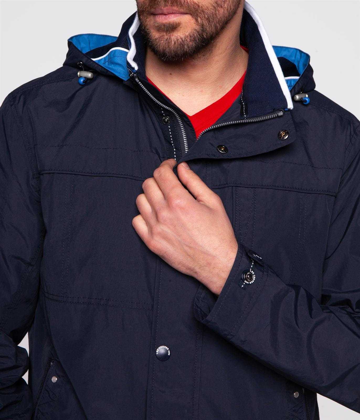 Мужская тёмно-синяя куртка с капюшоном, застёжкой-молнией и кнопками. Регулируемый капюшон, передние карманы для самых необходимых вещей. Регулируемые манжеты на кнопках. Дополнена небольшой нашивкой с фирменным логотипом Lee Cooper на рукаве. Модель на фото ростом 186 см. и носит размер L.